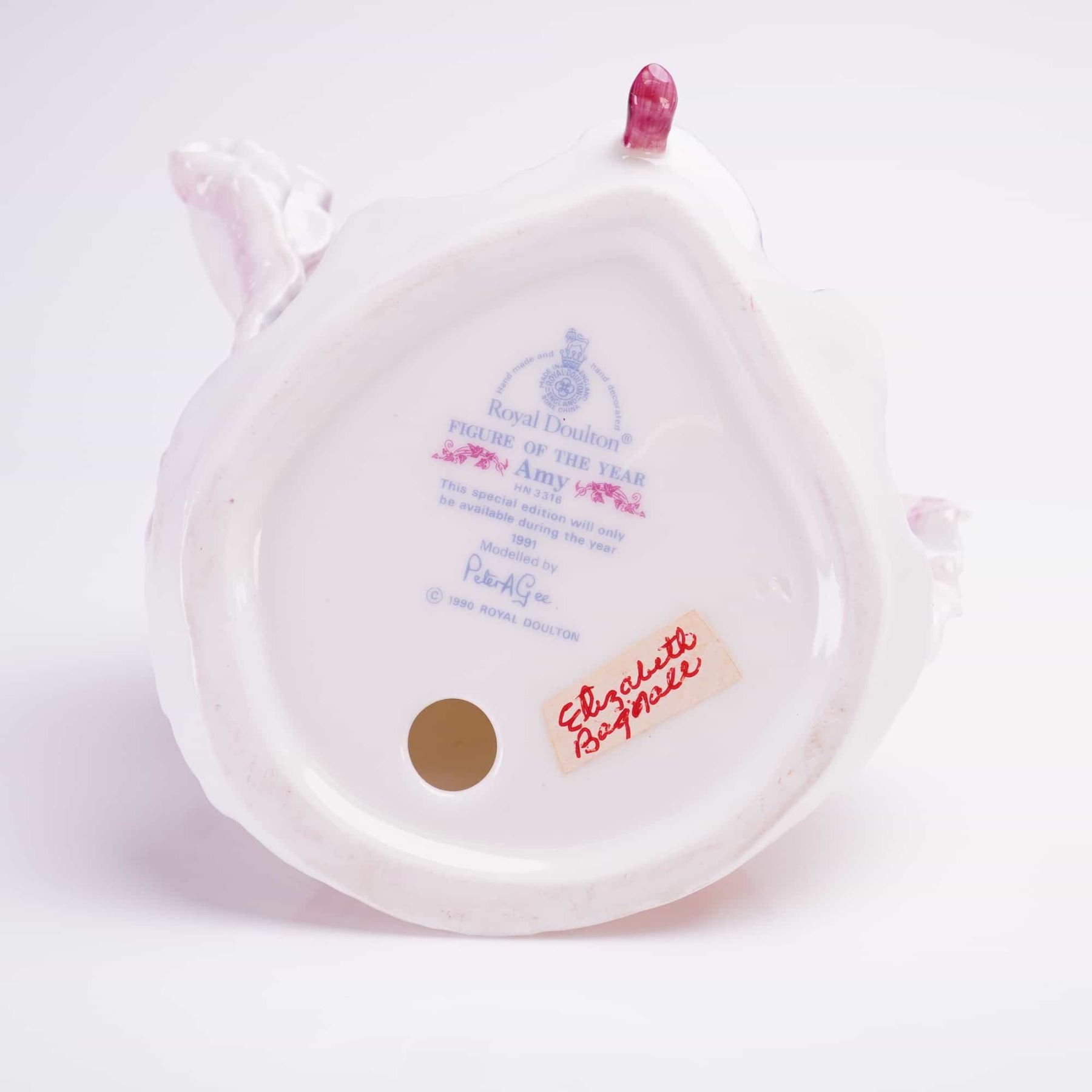 A Royal Doulton bone china figurine titled Amy, model number HN3316, issued as the Figure of the Year for 1991. This hand-made and hand-decorated piece was modeled by Peter A. Gee. The figure is depicted in a full-skirted gown of blue and shaded red with white accents, holding a small fan and lifting her hem. The underside features the official Royal Doulton backstamp, the figure name, and model number. A printed inscription indicates that this special edition was only available during the year 1991. The base also includes the modeled by Peter A. Gee signature and a 1990 copyright date. A handwritten adhesive label is attached to the underside. The figurine retains its original paper hangtag.