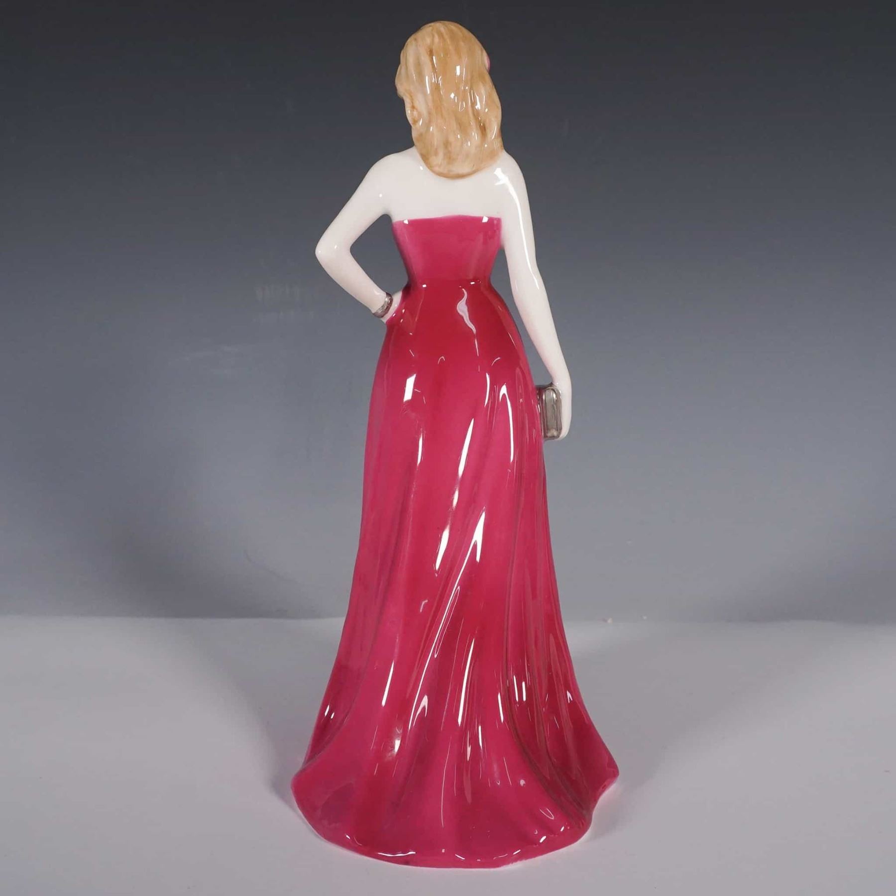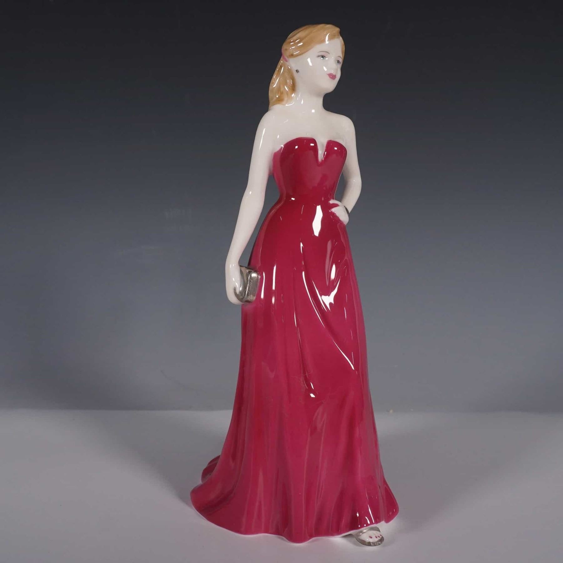 This elegant Royal Doulton figurine, titled Abigail (HN4664), features a graceful young woman in a flowing red gown, holding a silver clutch. Designed by Nada M. Pedley and issued in 2004, this piece is crafted in fine bone china and hand-painted with exquisite detailing. The figurine stands 8.25"H and is accompanied by its original Royal Doulton Classics box, which measures 7"L x 6"W x 10"H. The base bears the Royal Doulton backstamp, ensuring authenticity.