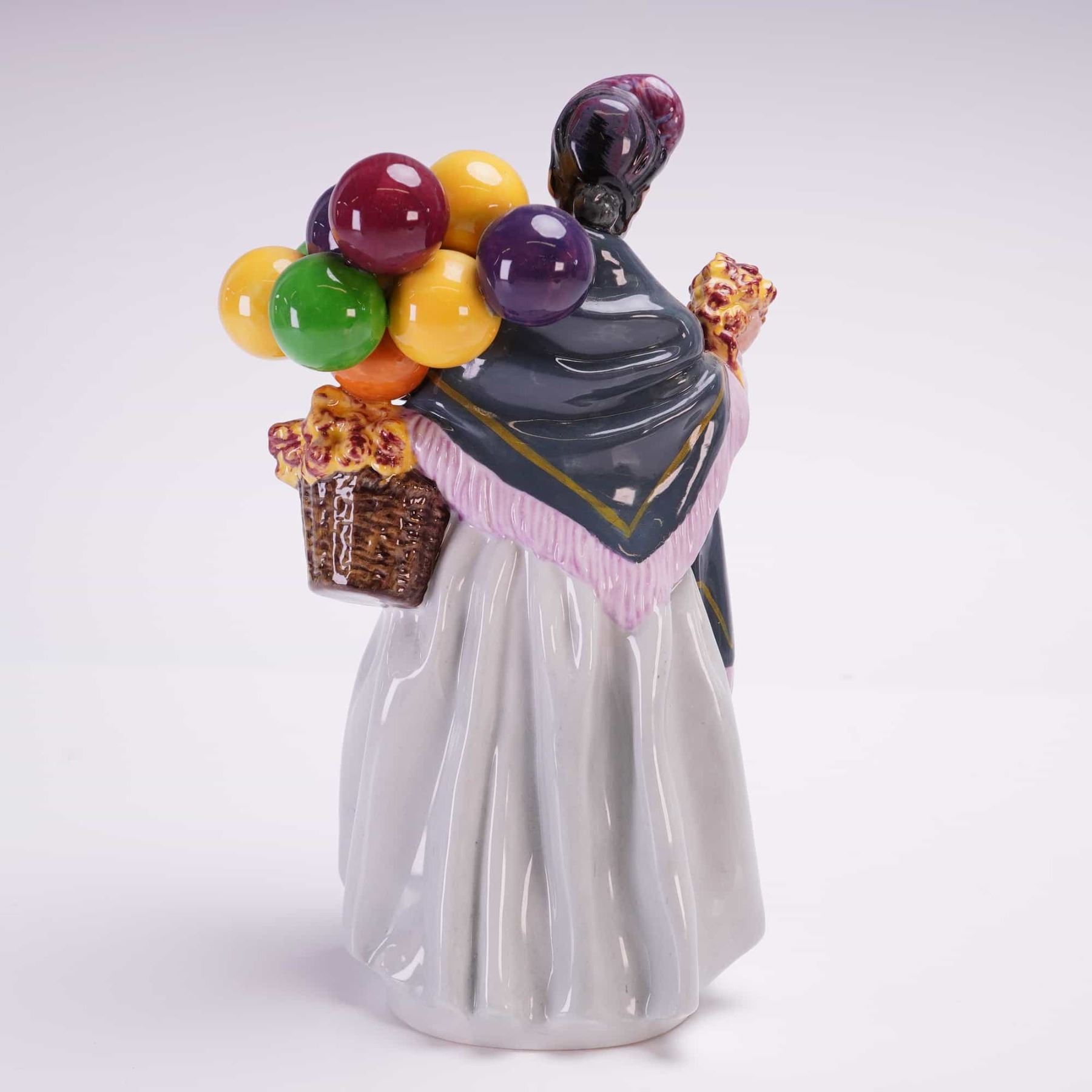 This hand-painted and hand-decorated piece depicts an elderly woman in traditional Victorian-style attire, including a dark shawl with pink fringed edging, a white apron over a gray skirt, and a patterned bonnet. The figure is shown carrying a large cluster of multicolored balloons and a wicker basket filled with yellow and orange flowers. The underside is fully marked with the Royal Doulton lion and crown backstamp, identifying the piece as Handmade and hand decorated, and includes the title, model number, and the signature of the modeler, Leslie Harradine. The base also features a copyright mark for Royal Doulton Tableware Limited 1937.