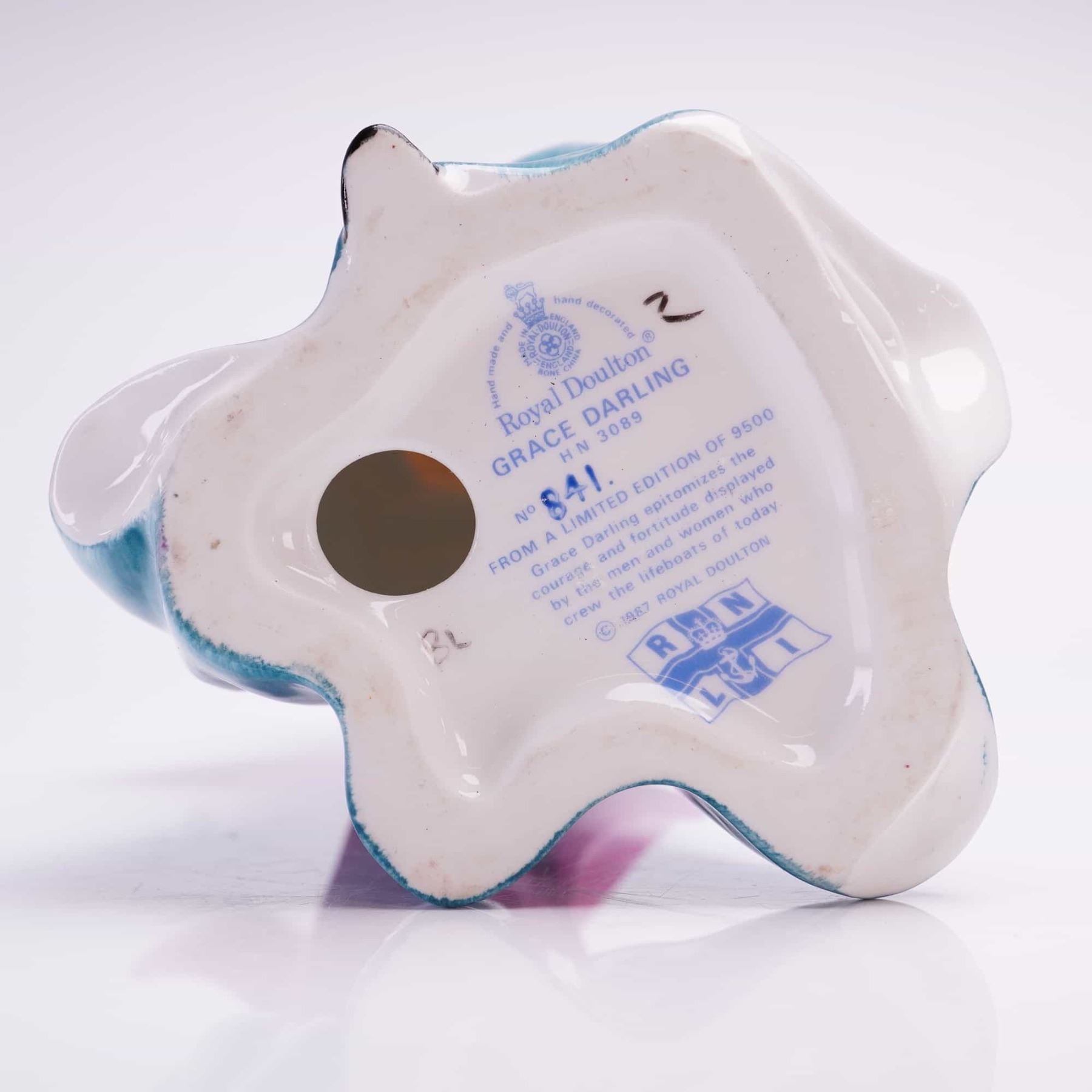 A Royal Doulton hand-painted bone china figurine titled Grace Darling HN3089. This is number 841 of a limited edition of 9500. The figure is modeled in a pose shielding her eyes with one hand, wearing a long blue skirt, yellow blouse with black buttons, and a red shawl. The piece features a high-gloss glazed finish. The underside is marked with the Royal Doulton backstamp, the model number HN3089, and the edition number 841. The base also includes a 1987 copyright date, the Royal National Lifeboat Institution RNLI logo, and a descriptive inscription regarding the courage of lifeboat crews.