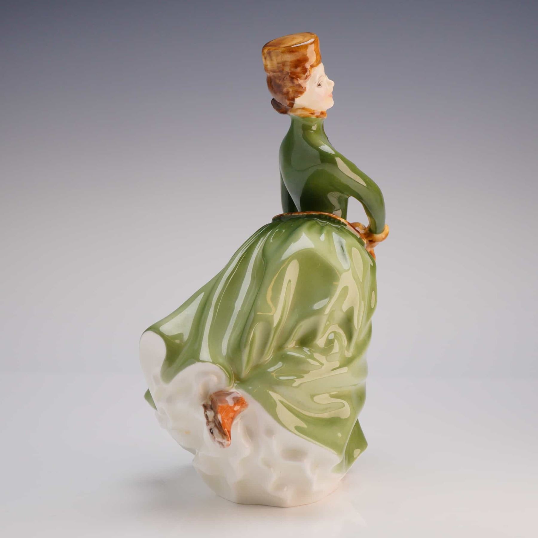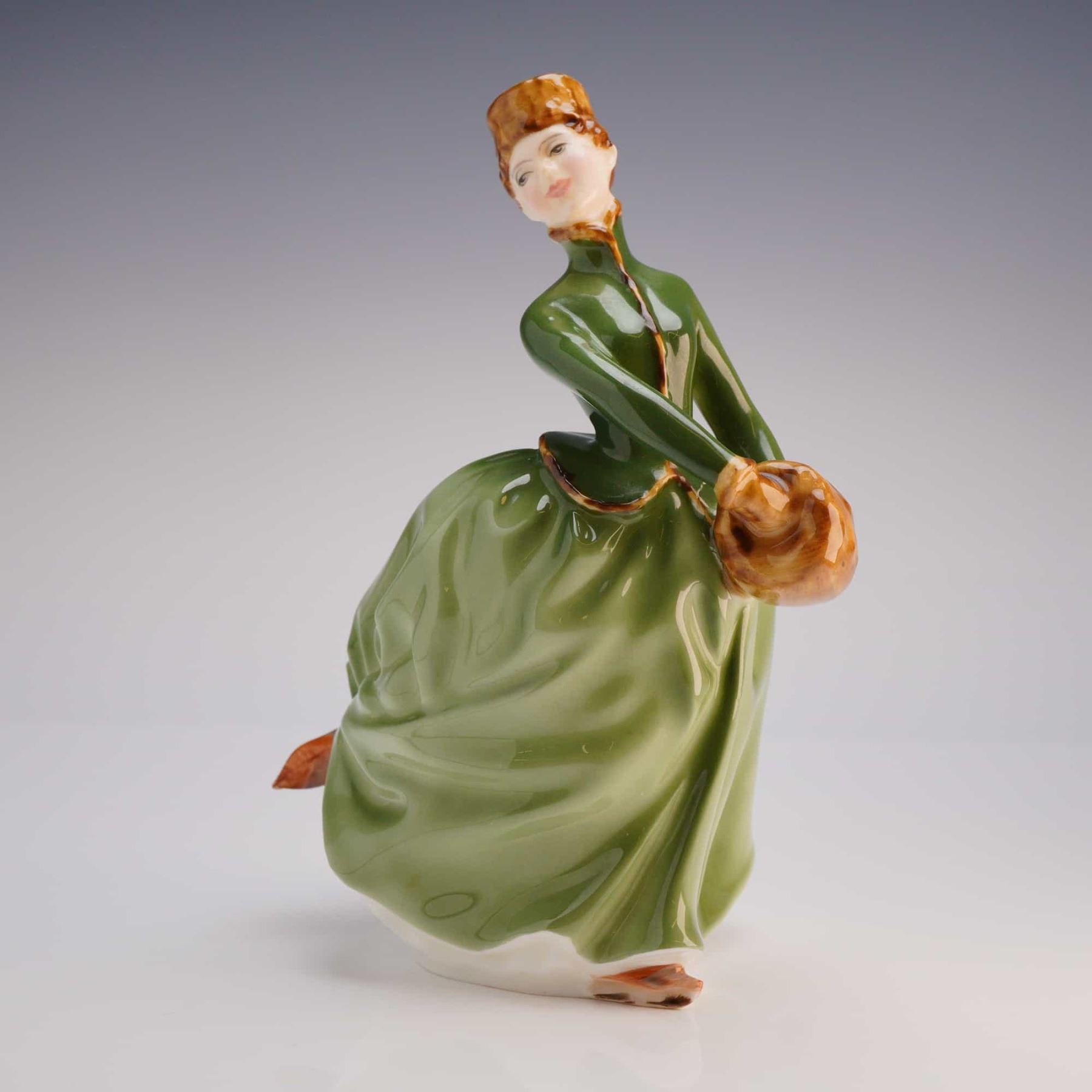 The figure is hand-painted and finished in a high-gloss glaze, depicting a woman in a dynamic, skating-like pose. She is dressed in a green bodice and a flowing skirt, which is green externally and white internally, and wears a brown pillbox hat while holding a brown muff. The base is marked with a green printed Royal Doulton crown backstamp, inscribed MADE IN ENGLAND BONE CHINA, along with the model identification name and number, COPR. 1965, and DOULTON & CO LIMITED.