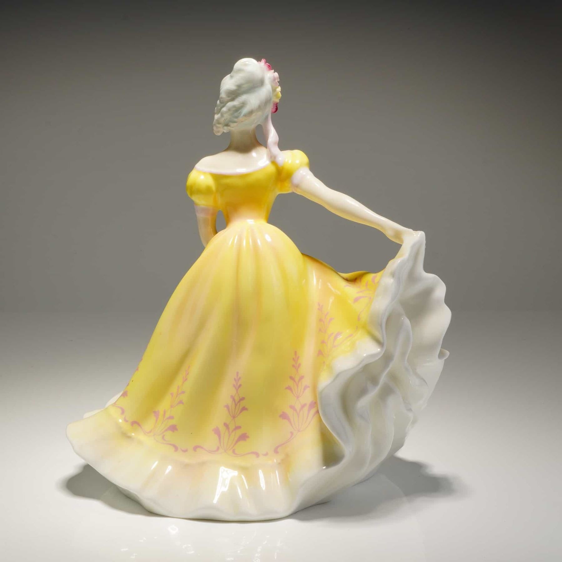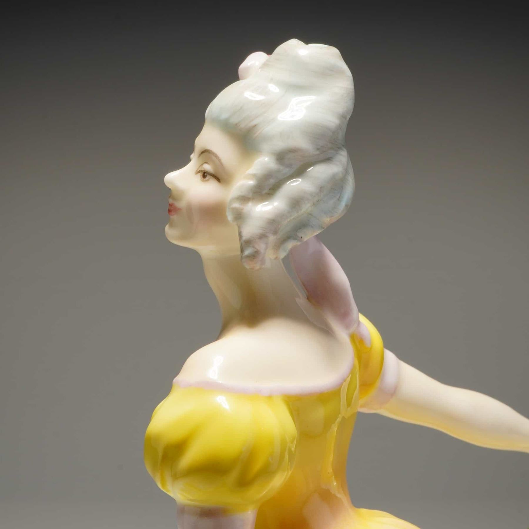 A single Royal Doulton porcelain figurine of a woman in a predominantly yellow and white dress, marked on the base as HN 2379 and copyrighted by Doulton & Co Limited.