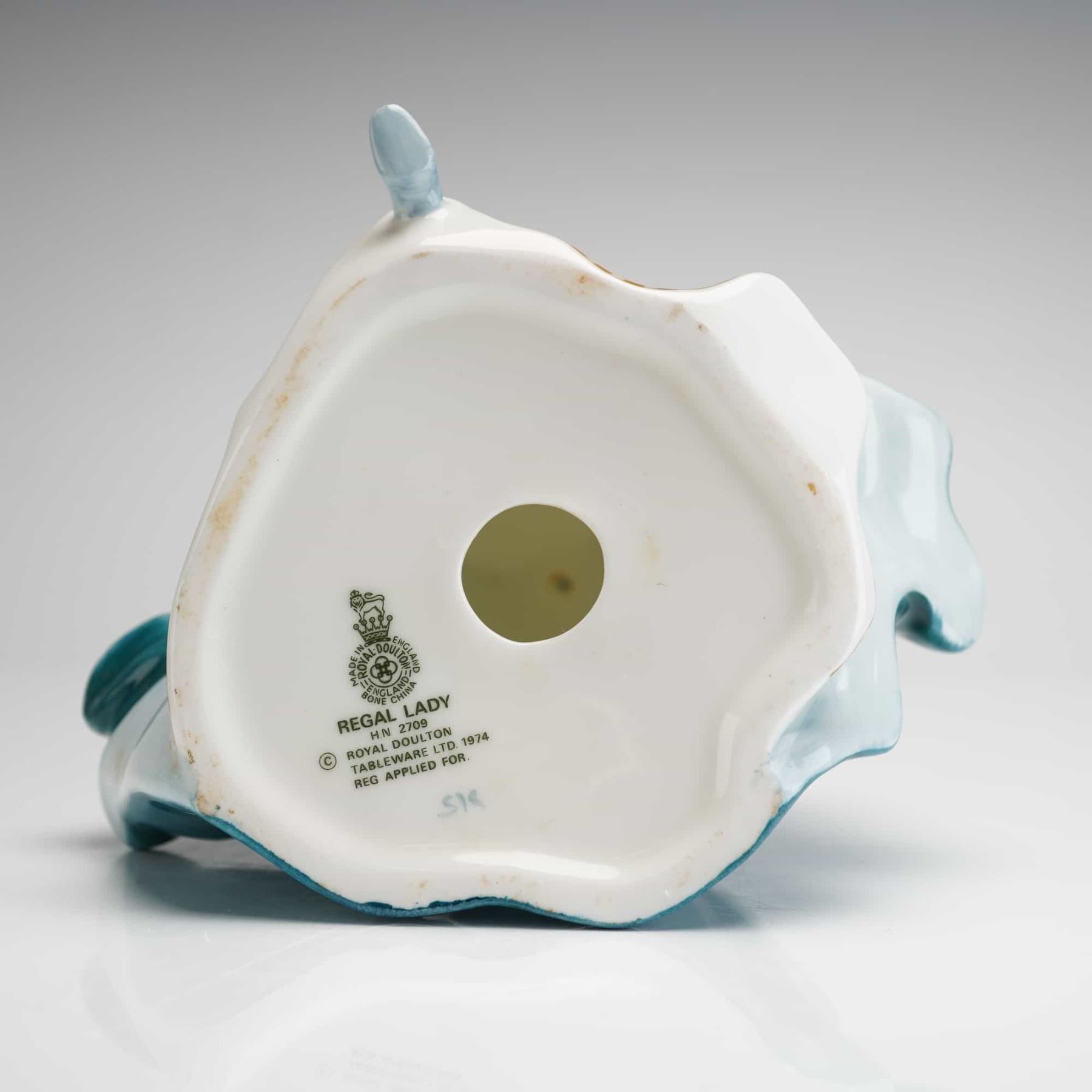 The figurine depicts a woman in a period-style ballgown, designed and copyrighted in 1974. The gown features a glossy teal-green glaze on the bodice and overskirt, contrasting with a creamy white underskirt. The underskirt is further embellished with gold luster detailing around the hemline. The base is marked with the green printed Royal Doulton crown stamp, MADE IN ENGLAND, REGAL LADY, H/N 2709, and dated ROYAL DOULTON TABLEWARE LTD. 1974.