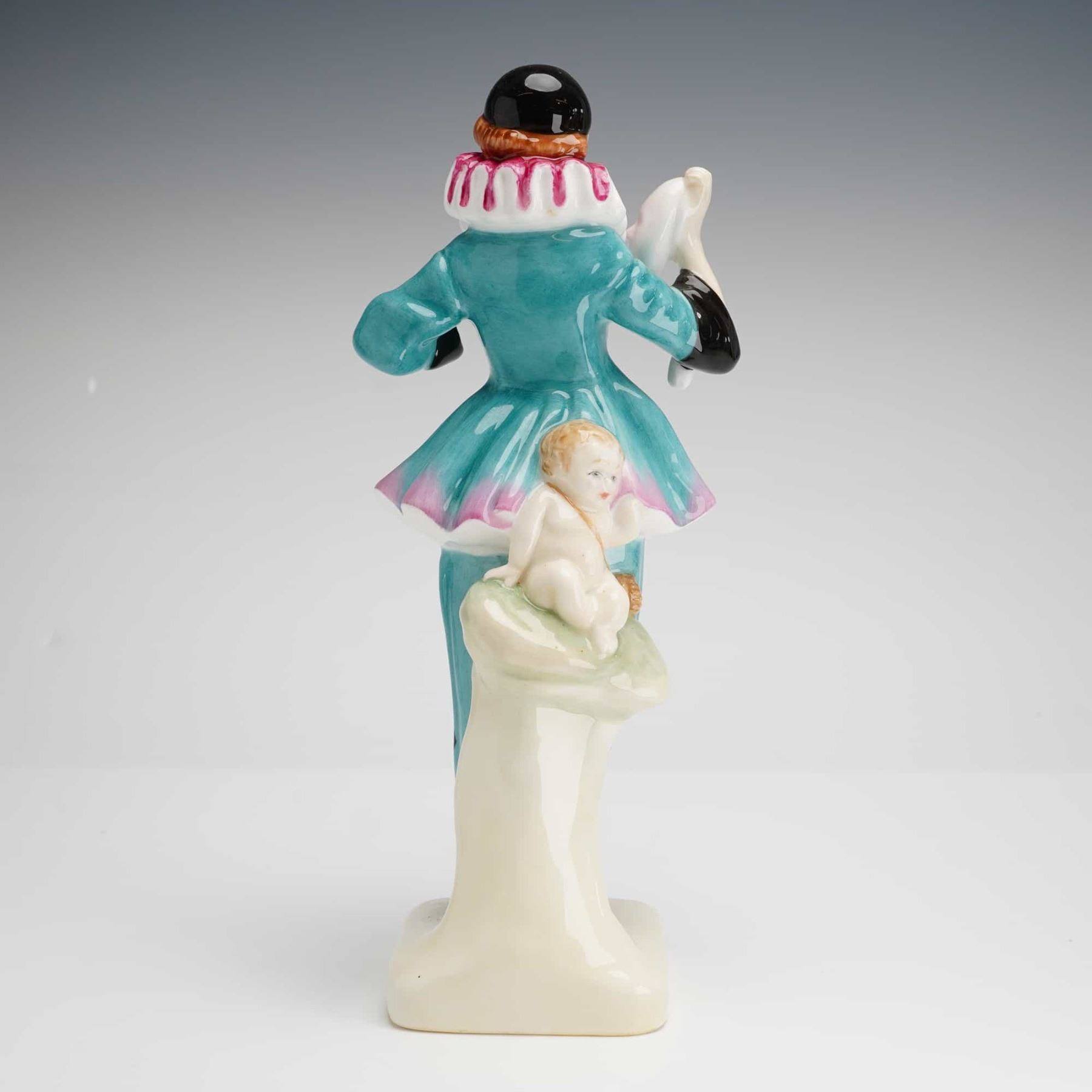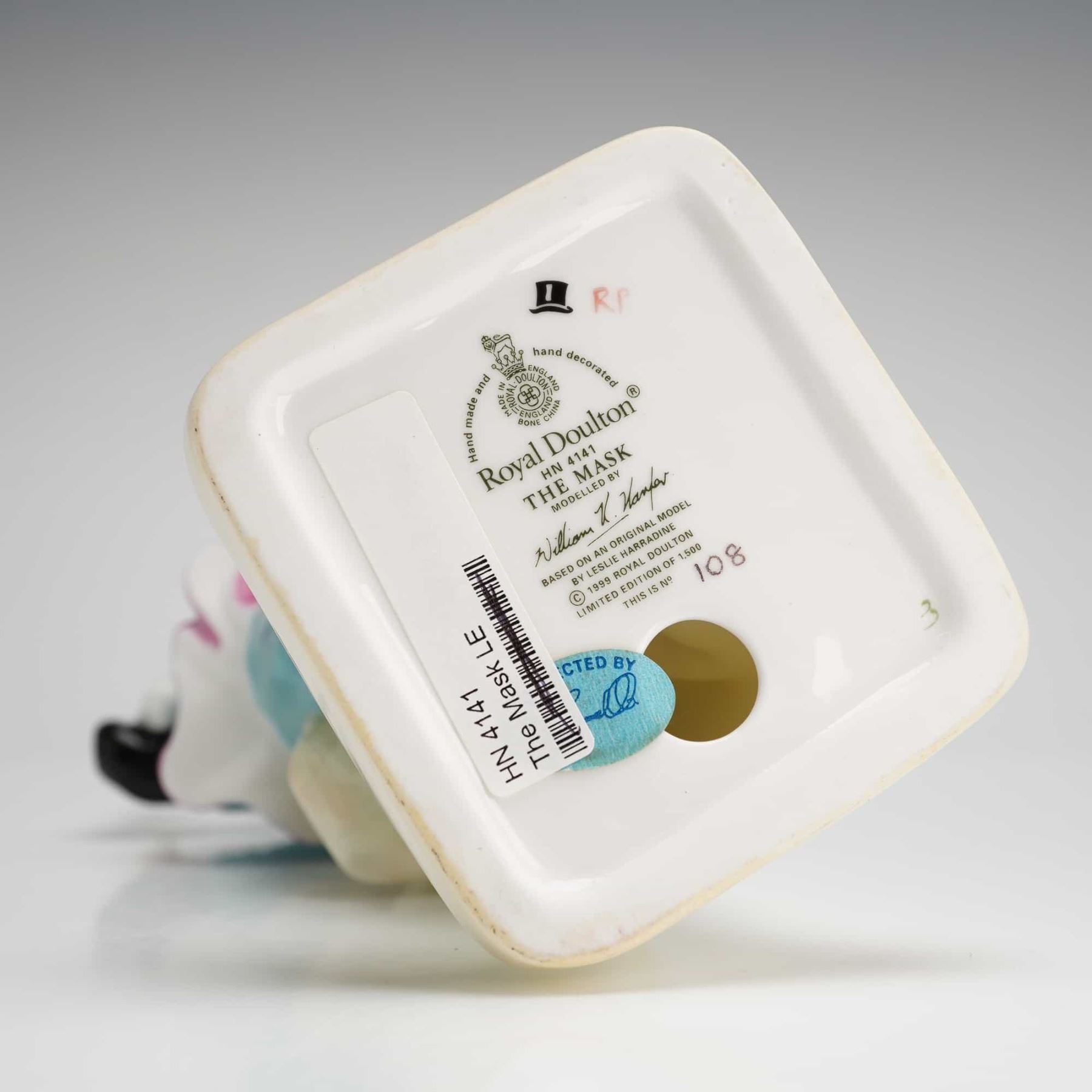 A Royal Doulton bone china figurine titled The Mask HN4141, produced as a limited edition of 1500, of which this is number 108. The figure is hand-decorated in turquoise, pink, and black glazes, depicting a female subject in a stylized harlequin costume. The figure is modeled with a ruff collar and black skullcap, holding a white mask in her right hand. A small, unpainted cherub figure is attached to a support at the rear. The underside of the square base contains the Royal Doulton factory mark, the title, the HN number, and the name of the modeler, William K. Harper. The mark further indicates the design is based on an original by Leslie Harradine and is dated 1999.