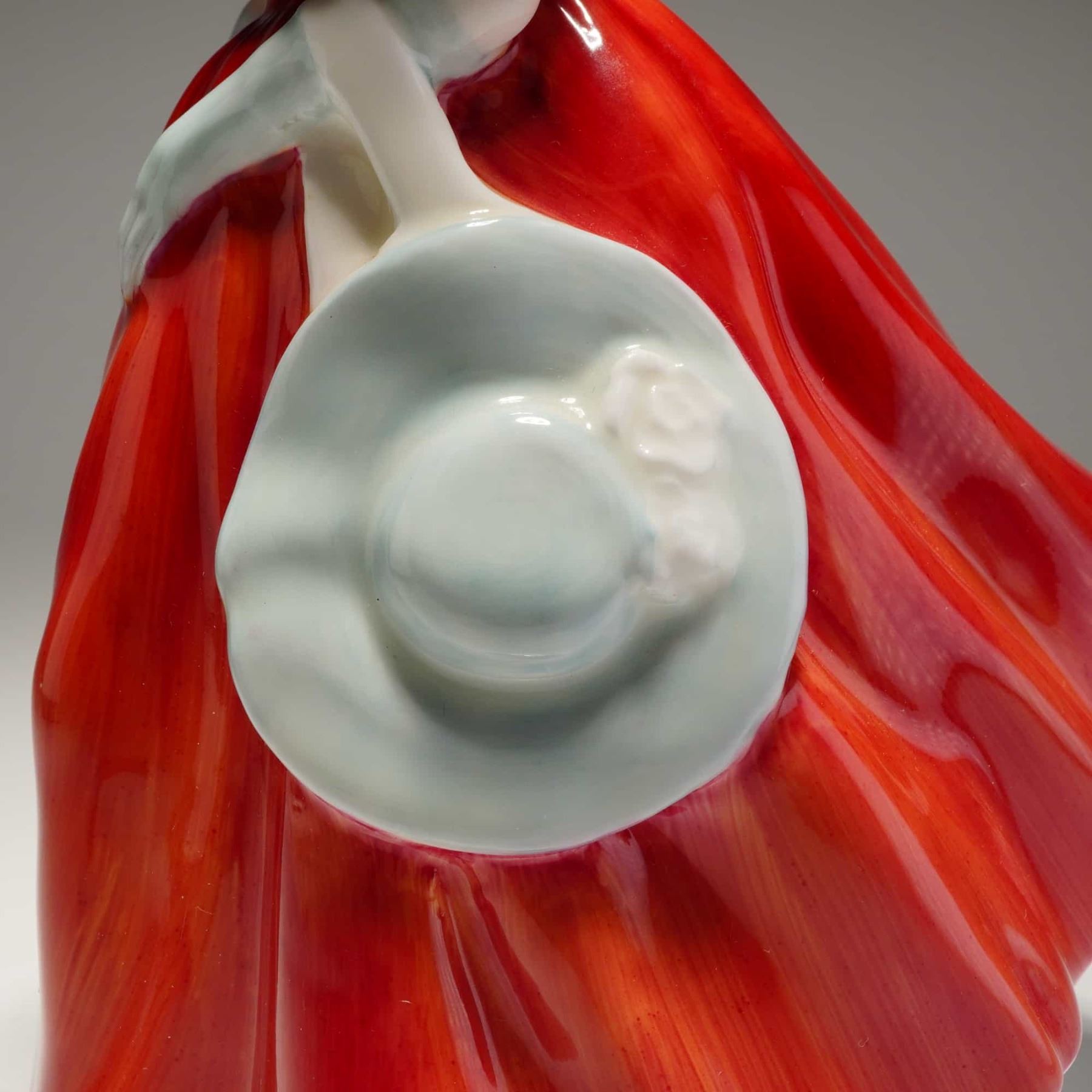 A glazed bone china figurine by Royal Doulton, titled "Winsome," model number HN 2220. The figure is dressed in a voluminous, flowing gown rendered in vibrant, glossy red-orange hues, featuring puffed sleeves and long pale blue gloves. She carries a pale blue hat on her left arm. The base bears the green Royal Doulton backstamp, the model name "Winsome," the number H.N. 2220, and the copyright date of 1959.