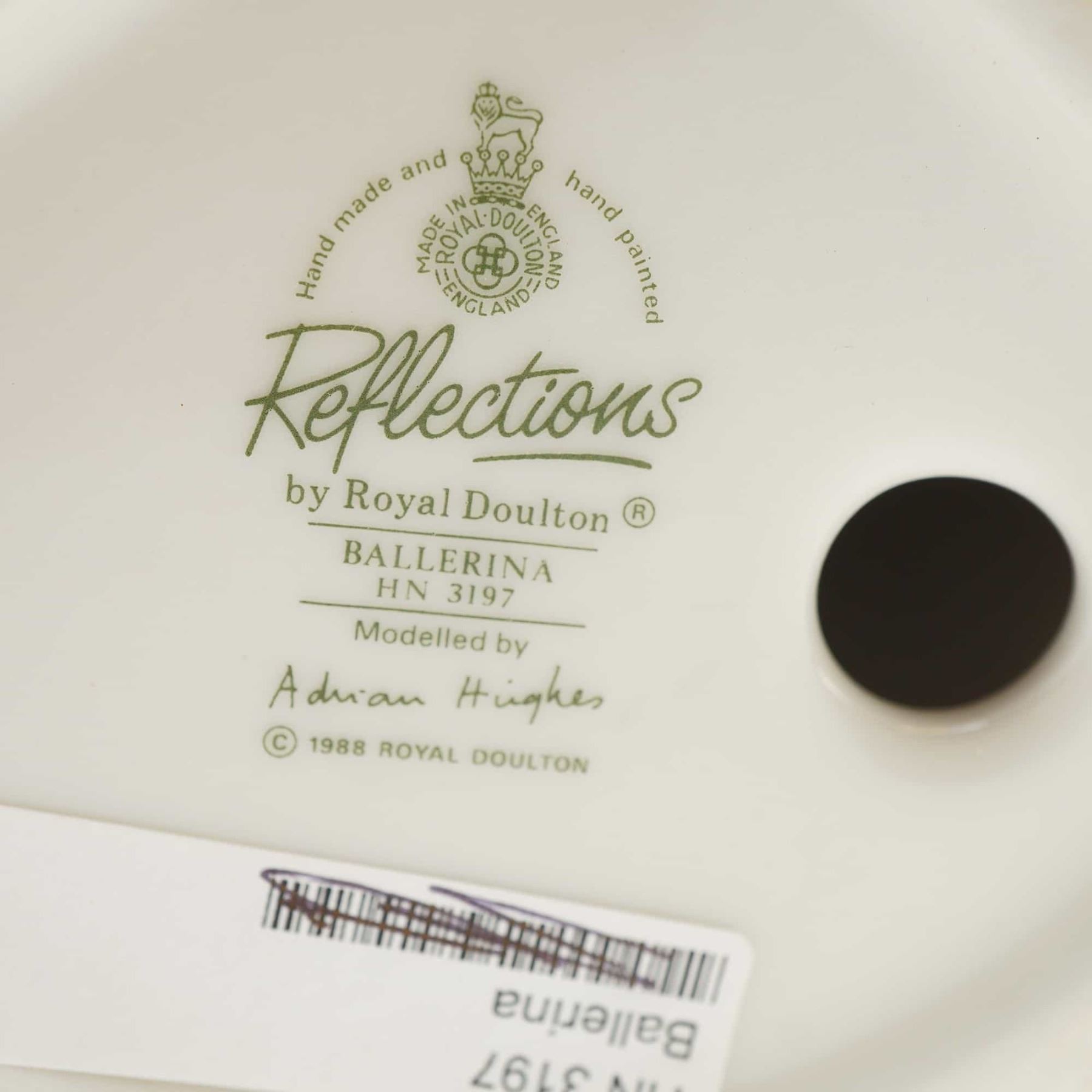 A Royal Doulton porcelain figurine from the Reflections series. This piece was modeled by Adrian Hughes and is dated 1988. The figurine depicts a female dancer in a reaching pose with one arm extended upward and the opposite leg trailing behind. The figure is dressed in a white sleeveless bodice and a short, pleated tutu. It features hand-painted black hair and facial details, finished with a high-gloss glaze. The figure is set upon an integral, light tan, rock-form base. The underside bears a green printed backstamp including the Royal Doulton lion and crown emblem, Handmade and hand painted, MADE IN ENGLAND, and specific model information including the series name, title, and modeler name.