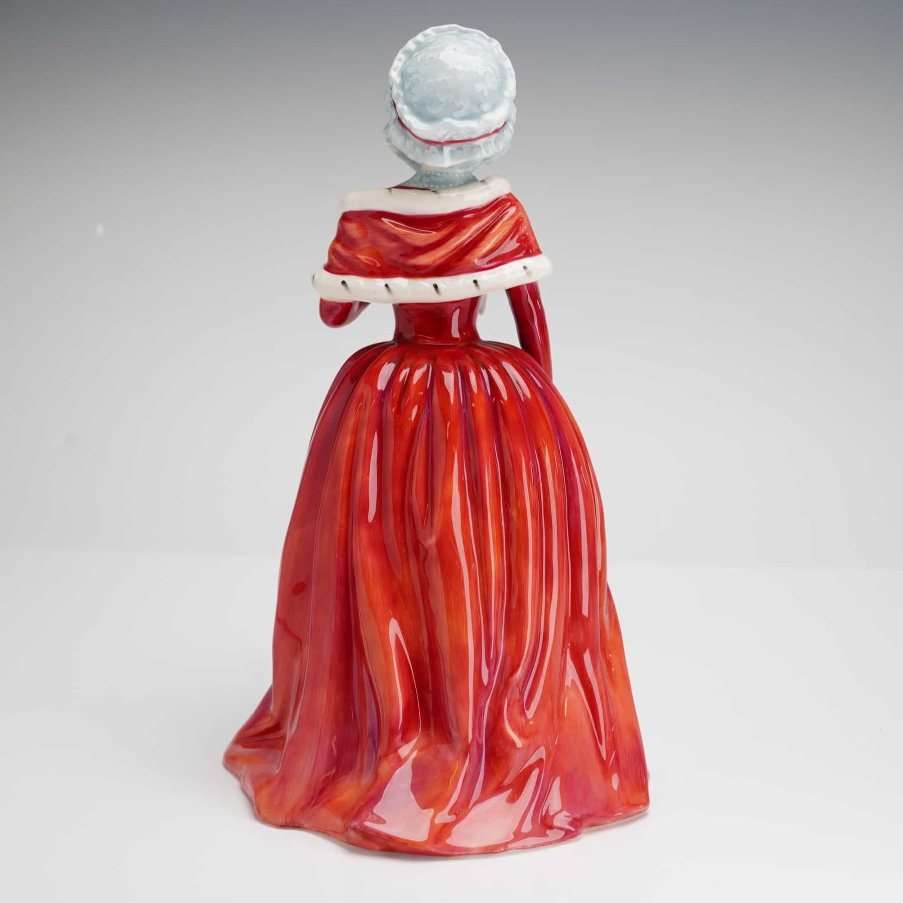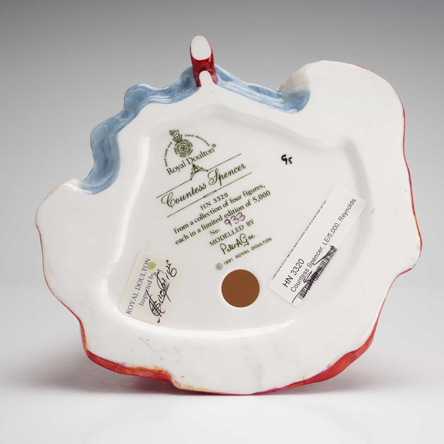 A Royal Doulton hand-decorated bone china figurine titled Countess Spencer HN3320. This piece was modeled by Peter Gee and issued in 1991 as part of a collection of four figures, each in a limited edition of 5000. The figure is depicted in 18th-century style dress, featuring a glossy red overcoat with white fur-effect trim, a pale blue floral-patterned skirt, a white bonnet, and a matching muff held at her waist. The underside displays the comprehensive Royal Doulton maker's mark and is individually numbered 933 of 5,000.