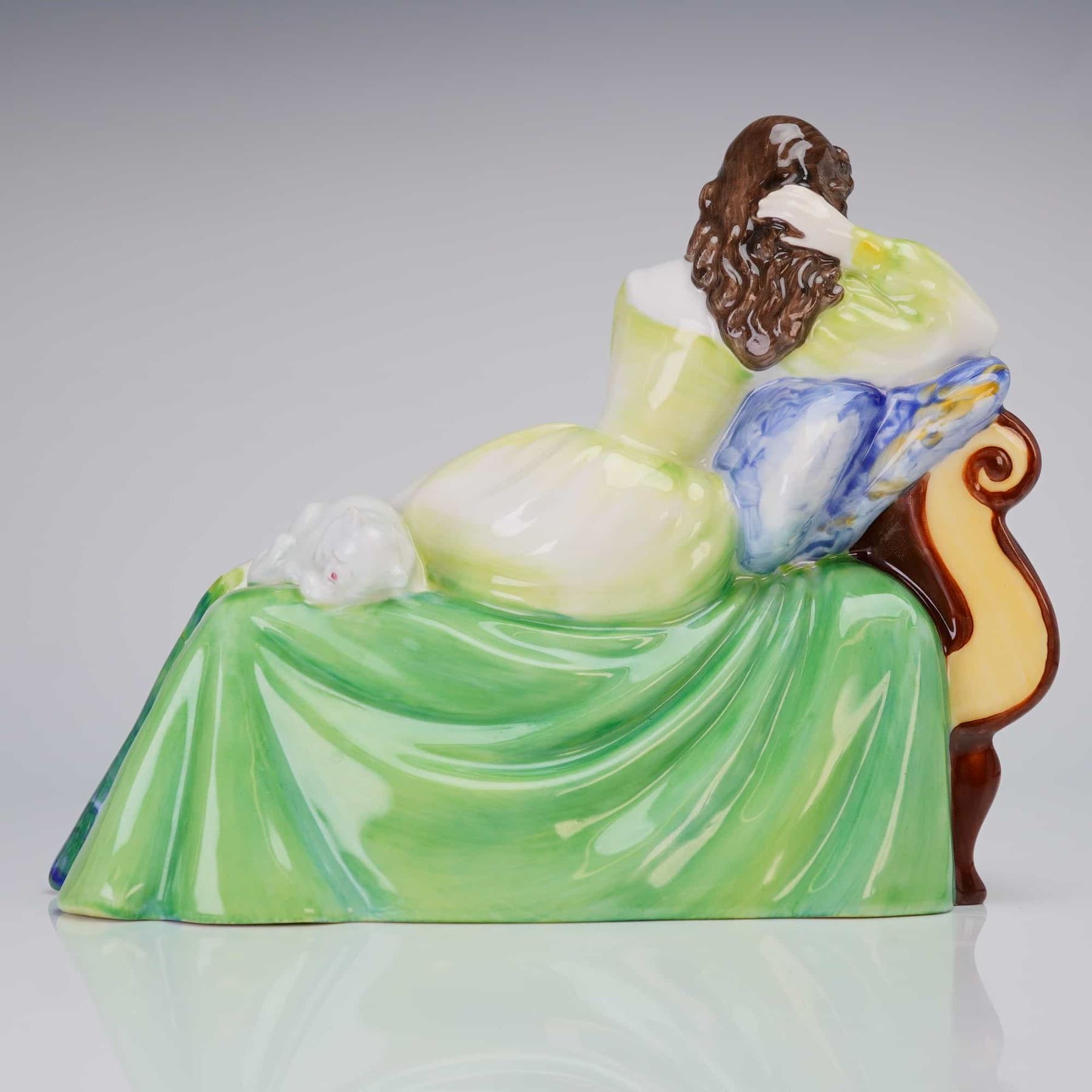 A single Royal Doulton depicting a woman seated on a settee wearing a multicolored floral gown, marked Royal Doulton Tableware Ltd 1979 on the base.