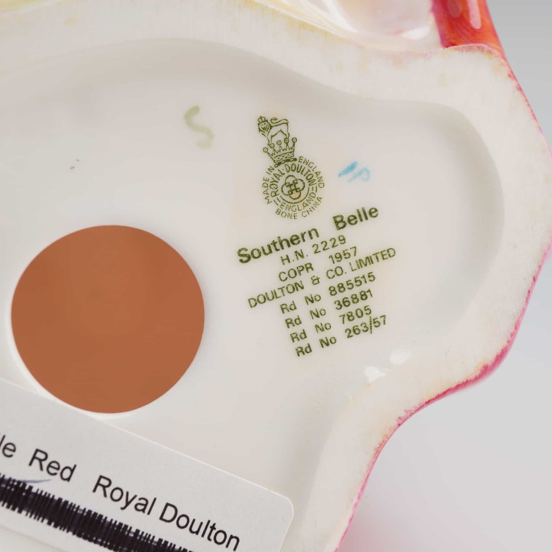 The figure is hand-painted and depicts a woman in a romantic-style gown with a voluminous, ruffled skirt. The coloration is characterized by high-gloss shades of bright red, pink, yellow, and white. The figure's arms are posed as if holding the skirt edges. The base is marked with the green printed Royal Doulton crown backstamp, confirming it as bone china made in England. Additional inscriptions include the title "Southern Belle," the pattern number H.N. 2229, the copyright date "COPR 1957," DOULTON & CO. LIMITED, and various registration numbers (Rd No 885515, Rd No 36881, Rd No 7805, Rd No 263/57).