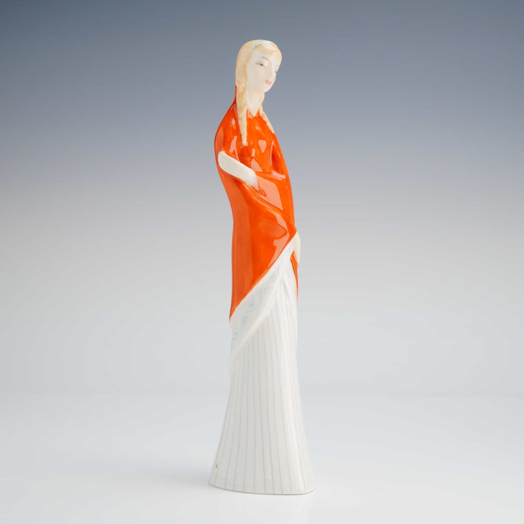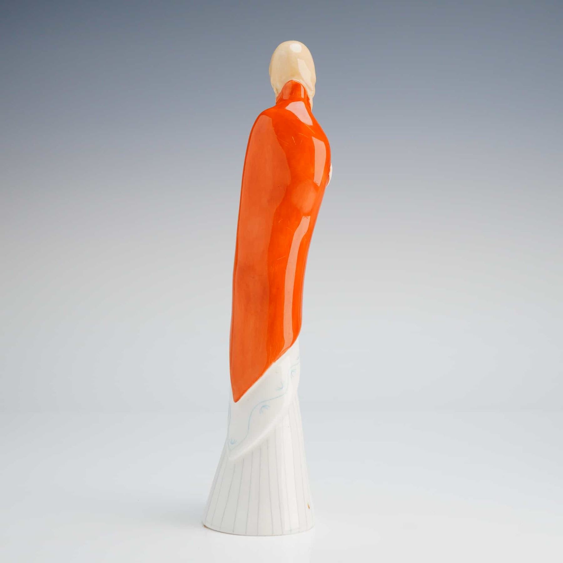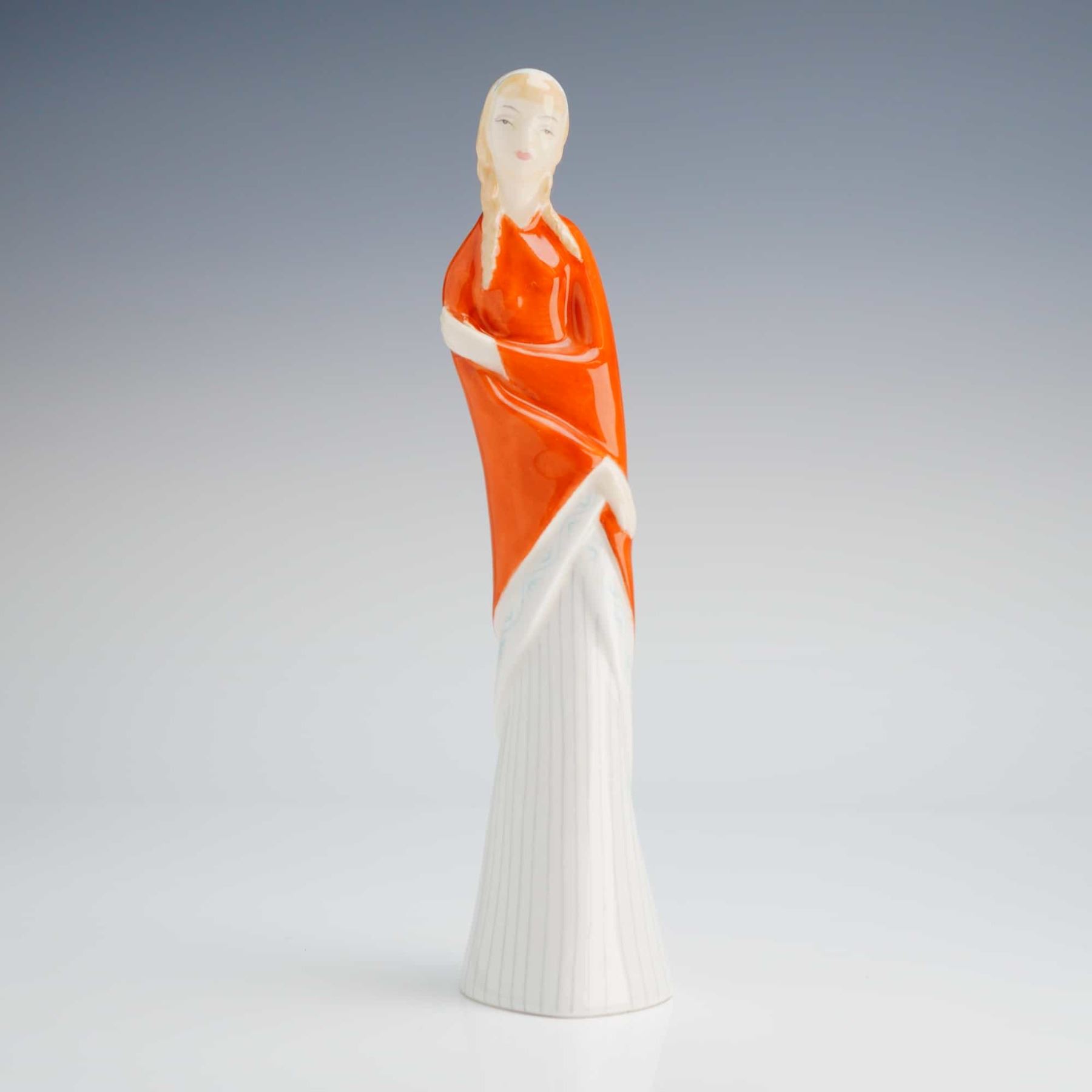 The piece depicts a stylized standing young woman executed in a modernist mid-20th century aesthetic. The figure is dressed in a long, wide white skirt decorated with delicate vertical blue pinstriping, partially covered by a highly glazed, vibrant orange-red shawl draped over her shoulders and arms. The base features the circular green Royal Doulton stamp, confirming the material as "Bone China," and COPR. 1956, DOULTON & CO. LIM'TED.