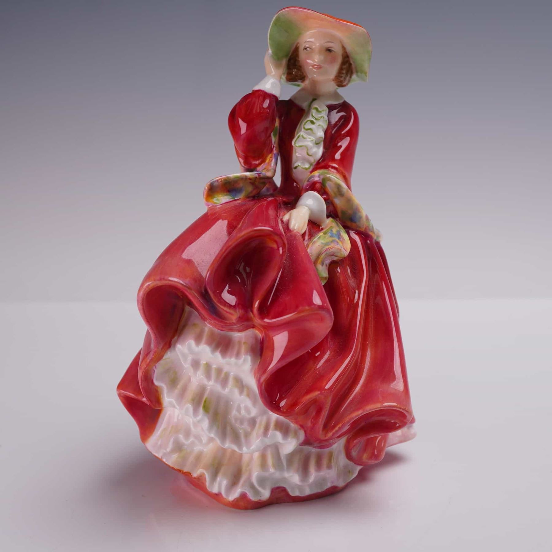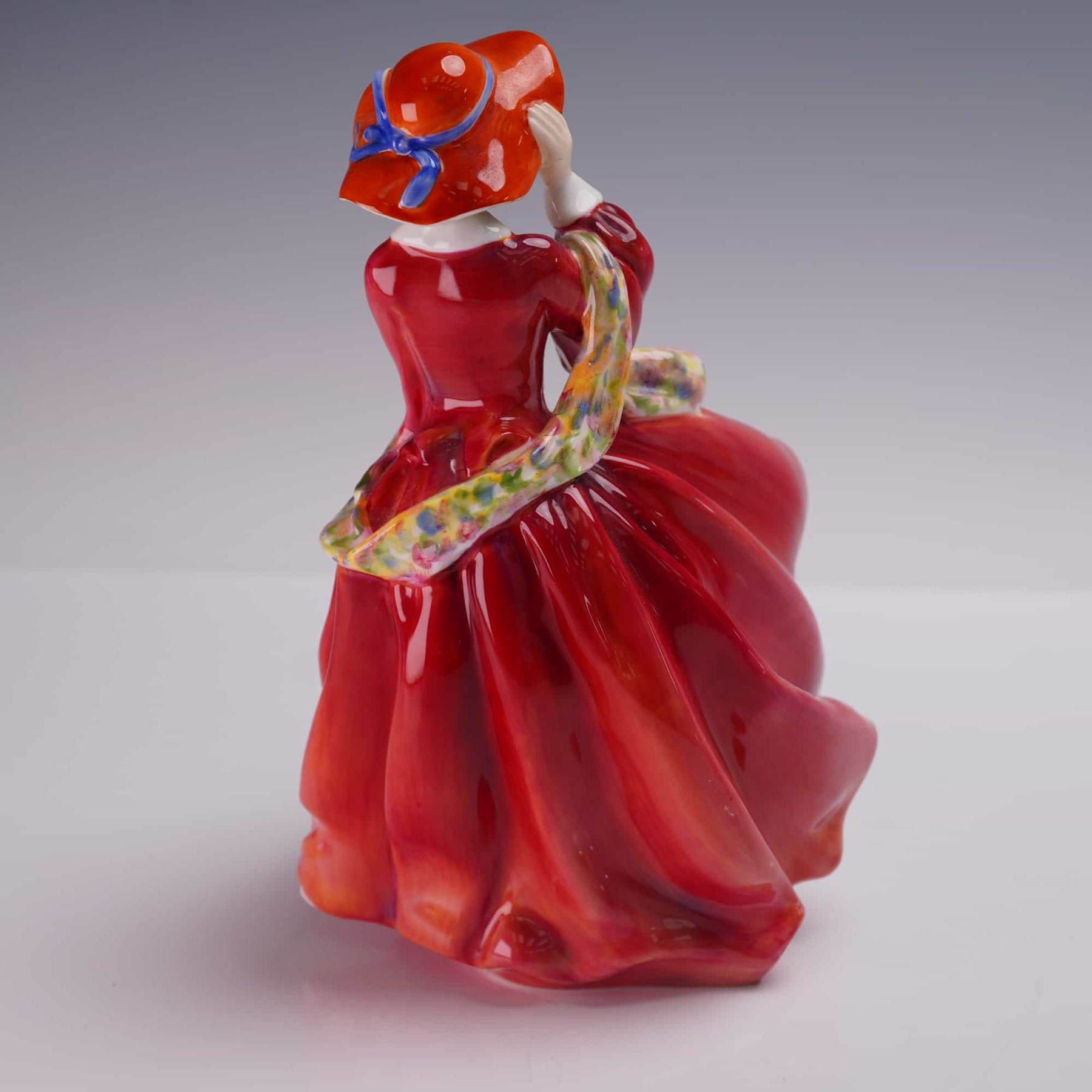 Bone china figure represents the first version of one of Leslie Harradine's most recognized creations. It features a young woman in a wind-swept pose, grasping her bonnet, dressed in a deep red flowing gown with a hand-painted multicolored sash and white petticoat details beneath her raised skirt. The collar is also accented in white. Marked with the Royal Doulton backstamp.