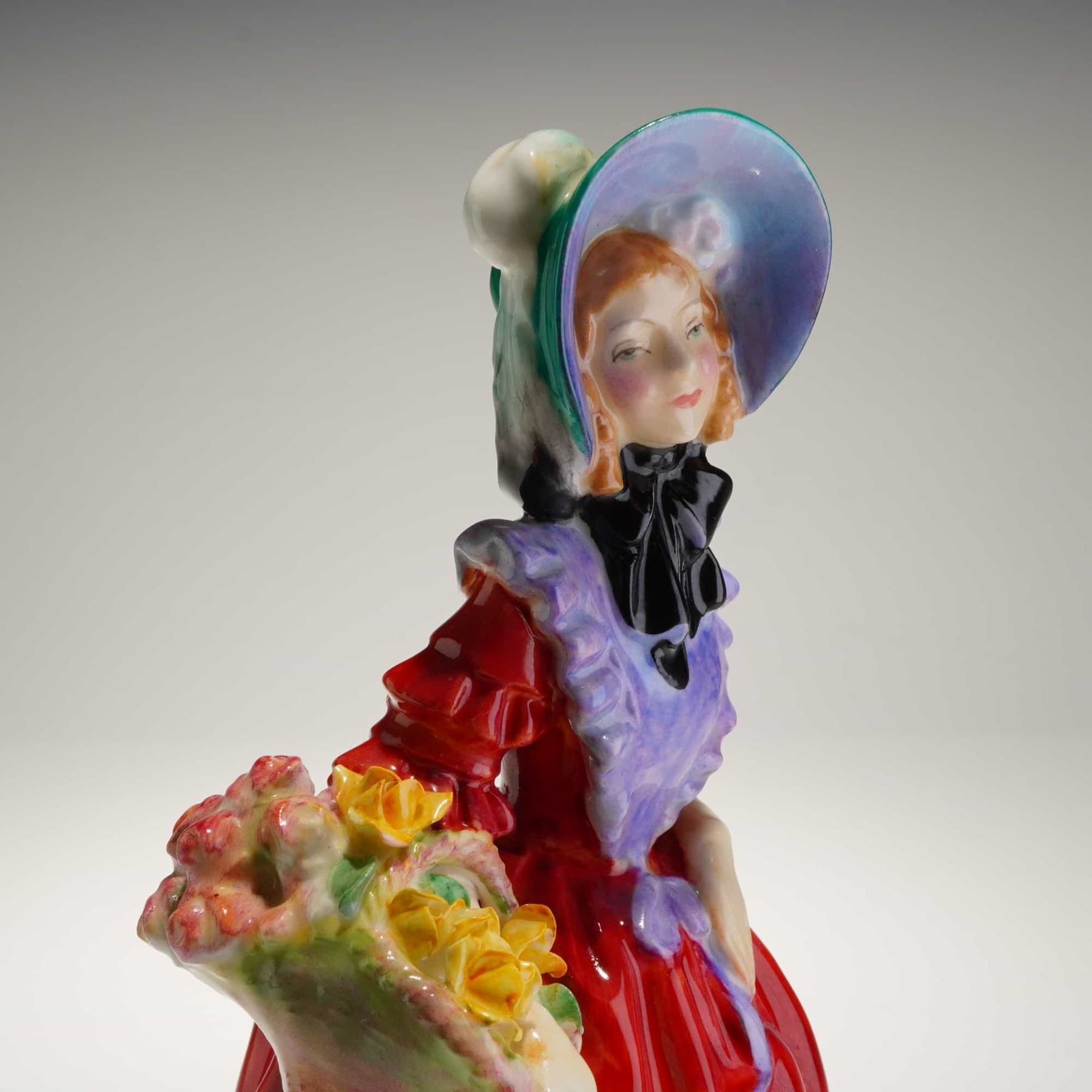 A single glazed bone china figurine manufactured by Royal Doulton, "Lady Betty," HN 1967, that depicts a standing female figure dressed in a voluminous, deep red tiered gown, accented by a purple shawl and a wide blue and green bonnet. The figure holds a basket overflowing with yellow and mixed-color flowers. The underside of the base bears the green printed Royal Doulton crest mark, the designation "MADE IN ENGLAND," the model name "'Lady Betty,'" and the number "HN 1967."