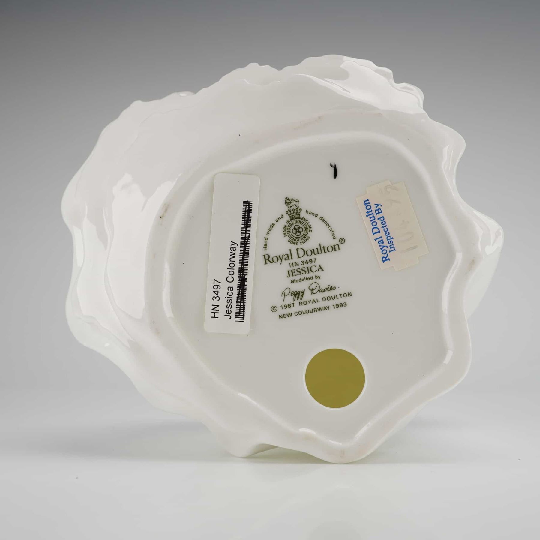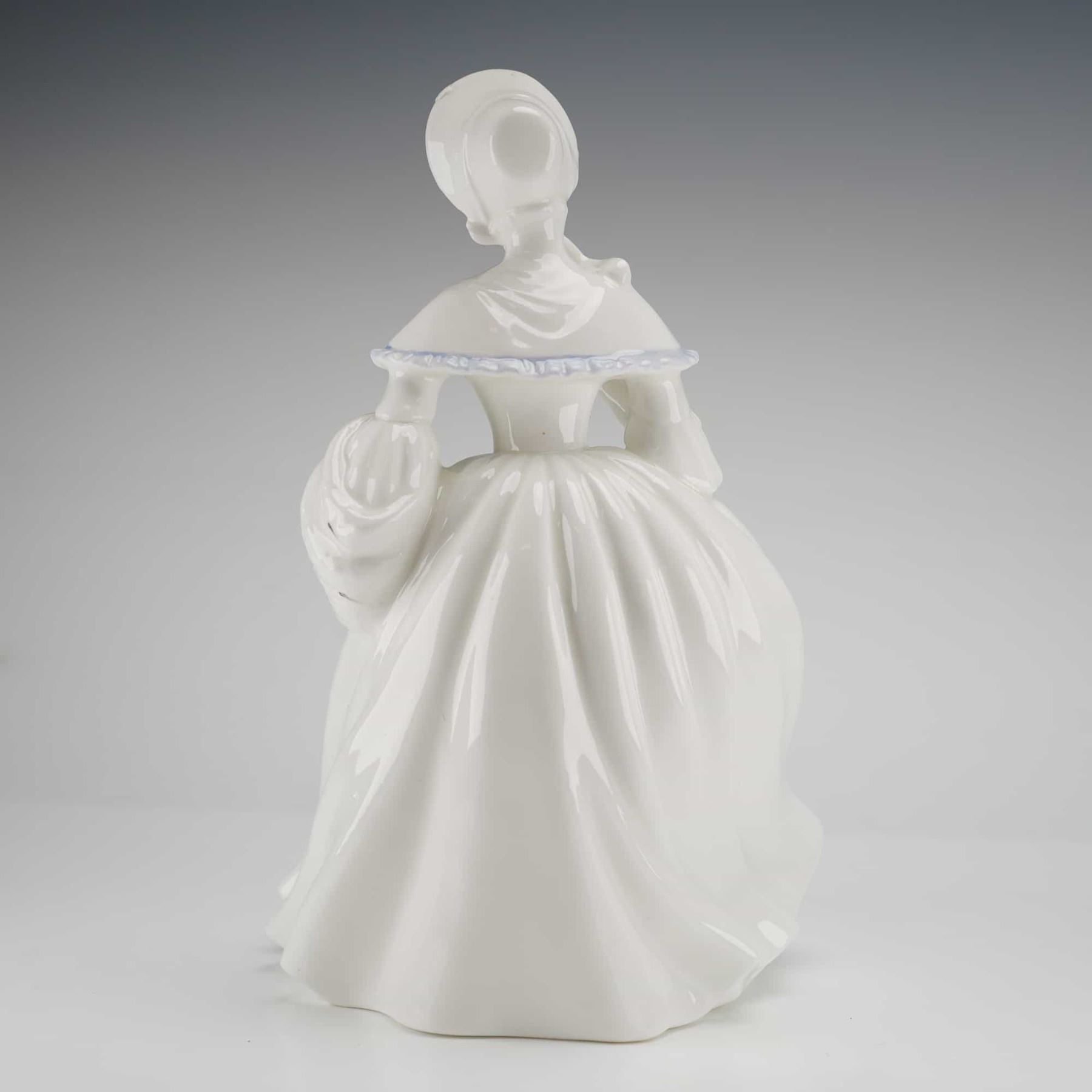 A Royal Doulton Figurine, Jessica HN3497, modelled by Peggy Davies and copyrighted 1987 New Colourway 1993, featuring a woman in a white and blue porcelain dress.