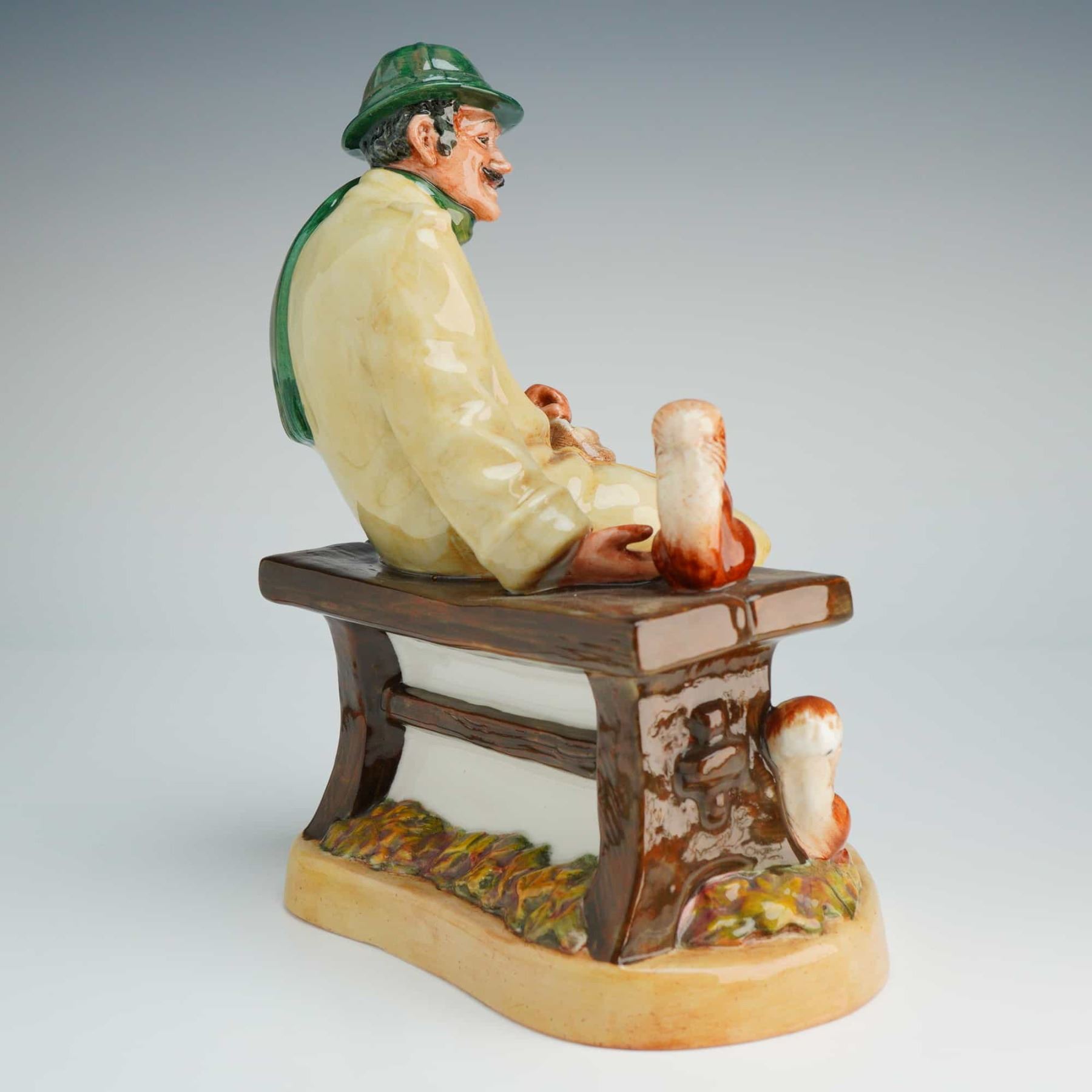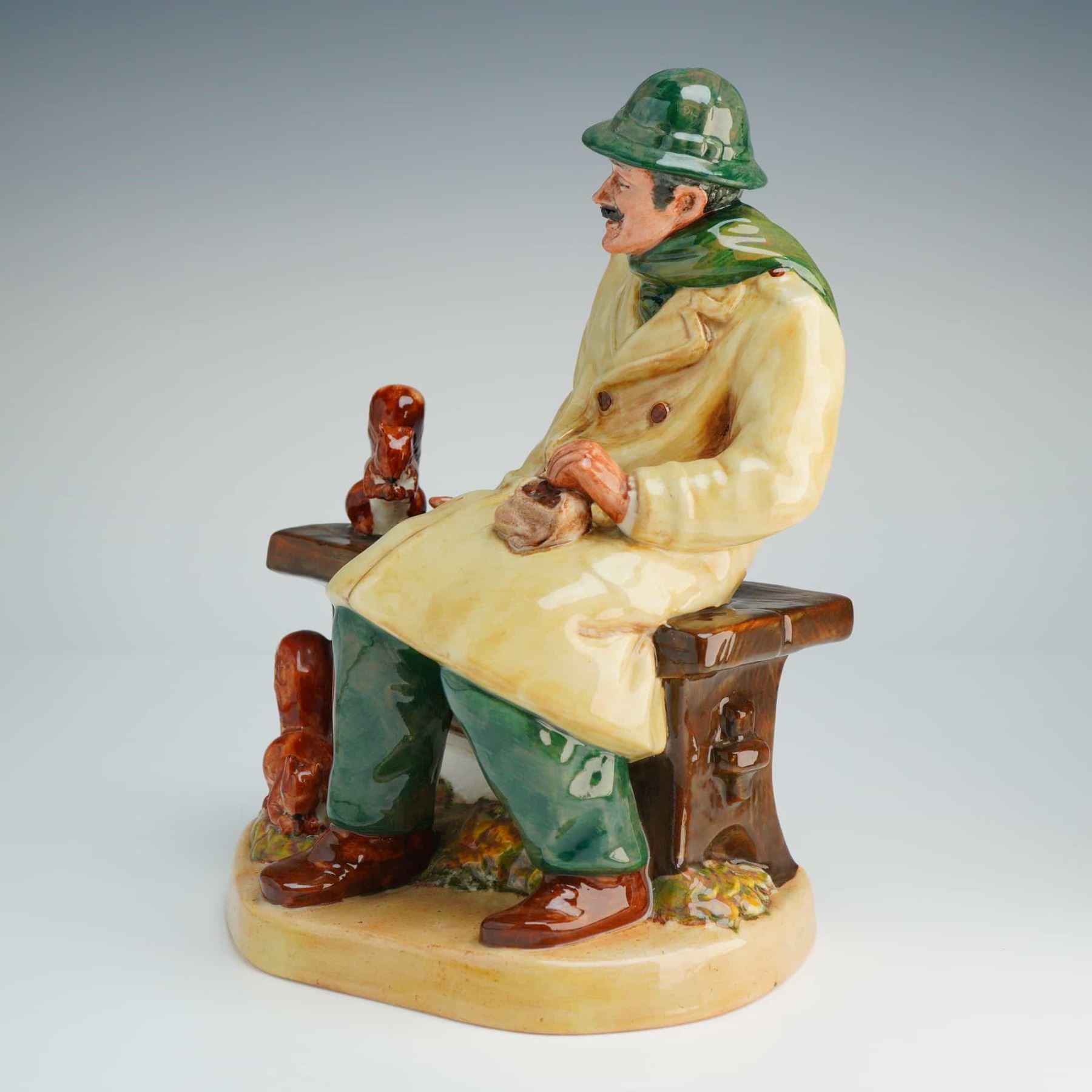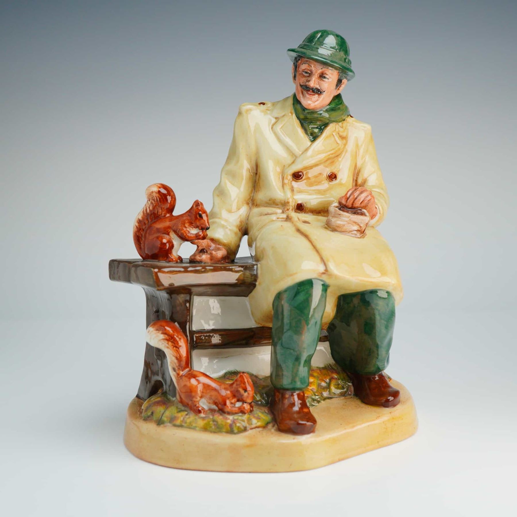 The figure depicts a mustachioed man seated on a park bench, wearing a green hat and scarf, a cream-colored double-breasted overcoat, and green trousers. He is shown holding a small bag of food while feeding several reddish-brown squirrels positioned on the bench and at his feet. The piece is finished with a characteristic high-gloss glaze on a naturalistic oval base. The underside bears the green Royal Doulton lion-and-crown maker mark, the title, model number, and a copyright date of 1972 for Doulton and Co Limited.
