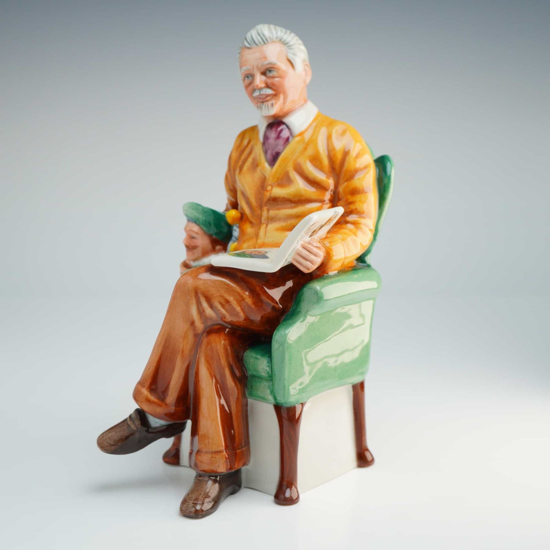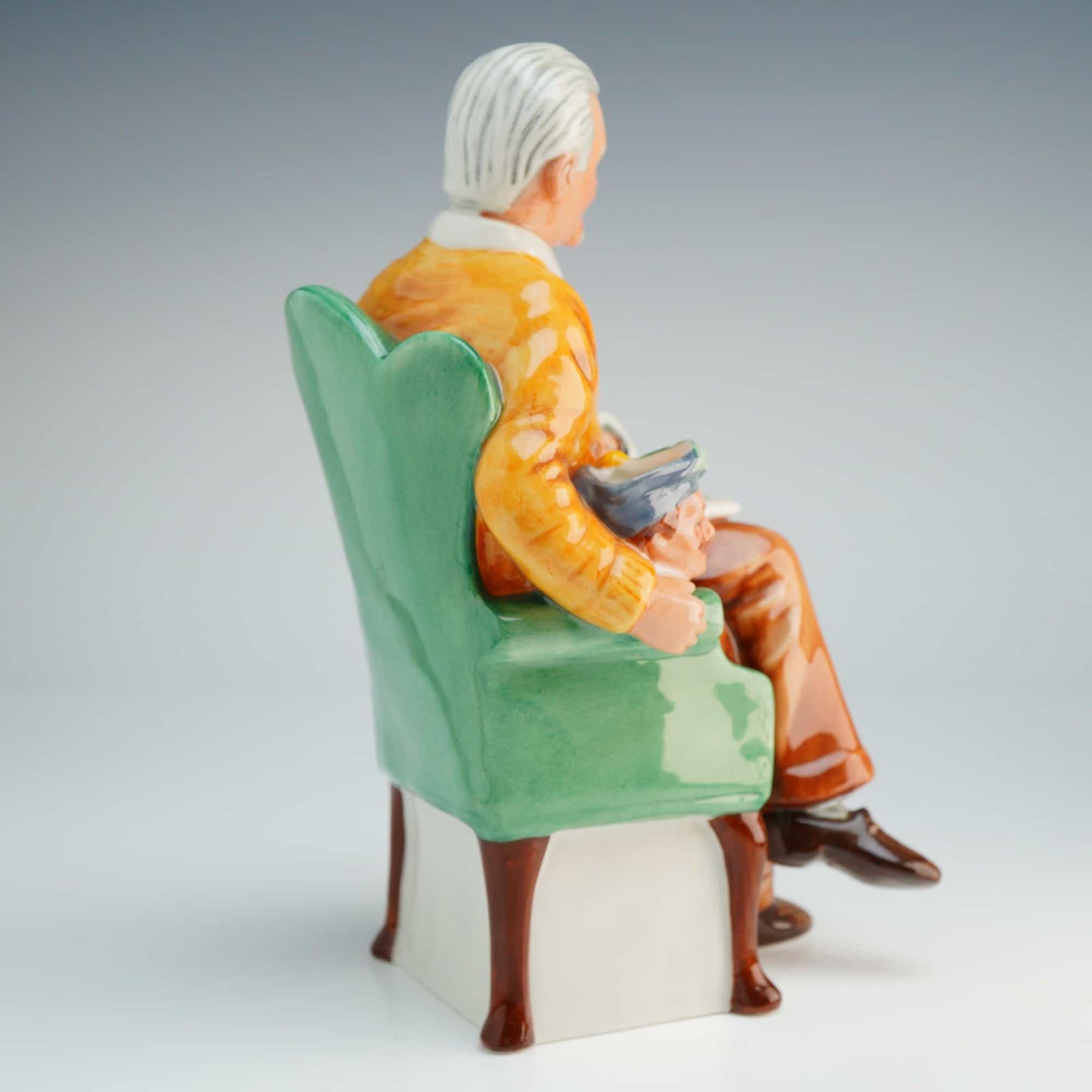 Royal Doulton issued for the International Collectors Club. This glazed ceramic figure was modeled by Robert J. Tabbenor and depicts an elderly gentleman with white hair and a goatee seated in a green armchair. The subject is wearing a yellow cardigan, white shirt, maroon tie, and brown trousers. The figure holds an open book featuring a portrait, with a character jug resting on the chair beside him. The underside is marked with the official Royal Doulton International Collectors Club backstamp, identifying the title, model number, production date of 1983, and the modeler's name.