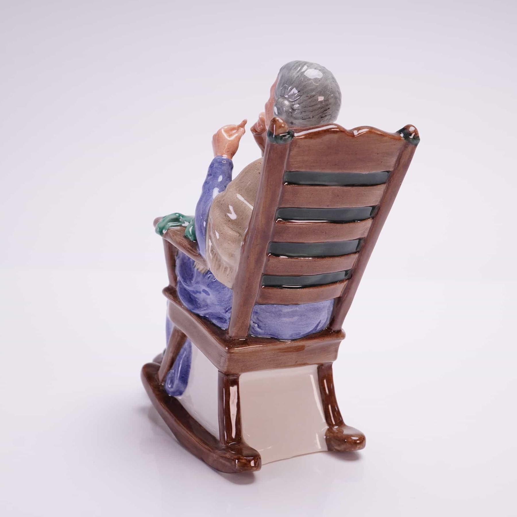 The figure depicts an elderly woman with gray hair seated in a brown rocking chair while sewing a piece of green fabric. The subject is dressed in a blue gown with a tan shawl and black shoes. The piece features a high-gloss finish throughout. Royal Doulton lion and crown backstamp, along with the title, model number H.N. 2352, copyright date COPR 1965, and registration numbers on base.