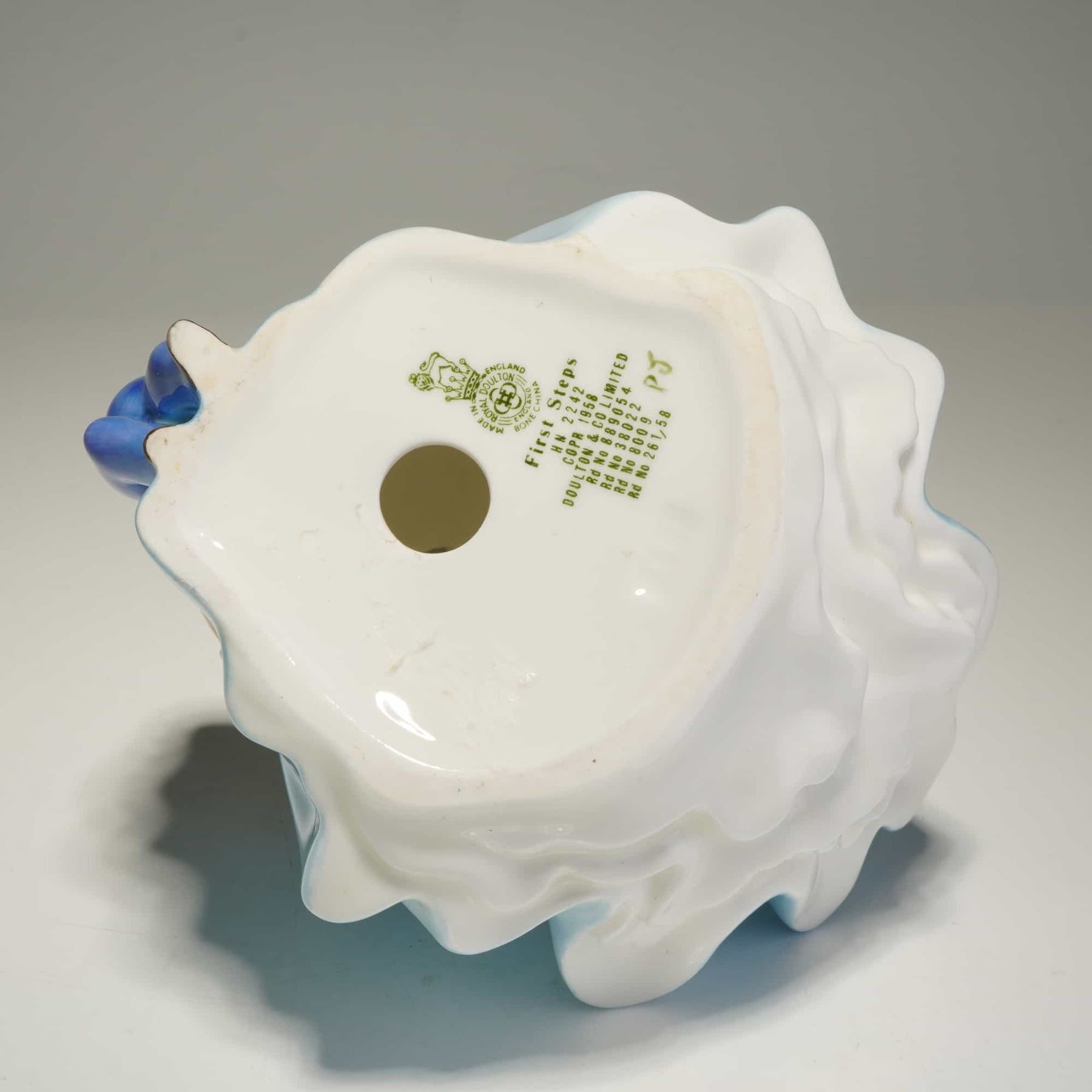 A Royal Doulton bone china figurine titled First Steps HN2242, that depicts a woman in a light blue gown assisting a young child as he takes his first steps. The figurine features a high-gloss glaze with hand-painted details on the faces and hair. The underside bears the Royal Doulton green backstamp, the title, model number, and a copyright date of 1958 for Doulton & Co. Limited.