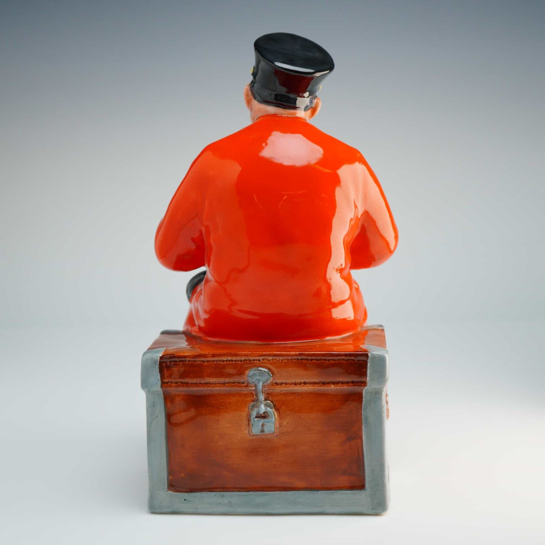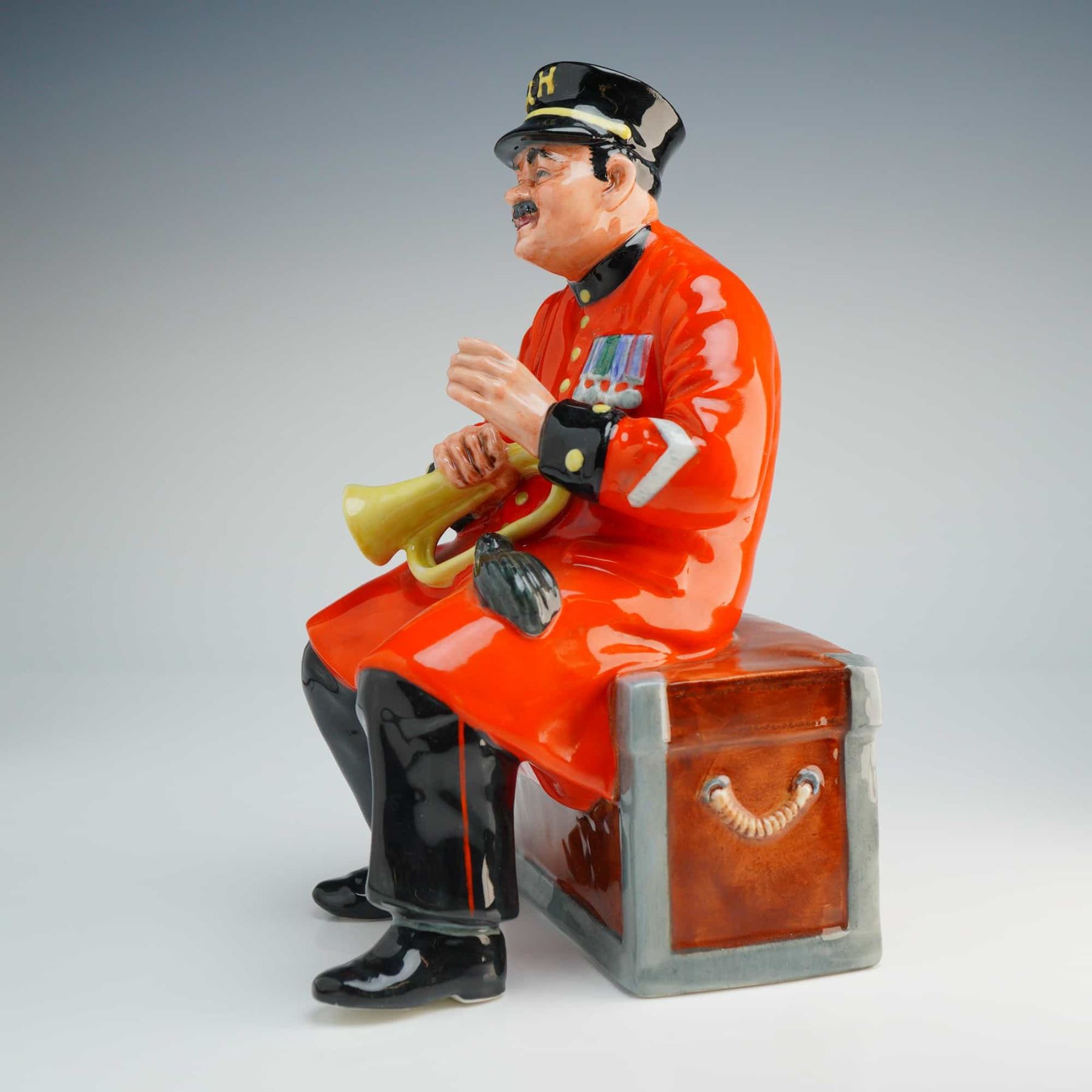 This polychrome glazed ceramic figure depicts a seated military veteran wearing a red coat with service medals, black trousers with a red side stripe, and a black peaked cap marked with the initials RH in gold. The figure is shown seated upon a brown and gray trunk and holds a yellow bugle. The underside of the base features the green Royal Doulton factory backstamp, the title of the piece, the model number, and a copyright date of 1972.