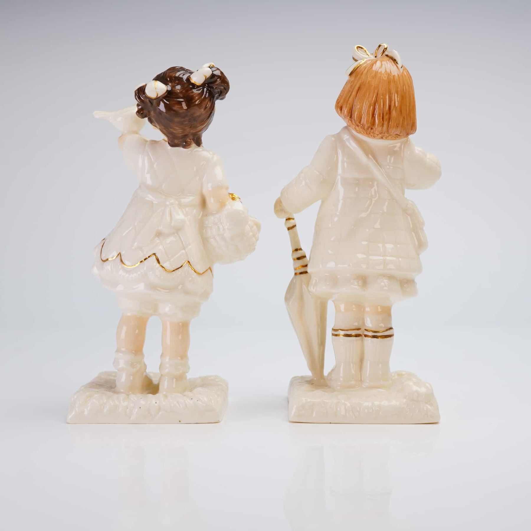 A pair of Royal Doulton hand-decorated porcelain figurines from The Ivory and Gold Collection, modeled by Nada M. Pedley and dated 1999. This 2pc group includes Summer Duet (HN 4225), depicting a young girl with a bird and flower basket, and After the Rain (HN 4226), featuring a young girl in a coat holding a closed umbrella. Both figures are finished in a characteristic ivory glaze with fine gold-gilt highlights. The undersides of the bases are fully marked with Royal Doulton backstamps, titles, and limited edition information. Summer Duet is identified as No. 480 and After the Rain as No. 295 from a total edition size of 1,500 each.