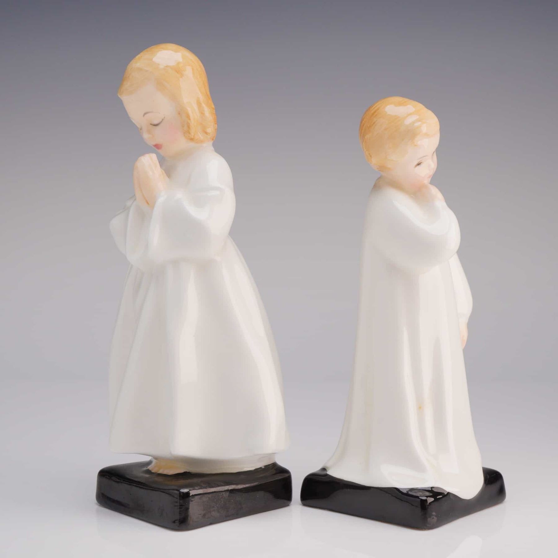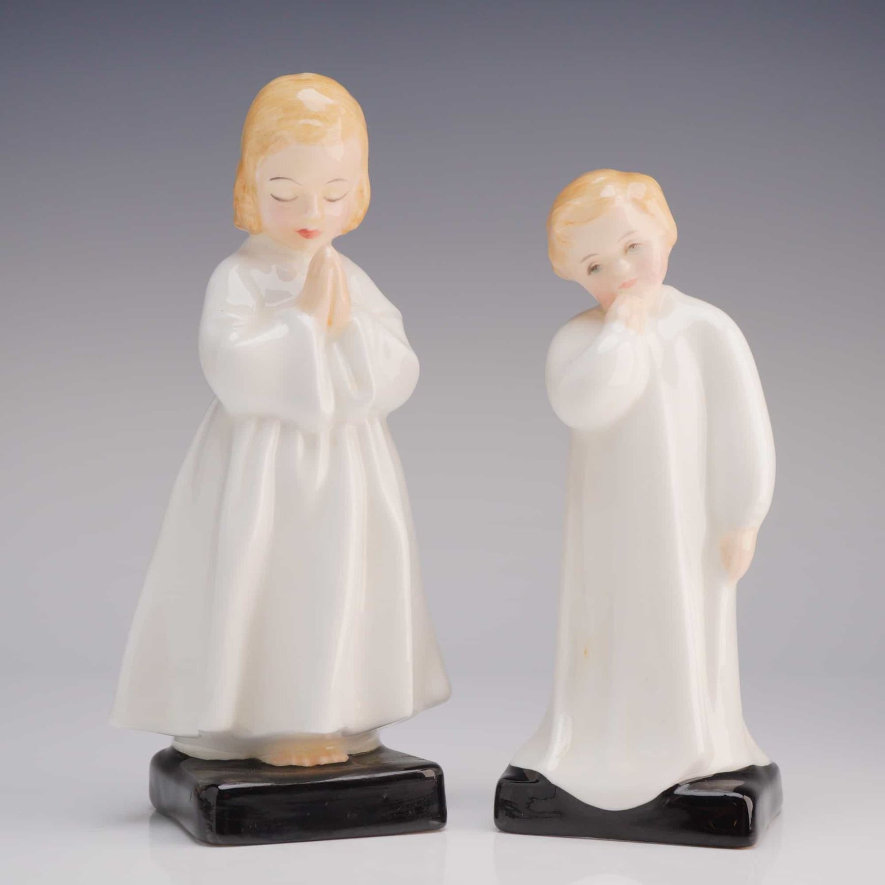The 2pc set depicts young children, modeled in white robes, standing on square black-glazed bases. The figure "Bedtime" portrays a girl with blonde hair and eyes closed, hands clasped in prayer. The figure "Darling" portrays a boy with blonde hair in a thoughtful or prayerful pose. The undersides of both bases bear the green printed Royal Doulton crown backstamp, along with the titles, respective model numbers (HN 1978 and HN 1985), and the copyright date of 1945, attributed to Doulton & Co. Limited.