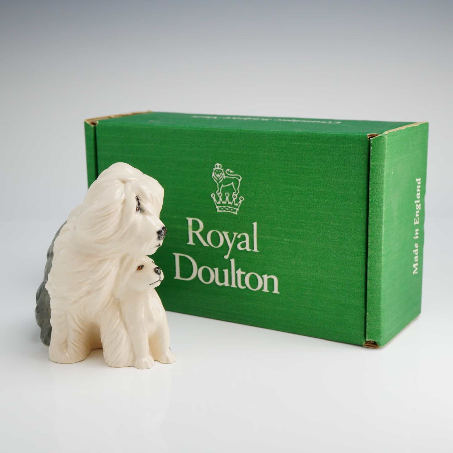 A creamy white and gray Royal Doulton Figurine, Sheepdog & Pup, marked DOULTON ENGLAND on the base, and including the original green box labeled Royal Doulton Made in England.