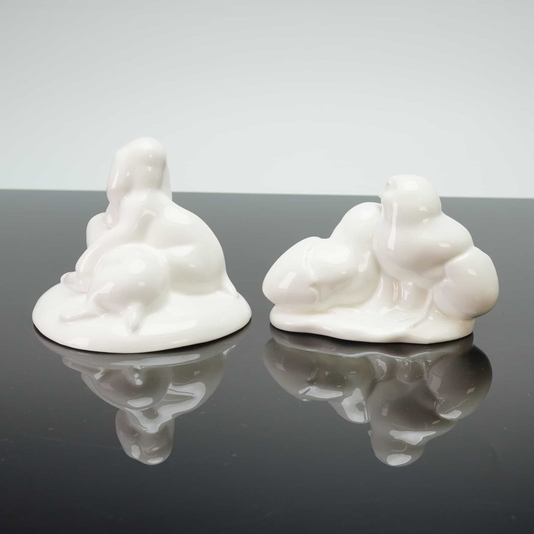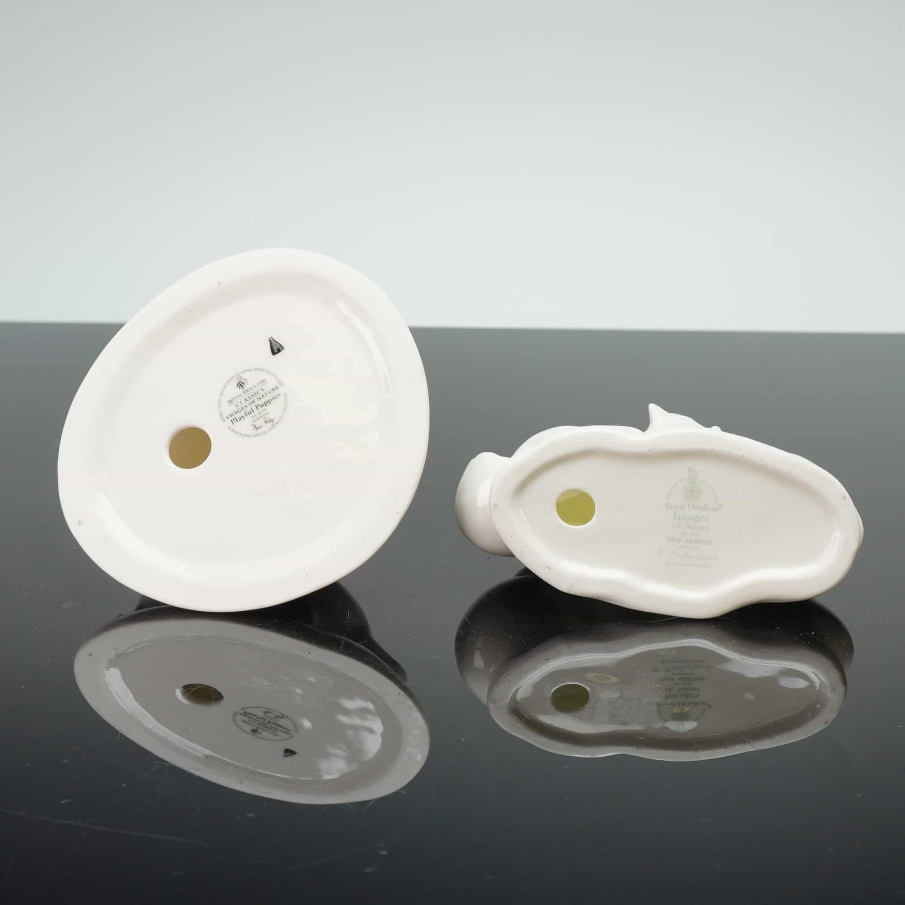 Figurines from the Images of Nature series, characterized by a minimalist and stylized aesthetic. The group includes the figurine titled Playful Puppies HN 4631, dated 2002, and a second figurine titled New Arrival HN 3551 dated 1993, depicting two young birds. New Arrival was modeled by Adrian Maslankowski. Both pieces feature a high-gloss finish and bear the official Royal Doulton backstamps, model numbers, and titles on their undersides.