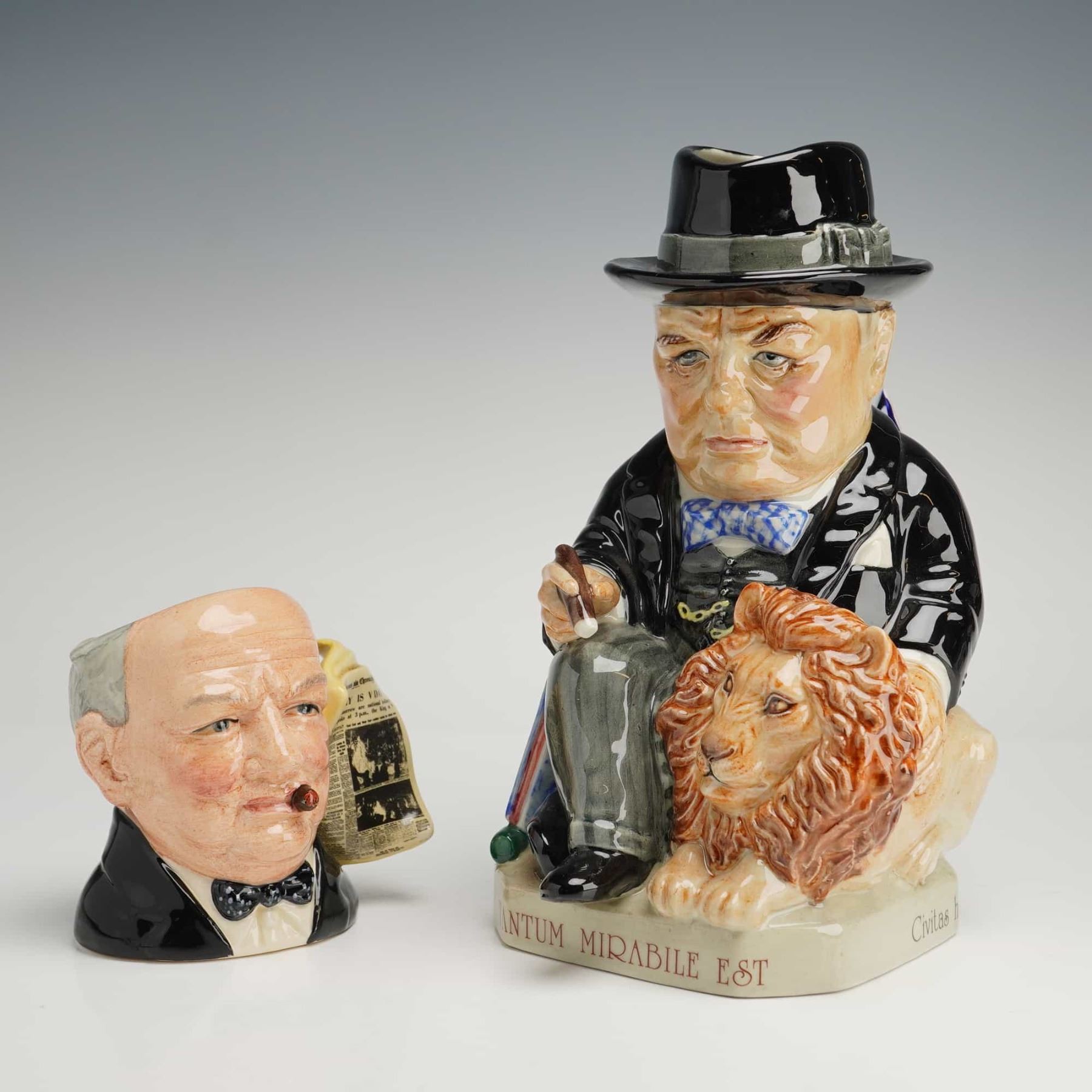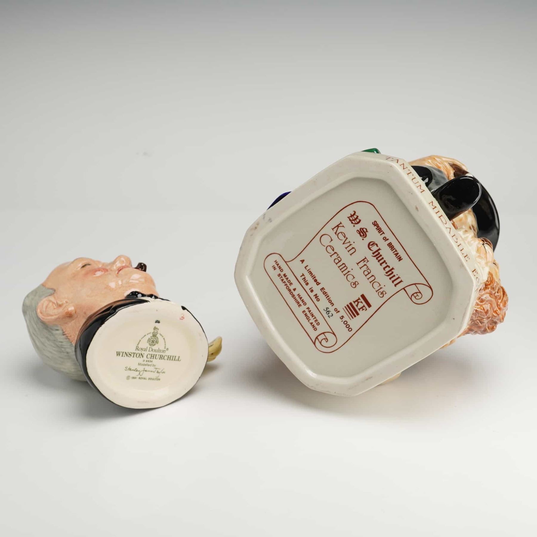 A pair of glazed ceramic commemorative items honoring Sir Winston Churchill. The lot includes a Kevin Francis Ceramics Spirit of Britain Toby jug, hand-painted in Staffordshire, England, as part of a limited edition numbered 562 of 5,000. The figure depicts Churchill in a seated pose with a cigar, a British lion at his feet, and a draped Union Jack flag, featuring Latin inscriptions on the base. Also included is a Royal Doulton character jug, model D 6934, modeled by Stanley James Taylor in 1991. This jug features a handle modeled as a rolled Daily Express newspaper with the MAY IS V-DAY headline. Both items bear official factory backstamps and markings. Dimensions based on the largest item.