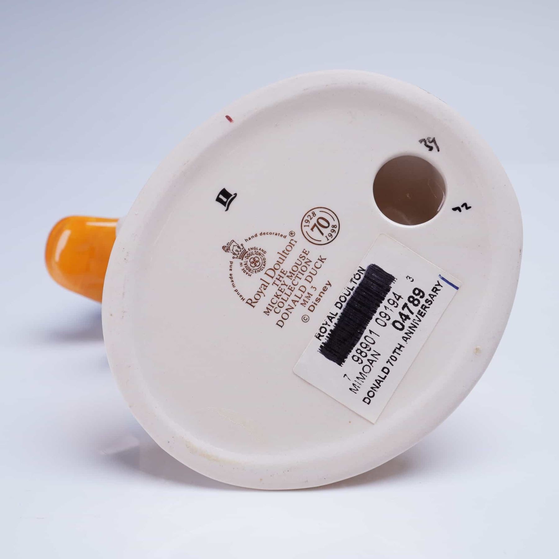 A Royal Doulton hand-decorated porcelain figurine of the Disney character Donald Duck, issued as part of The Mickey Mouse Collection to commemorate the 70th Anniversary (1928-1998). The lot includes the figurine and its original presentation box (2 items total). The figure depicts Donald Duck leaning forward aggressively, wearing his traditional blue sailor suit and cap, standing on a circular white base. The porcelain is highly glazed, decorated primarily in blue, white, and orange-yellow. The underside features printed marks reading Royal Doulton, Hand decorated, The Mickey Mouse Collection, DONALD DUCK, and (C) Disney. It also includes a circular 70th Anniversary stamp (1928-1998). The accompanying blue box repeats the Royal Doulton and Mickey Mouse Collection branding.