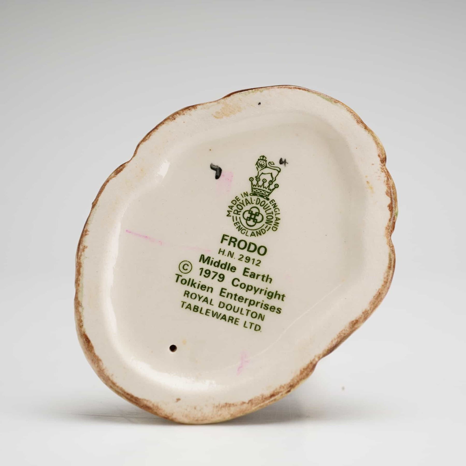 A Royal Doulton figurine of the character Frodo, model HN2912, from the Mid Earth series. This hand-painted glazed ceramic figure is depicted with reddish-brown hair, wearing a white long-sleeved shirt under a dark vest with a yellow-buckled belt and black breeches. The character is standing barefoot on a textured ground base featuring green and brown accents. The underside of the base features the official Royal Doulton backstamp in green, including the title, model number, and a 1979 Copyright Tolkien Enterprises attribution for Royal Doulton Tableware Ltd.