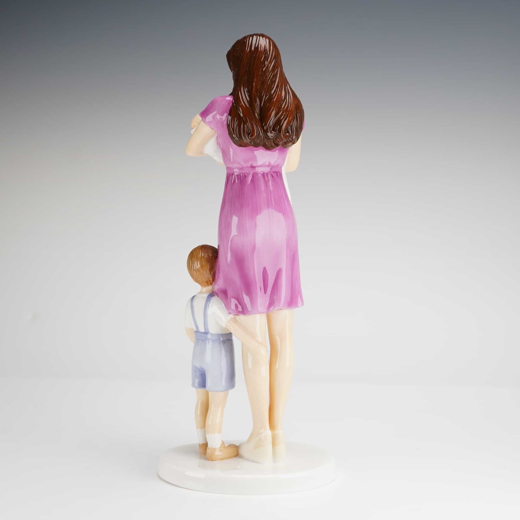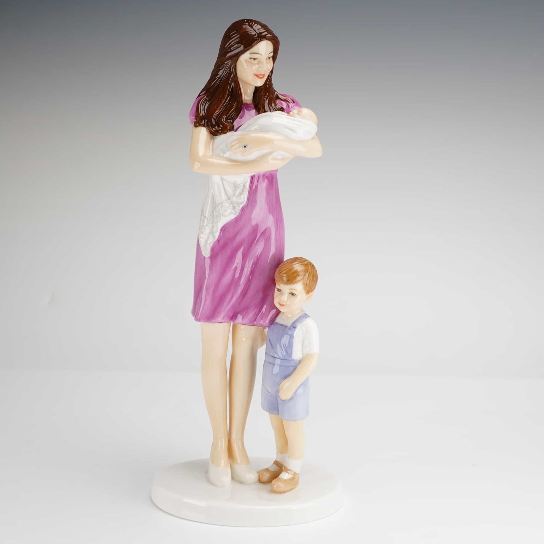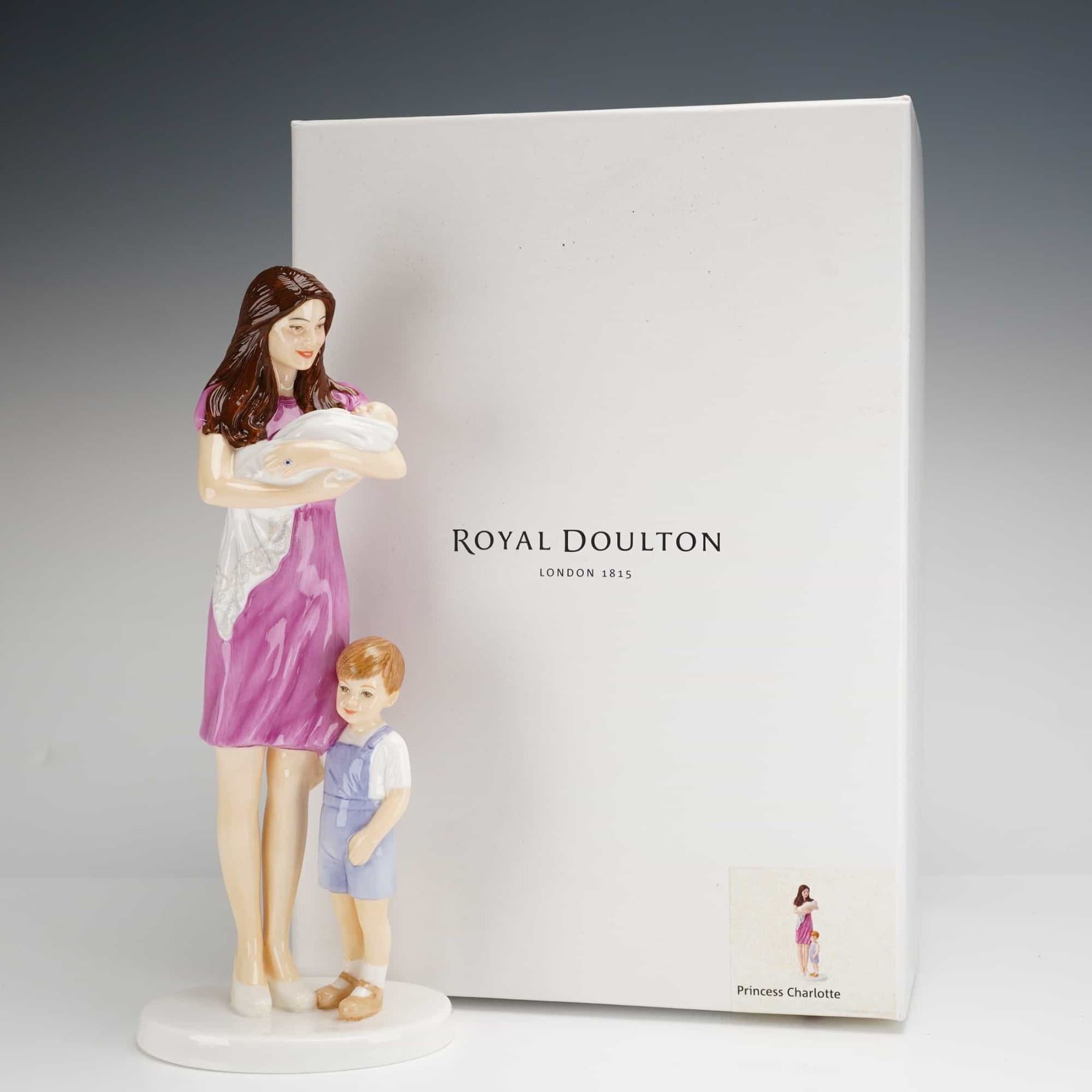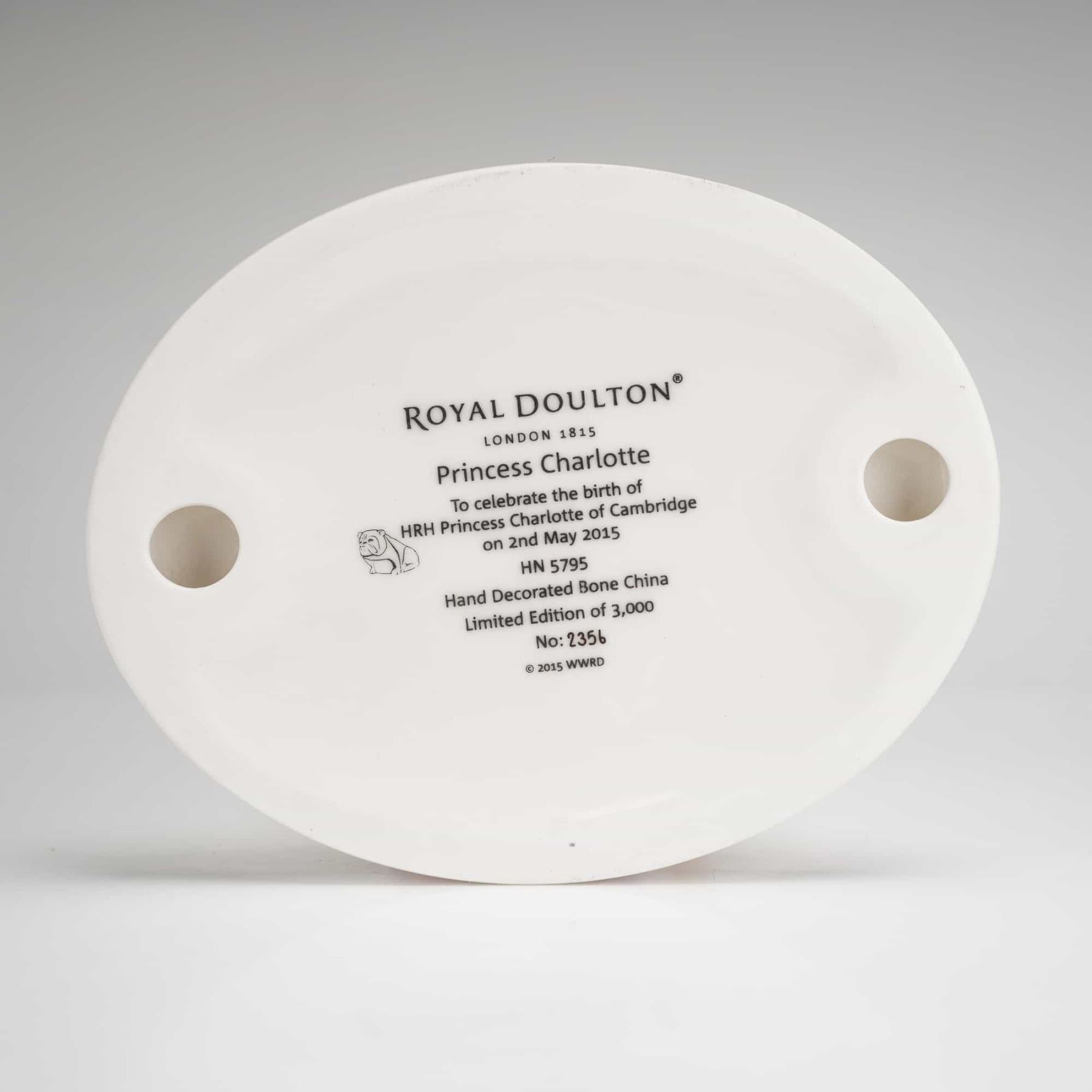 Royal Doulton Princess Charlotte HN5795 bone china figurine. This hand-decorated piece commemorates the birth of HRH Princess Charlotte of Cambridge on May 2nd, 2015. The figurine depicts Catherine, Princess of Wales, with long brunette hair in a purple dress holding the infant Princess Charlotte, accompanied by Prince George in blue overalls and a white shirt. The figures are set on an integrated white oval base. The underside features the Royal Doulton logo, model number HN5795, and identifying text. This is number 2356 from a limited edition of 300. The figurine includes its original branded white presentation box.