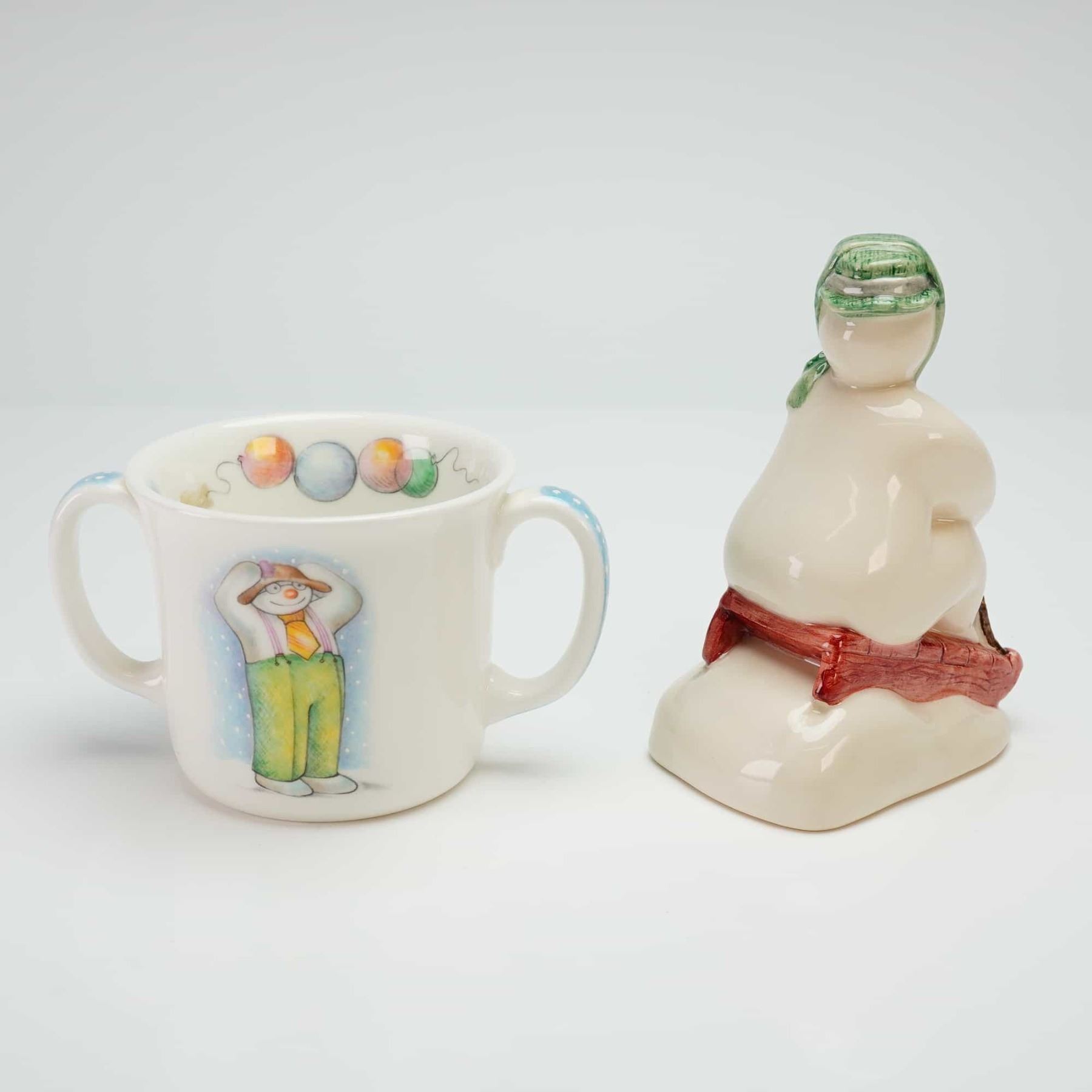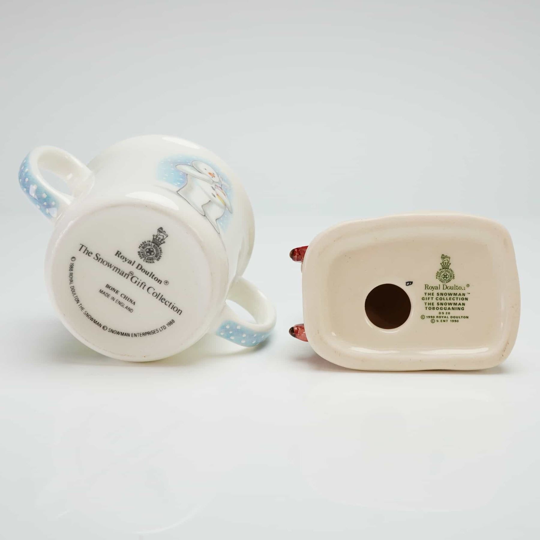 The Snowman Gift Collection was inspired by the illustrations of Raymond Briggs. The group includes a two-handled bone china mug and a hand-painted ceramic figurine. The mug, dated 1988, features character illustrations on the exterior and the inscription Christmas Celebration on the interior rim. The handles are decorated with a blue and white spotted pattern. The figurine, titled The Snowman Tobogganing DS 20 and dated 1990, depicts the character in a green hat and scarf seated on a red toboggan. Both pieces were produced in England and feature a glossy glaze finish. The bases of both items bear official Royal Doulton backstamps with specific model information and copyright dates.