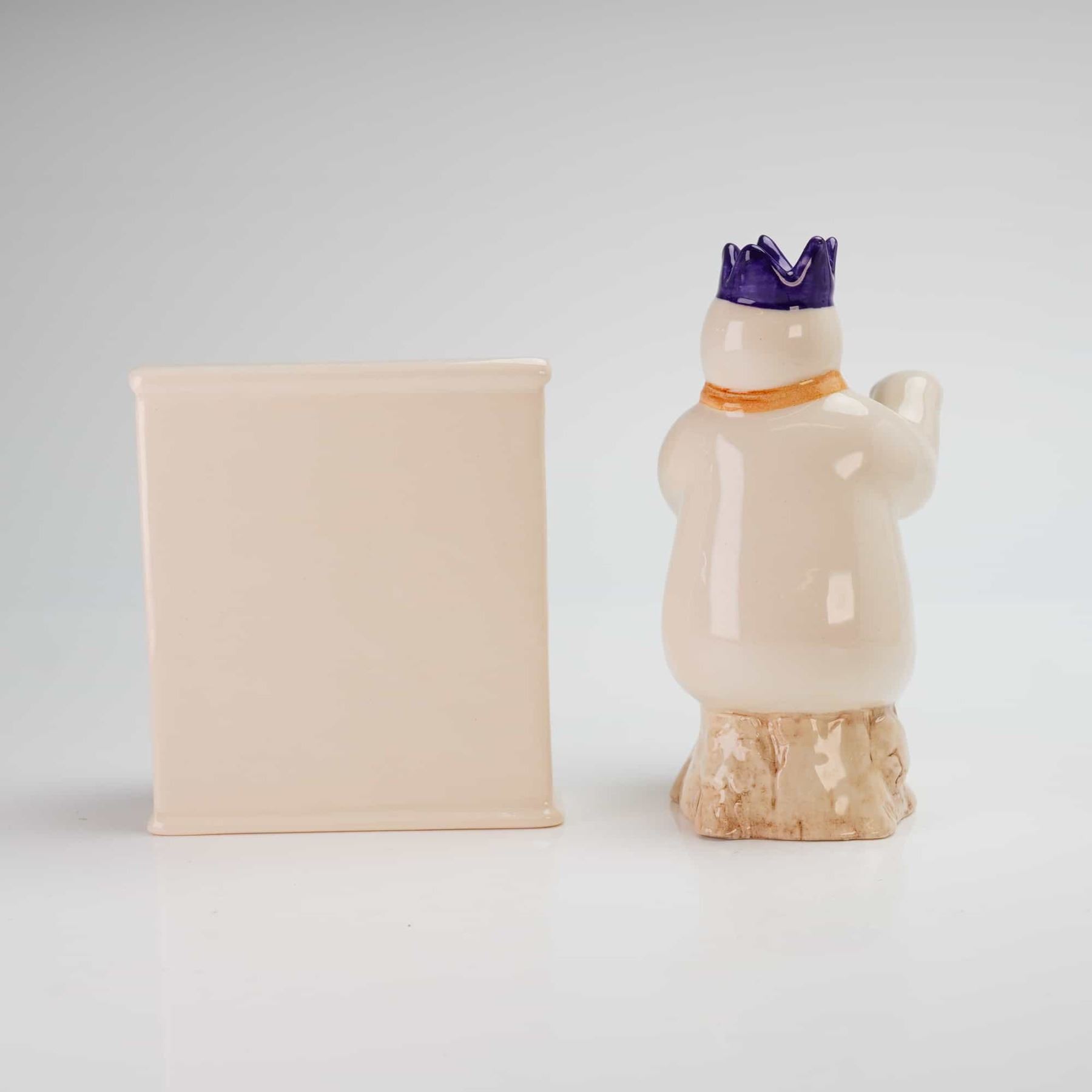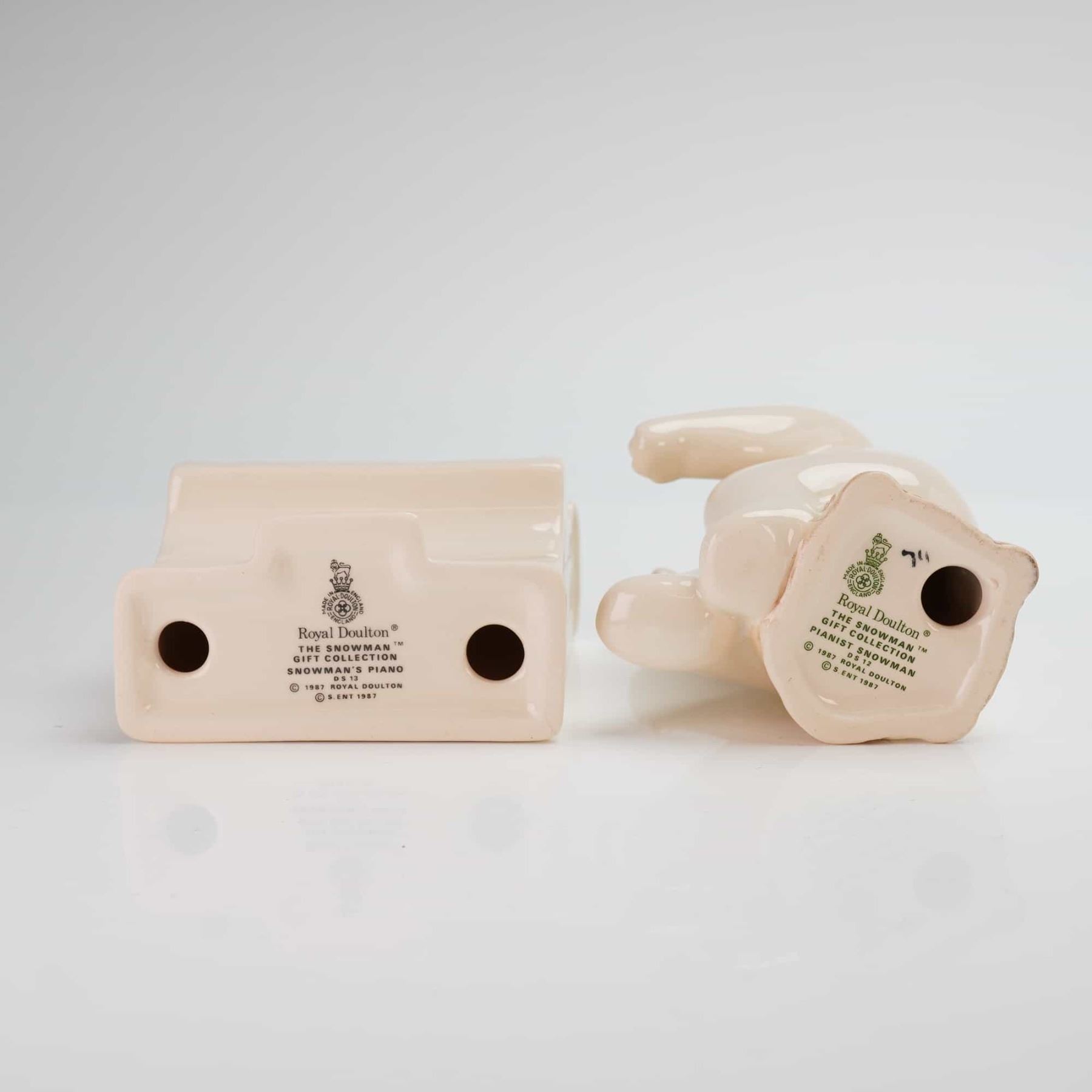 This 2pc Royal Doulton The Snowman Gift Collection includes the Pianist Snowman, model DS 12, and the Snowman's Piano, model DS 13. These glazed ceramic figurines were produced in England and are dated 1987. The set features the character seated on a log wearing a purple crown and orange scarf, accompanied by a miniature upright piano with painted black and white keys. Both pieces are finished with a high-gloss glaze and bear the official Royal Doulton backstamp on the underside, including the copyright for S. Ent. and the specific model titles.
