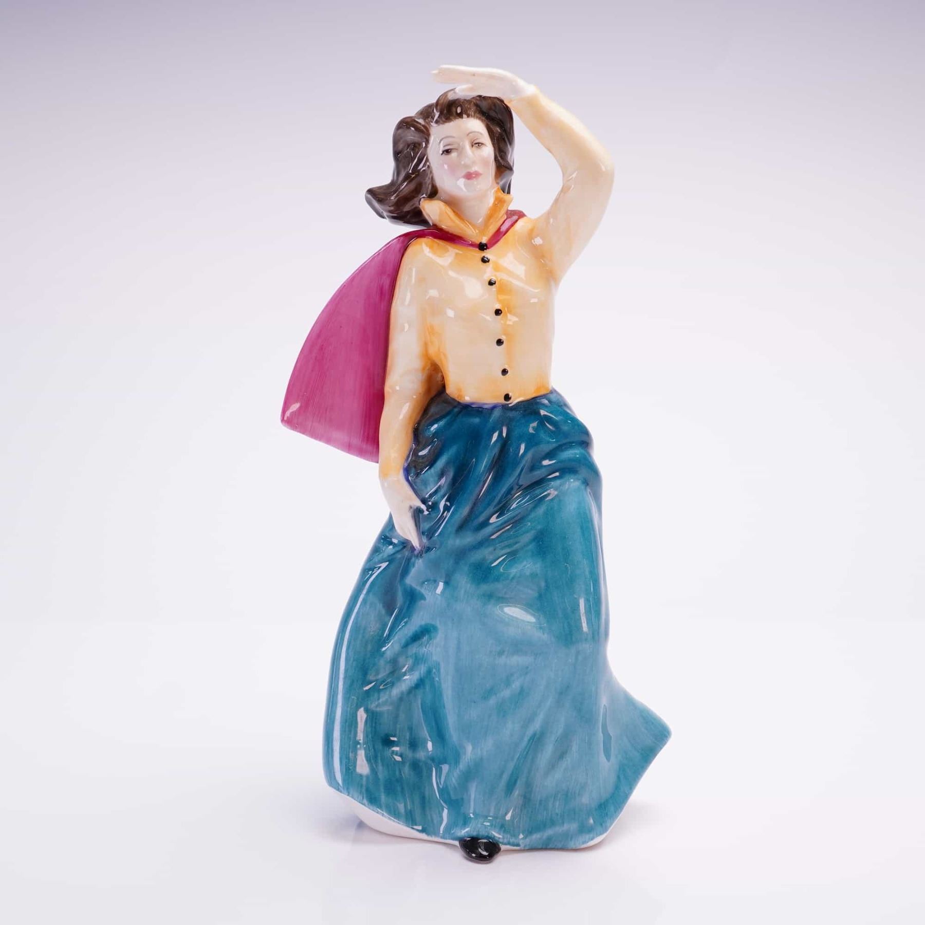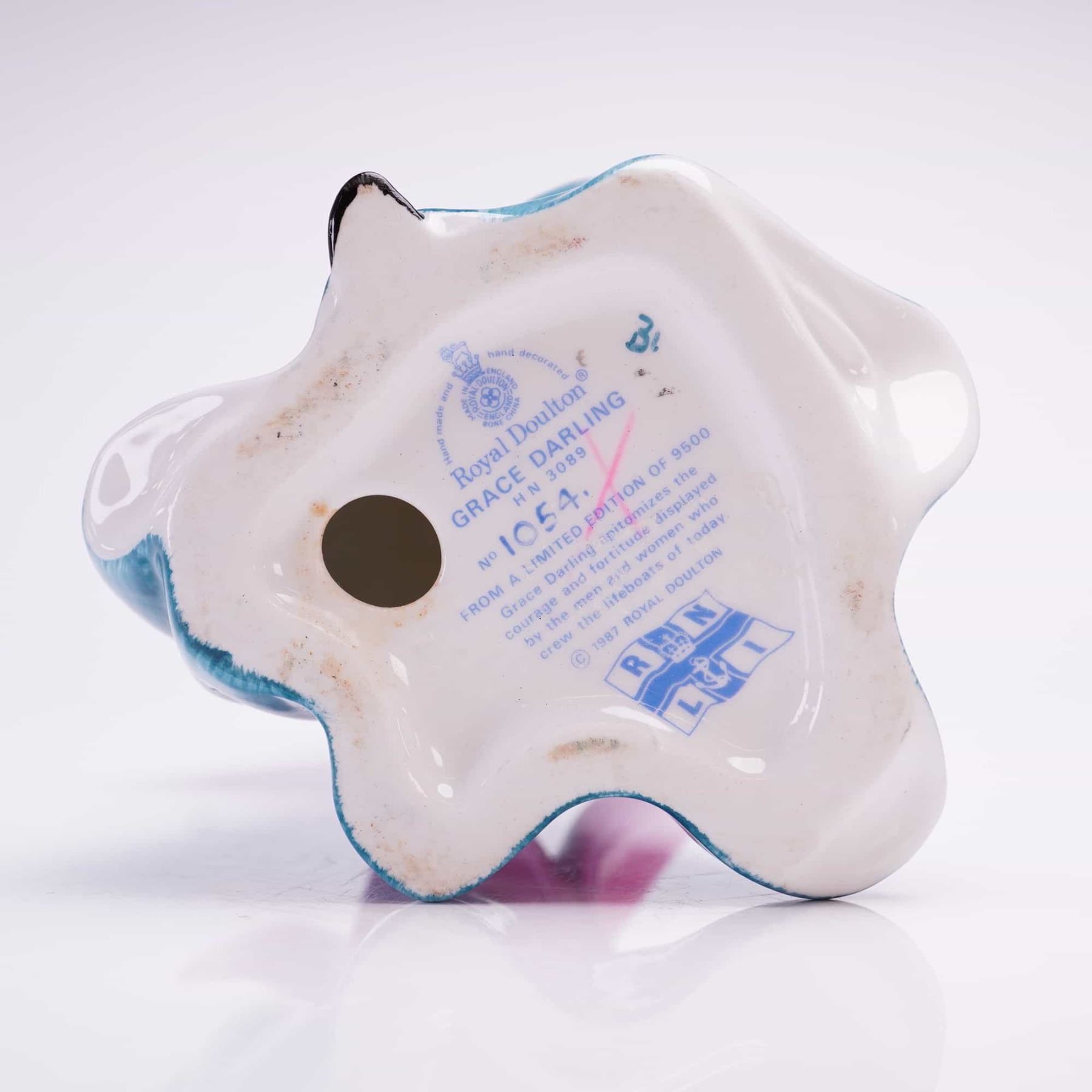 A Royal Doulton hand-painted bone china figurine titled Grace Darling, model HN3089. This piece was issued in 1987 as part of a limited edition of 9,500, produced for the RNLI. This is number 1096 of a limited edition of 9500. The figure is modeled in a standing pose wearing a yellow button-up blouse, a long teal skirt, and a magenta shawl. One hand is raised to the forehead to shield the eyes. The underside features a comprehensive Royal Doulton backstamp, the RNLI logo, and text detailing the historical significance of the maritime heroine.