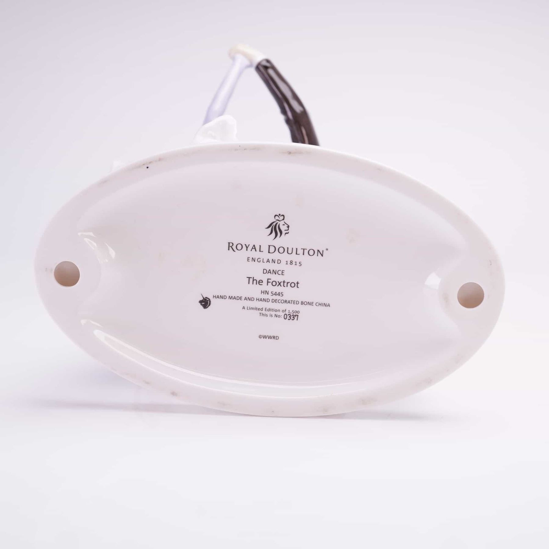 A Royal Doulton limited edition bone china figurine titled The Foxtrot HN5445 from the Dance collection. This hand-made and hand-decorated piece depicts a ballroom dancing couple in Art Deco-style formal attire. The male figure is wearing a black tuxedo and the female figure is in a flowing lavender gown with a matching feathered headband and opera-length gloves. The underside of the white oval base bears the Royal Doulton lion and crown backstamp, along with the title, model number, and a limited edition designation. This item is number 0337 out of a limited edition of 1,500.