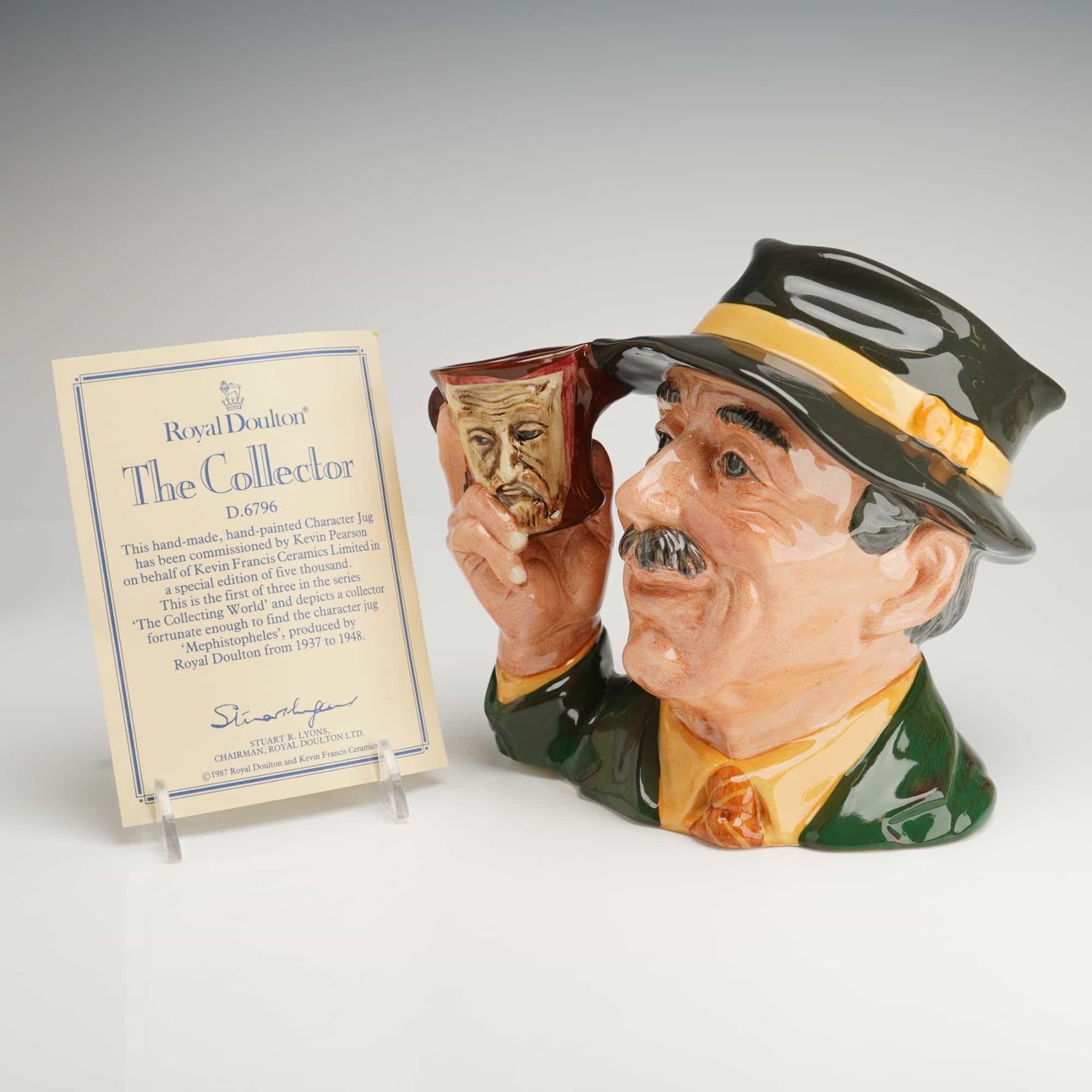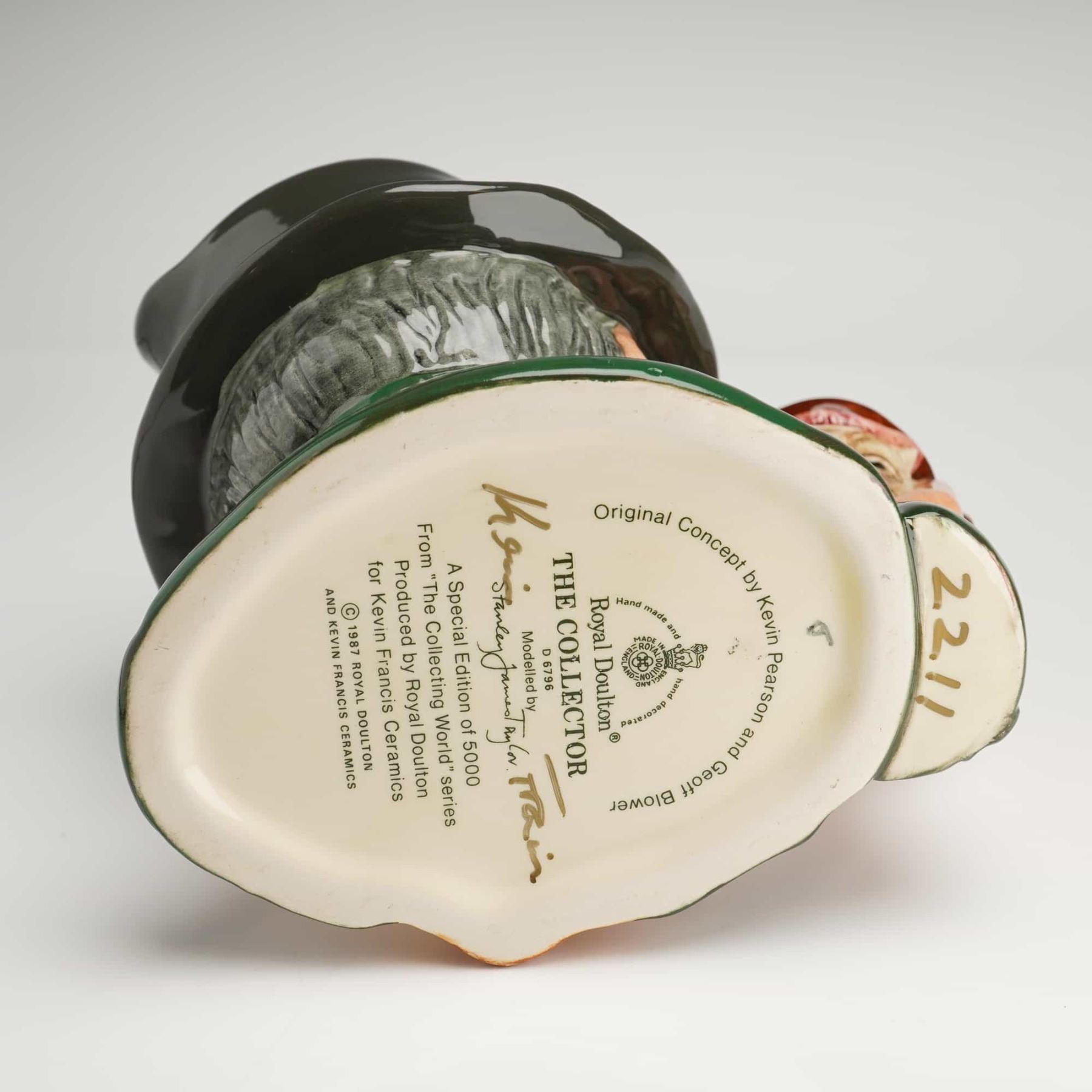 A Royal Doulton glazed ceramic character jug D6796 titled The Collector, part of The Collecting World series produced for Kevin Francis Ceramics. This hand-made and hand-painted piece depicts a smiling gentleman with a gray mustache, dressed in a green jacket and a hat with a yellow band, holding a miniature Mephistopheles character jug. The base features comprehensive backstamps, including the Royal Doulton maker mark, signatures for modeler Stanley James Taylor and concept creators Kevin Pearson and Geoff Blower, and text identifying it as a special edition of 5,000, with a handwritten edition number of 2,211. This item is dated 1987 and is accompanied by a corresponding printed certificate of authenticity.