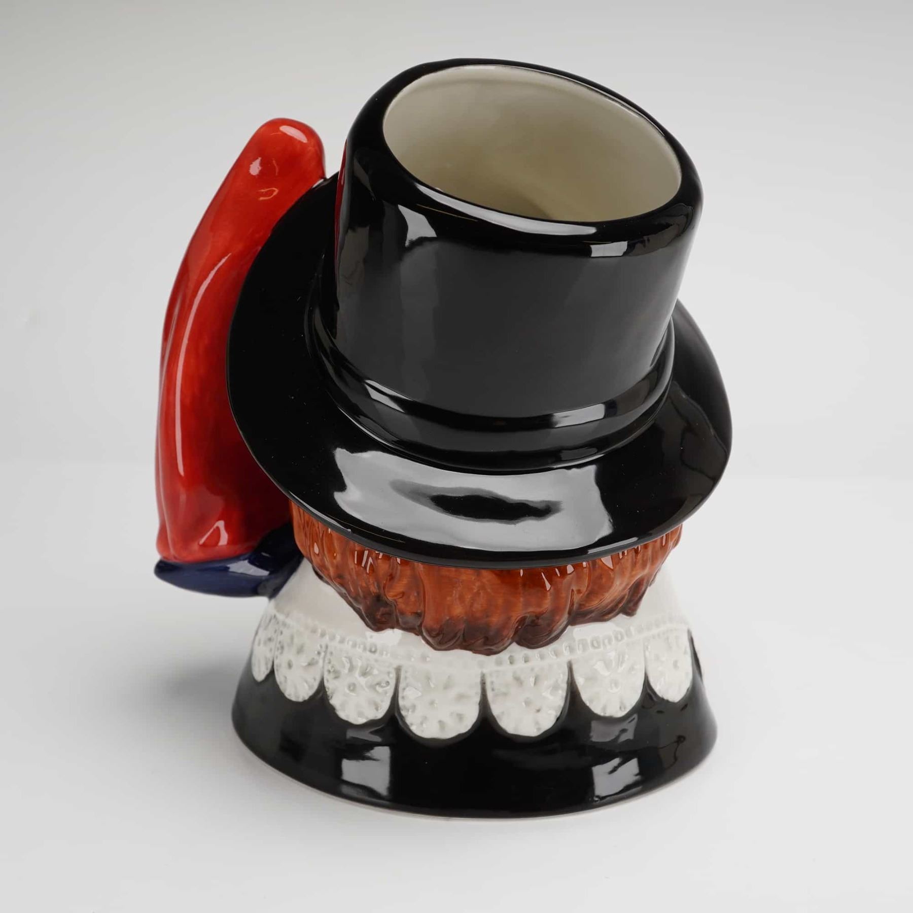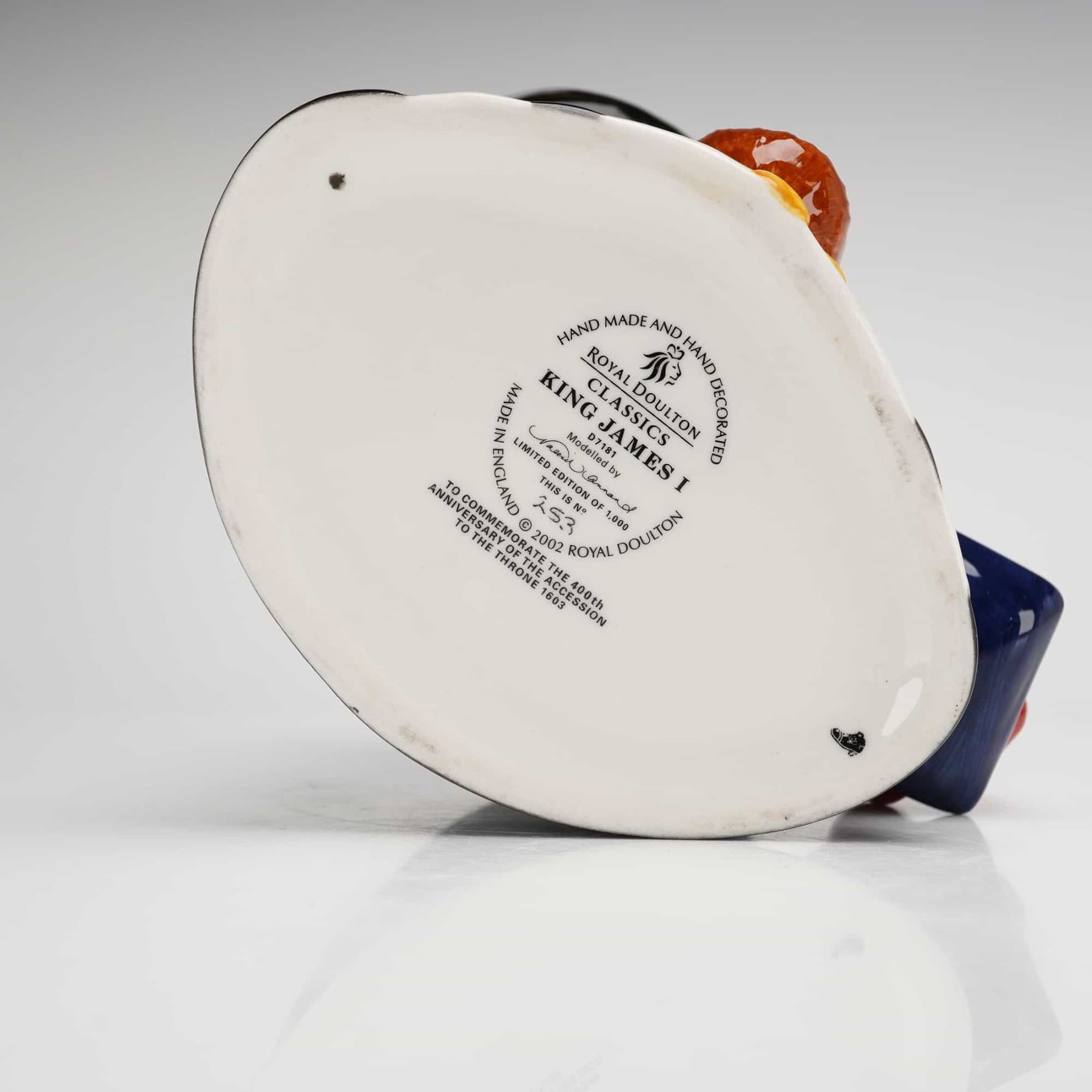 A Royal Doulton Classics limited edition character jug of King James I, model D7181, modeled by Valerie Annand. This commemorative ceramic piece was issued in 2002 to mark the 400th anniversary of the King's accession to the throne in 1603. The hand-made and hand-decorated glazed jug features a bust-length portrait of the monarch wearing a tall black hat with a jeweled ornament and a detailed white lace ruff. The handle is modeled as the sovereign's orb resting on a blue cushion with red drapery. The base is fully marked with the Royal Doulton logo, title, and model number, and indicates this specific piece is number 253 from a limited edition of 1,000. The item is presented in its original Royal Doulton cardboard box.