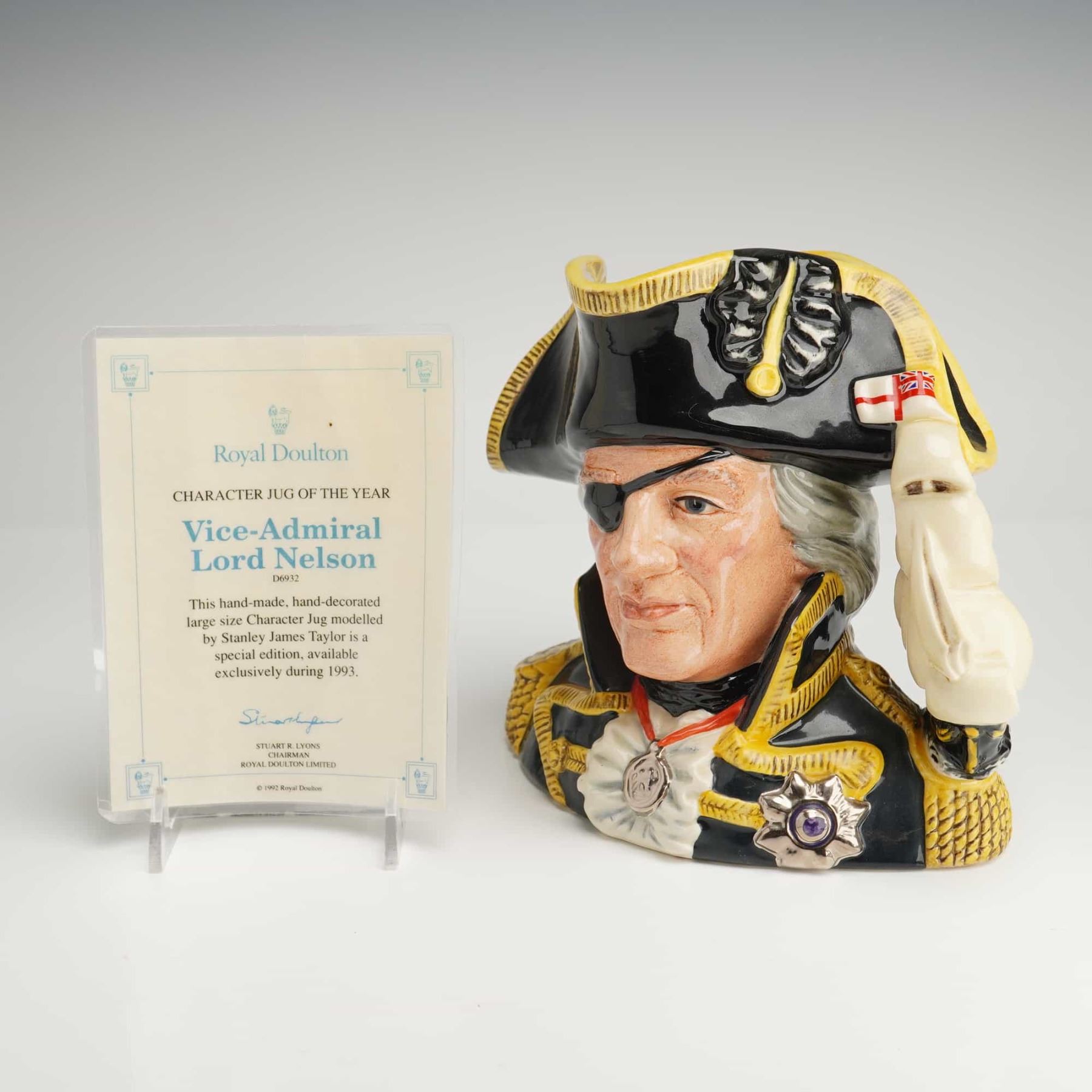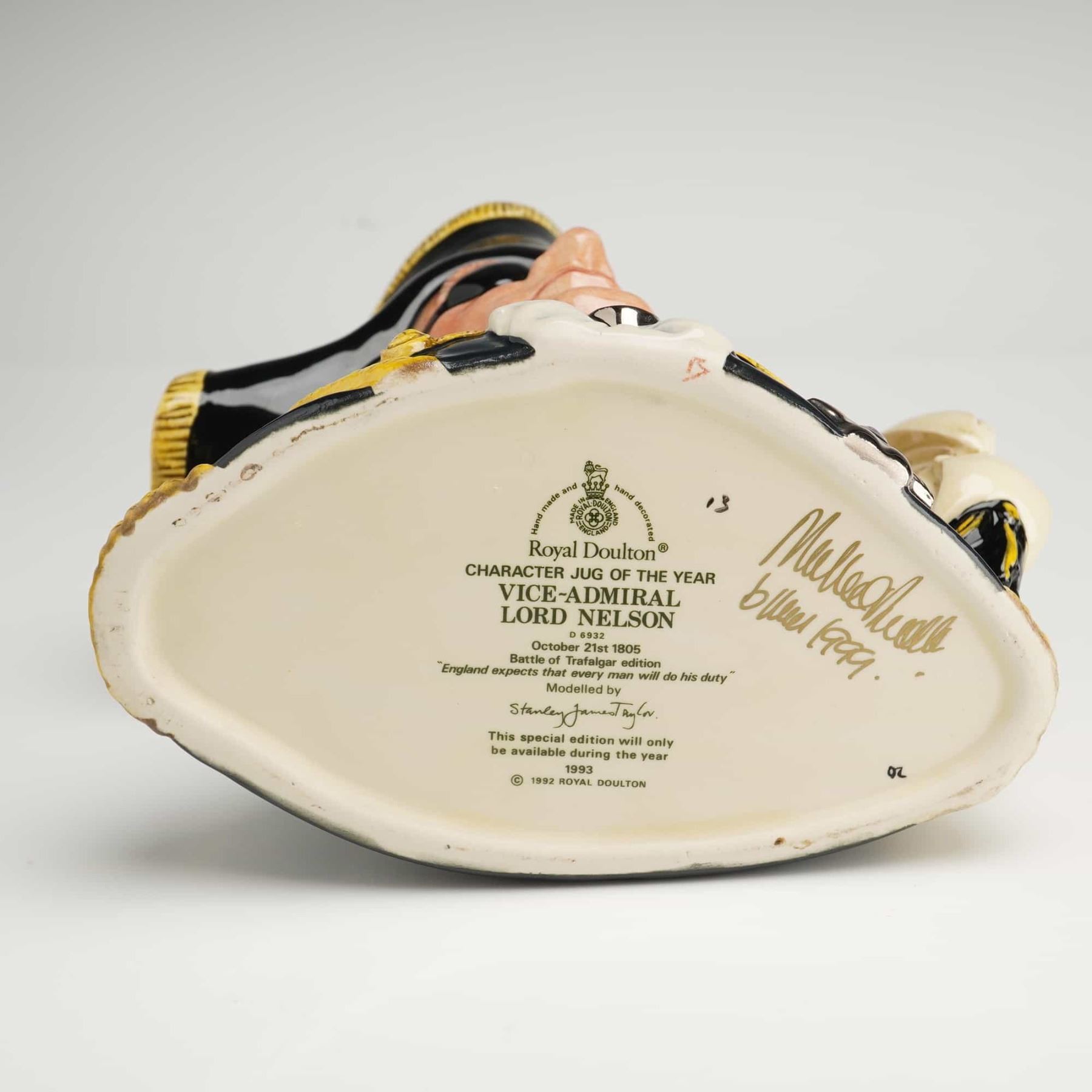 This Royal Doulton ceramic character jug, titled Vice-Admiral Lord Nelson (D6932), is a Character Jug of the Year special edition released in 1993. Modeled by Stanley James Taylor, the piece depicts the naval commander in a dark blue and gold-trimmed uniform with a bicorne hat and eyepatch. The handle is formed in the shape of a ship's mast and sails flying a Union Jack. The underside carries the official Royal Doulton backstamp with commemorative text for the Battle of Trafalgar and is further marked with a hand-written signature in gold-toned ink reading Michael Doulton 1999. The item is accompanied by a printed certificate of authenticity.