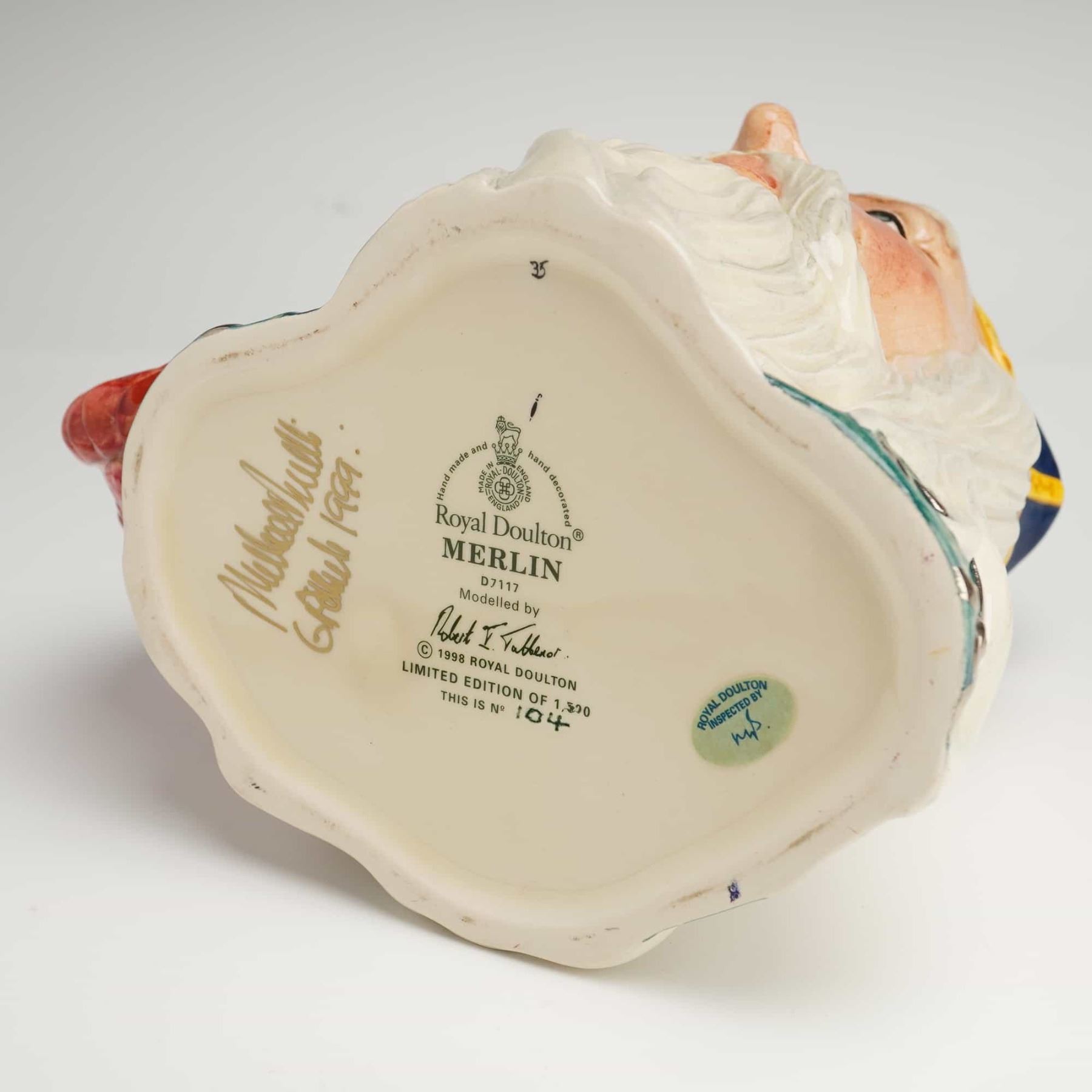A Royal Doulton D7117 Merlin large character jug, professionally modeled by Robert I. Tabbenor. This glazed ceramic piece depicts the legendary wizard with a flowing white beard and a blue cap adorned with a yellow celestial band. The handle is formed by a red dragon, with Merlin's hand clutching a silver-toned sword near the base. The underside bears the official Royal Doulton backstamp, the model name, and the model number. The base also features a handwritten signature in gold ink from Michael Doulton dated March 6, 1999. This item is identified as number 104 from a limited edition of 1,500.