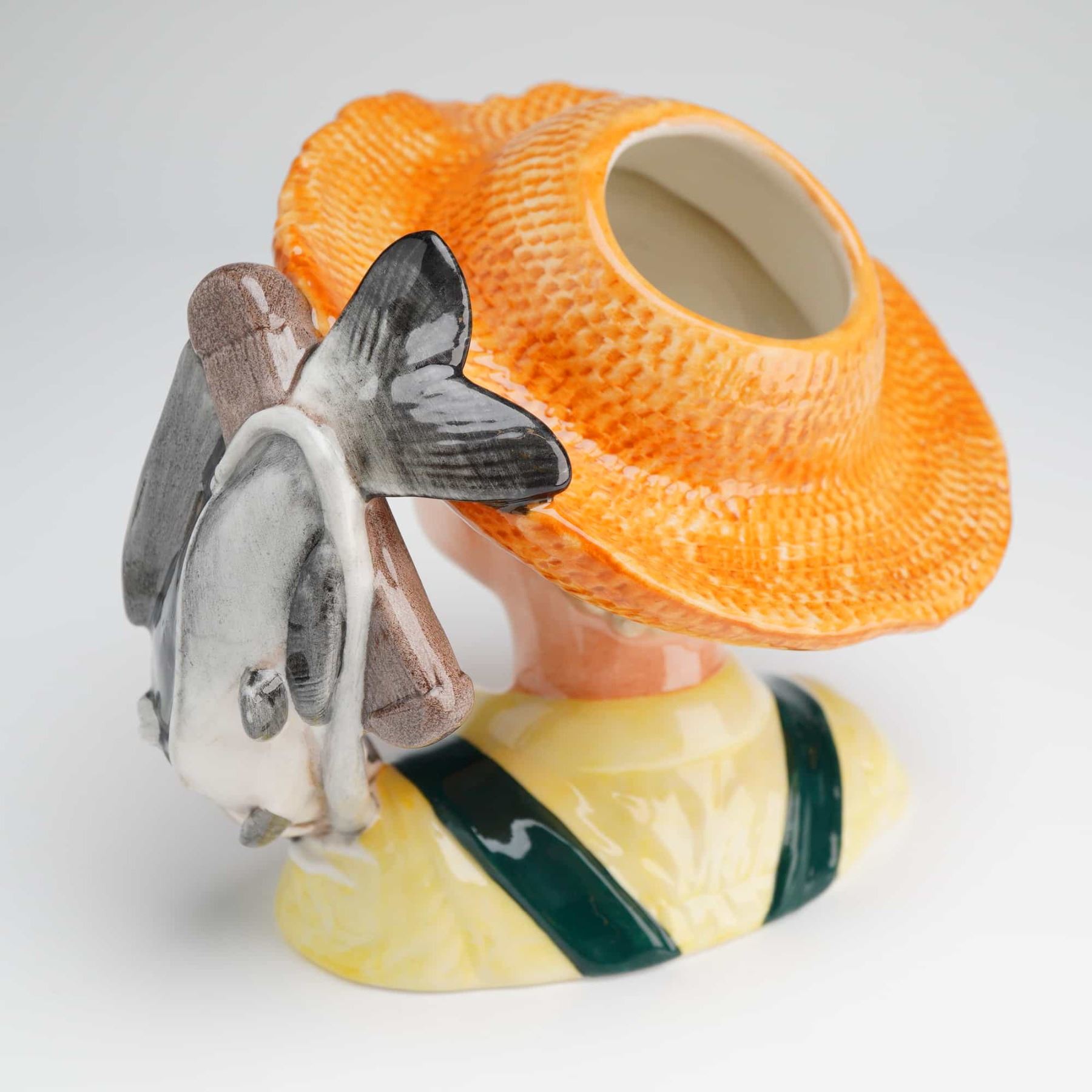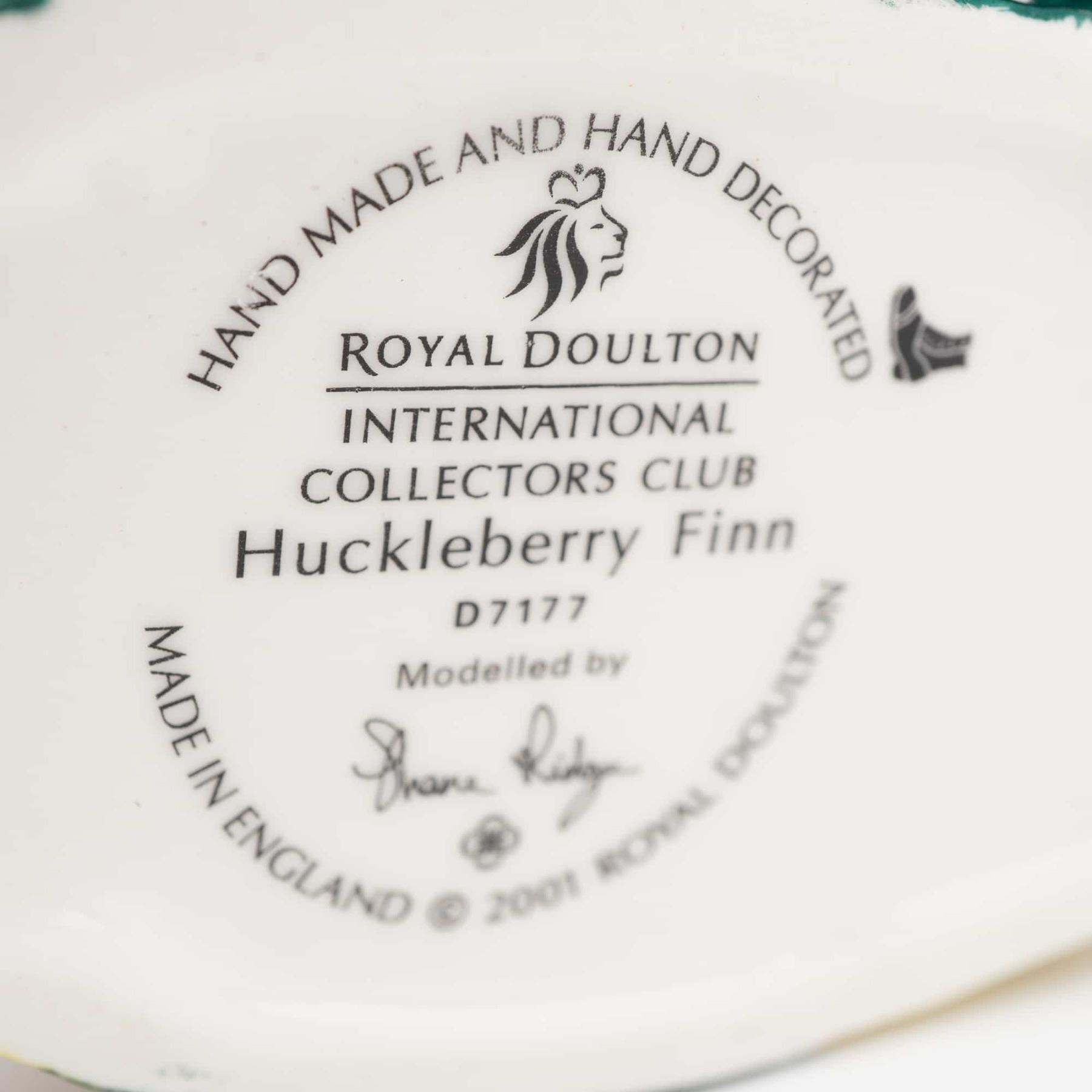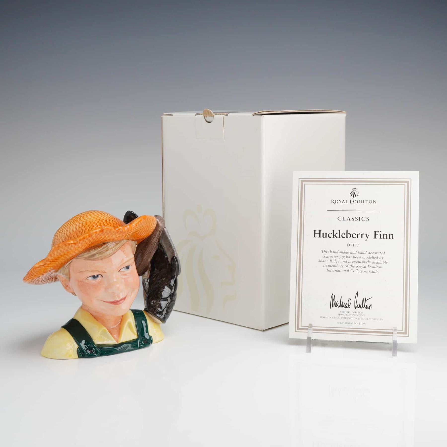 A Royal Doulton Character Jug, Huckleberry Finn (D7177), modeled by Shane Ridge in 2001, featuring a boy in an orange straw hat, complete with its original white box and International Collectors Club certificate.