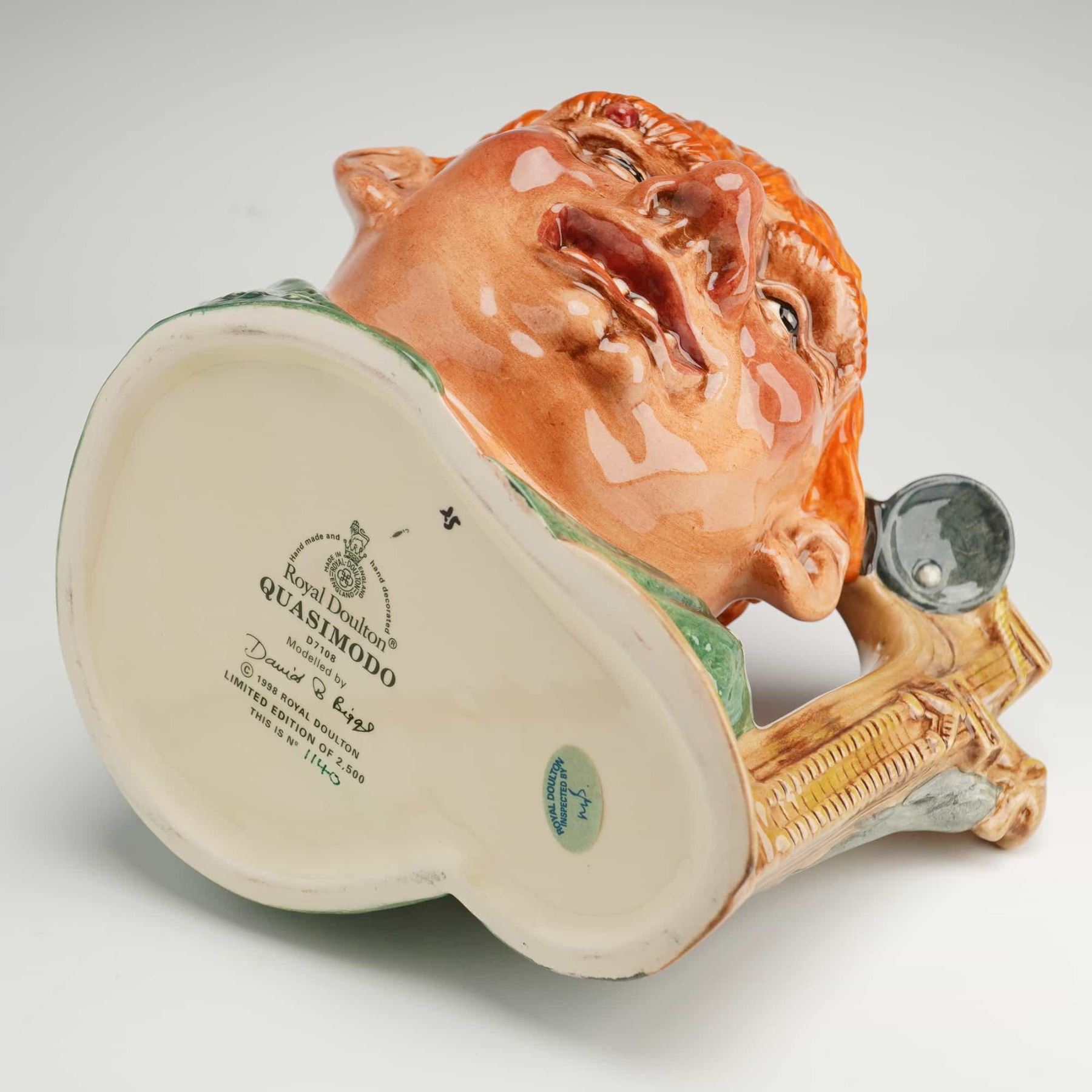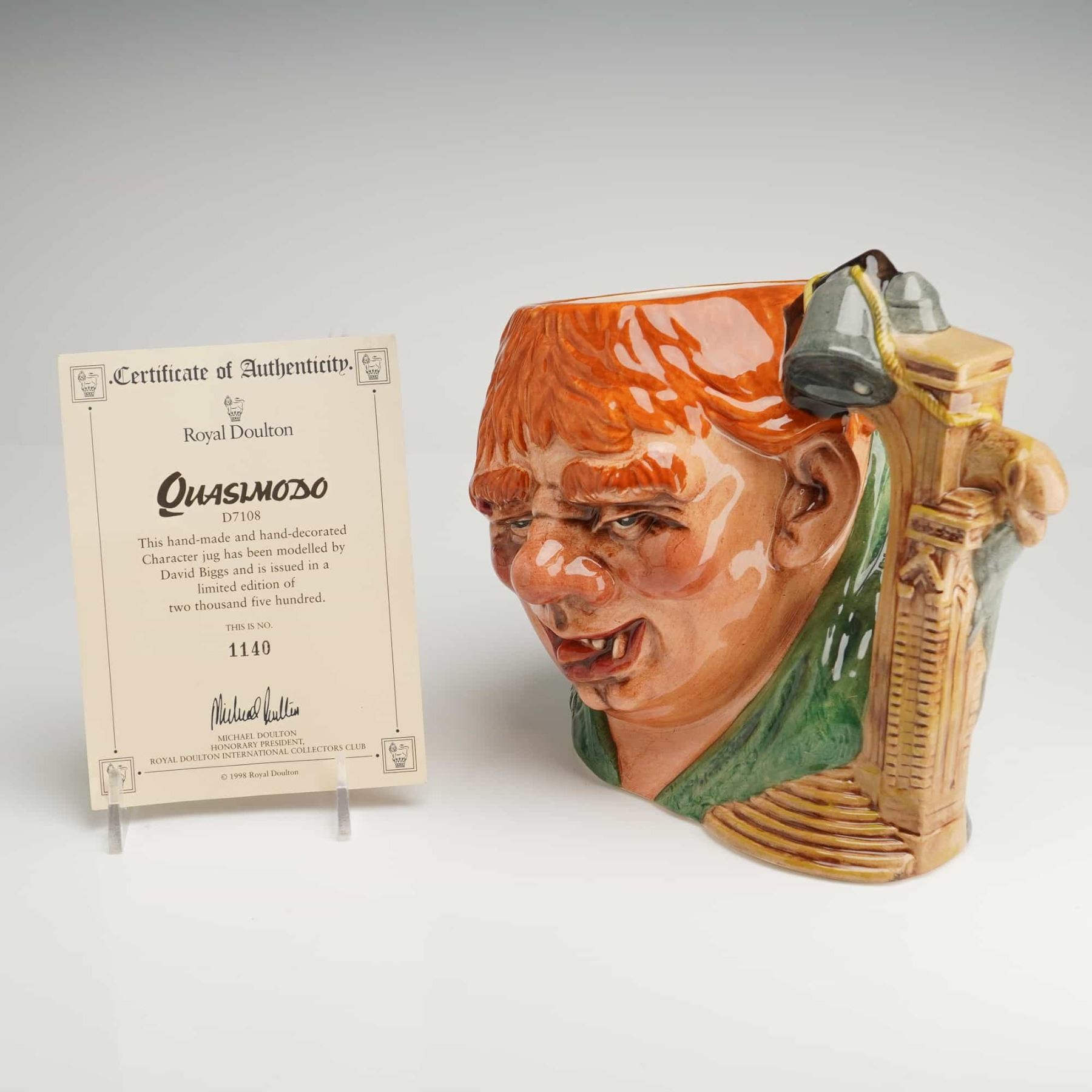 Royal Doulton character jug D7108, Quasimodo, modeled by David Biggs. This hand-decorated glazed ceramic jug was issued in 1998 as part of a limited edition of 2,500. The piece features the character with orange hair and a green tunic, with a handle modeled as a gothic architectural element with two bells suspended by rope. The base is marked with the official Royal Doulton backstamp and the limited edition number 1140. The lot includes a matching Certificate of Authenticity.