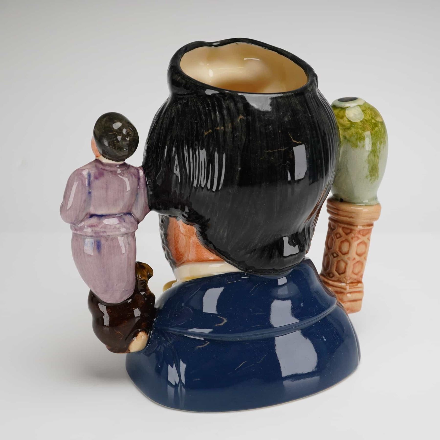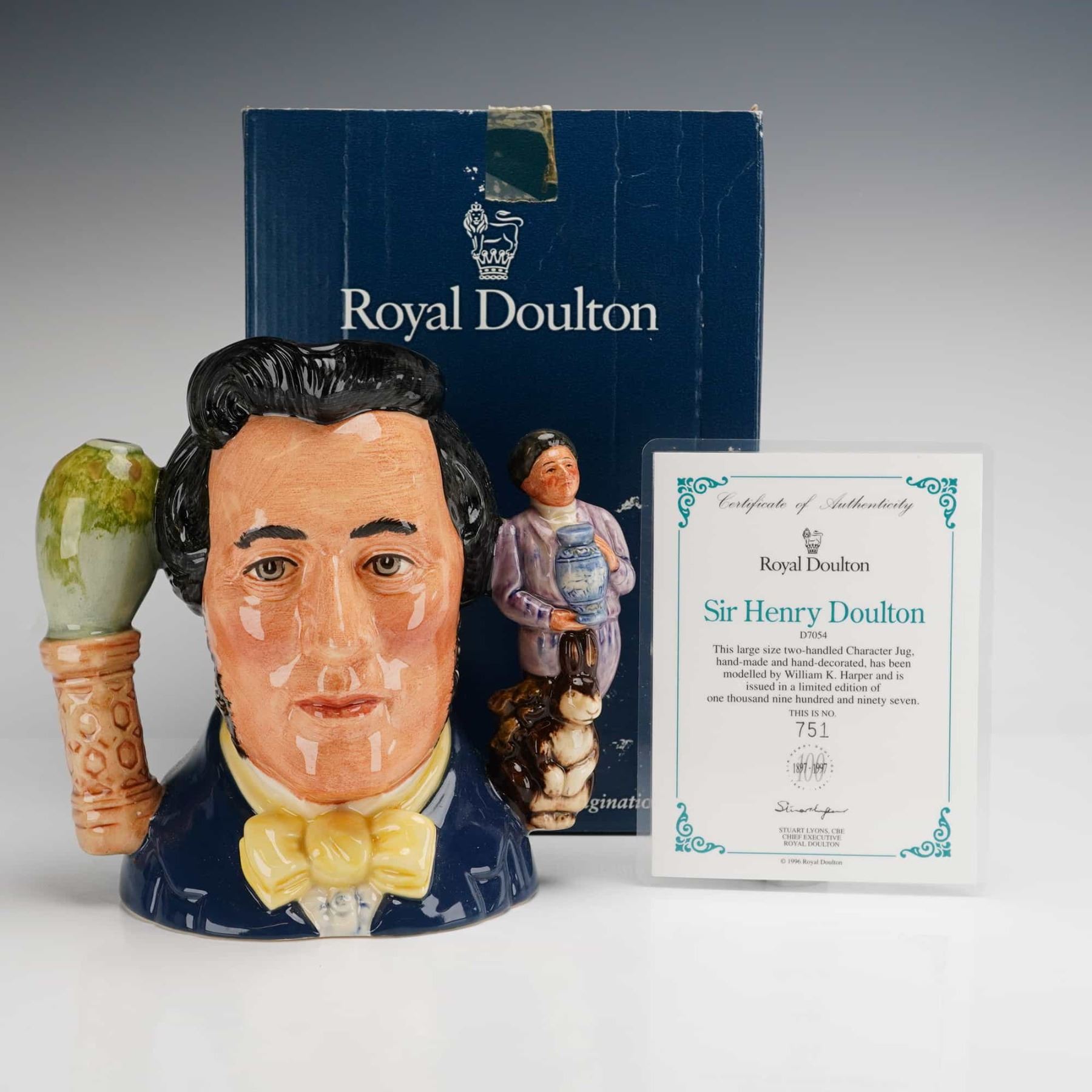 This Royal Doulton character jug, model D7054, depicts Sir Henry Doulton and was issued in 1996 to commemorate the 100th anniversary of the death of Sir Henry Doulton 1897-1997. Modelled by William K. Harper, the hand-decorated ceramic jug features Sir Henry in a navy coat and yellow bow tie. The vessel is designed with two unique handles: one depicting a female potter with a vase and rabbit, and the other an architectural column with a mottled green glaze. The underside is fully marked with the Royal Doulton backstamp, model details, and the limited edition number 751 of 1,997. The item is presented with its original blue manufacturer box and a matching numbered certificate of authenticity.