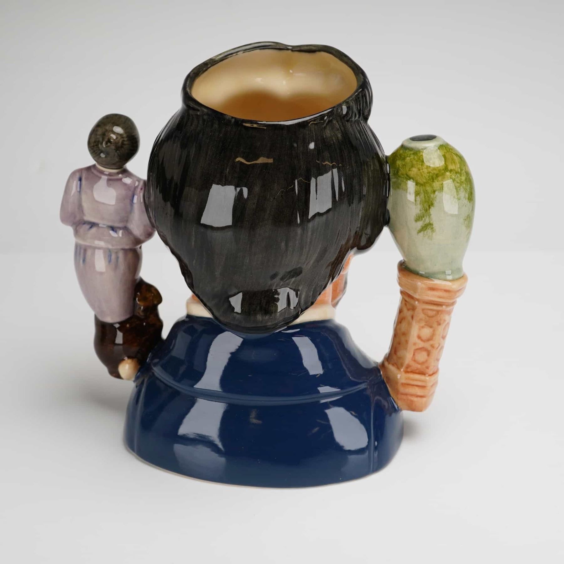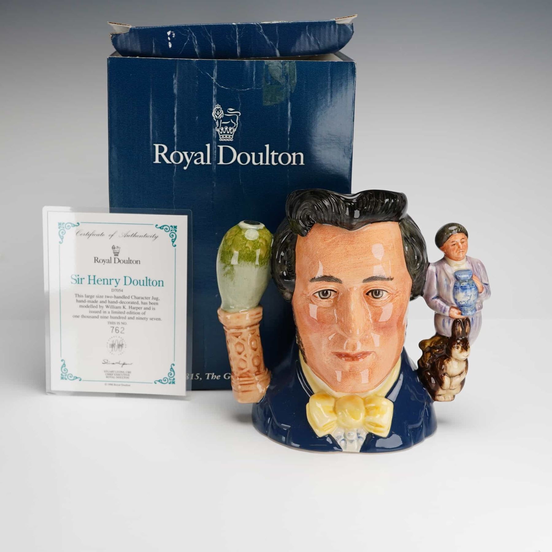 This large Royal Doulton two-handled character jug, model D7054, depicts Sir Henry Doulton and was modeled by William K. Harper to commemorate the 100th anniversary of the death of Sir Henry Doulton 1897-1997. The glazed ceramic jug features a hand-painted portrait of Sir Henry in a navy coat and yellow bow tie. The vessel is flanked by two decorative handles: one depicting a potter at work with a rabbit, and the other a green-glazed vase on a patterned plinth. The base is fully marked with the Royal Doulton backstamp and identifies this piece as number 762 from a limited edition of 1,997. The item is accompanied by its original Certificate of Authenticity and original branded box.