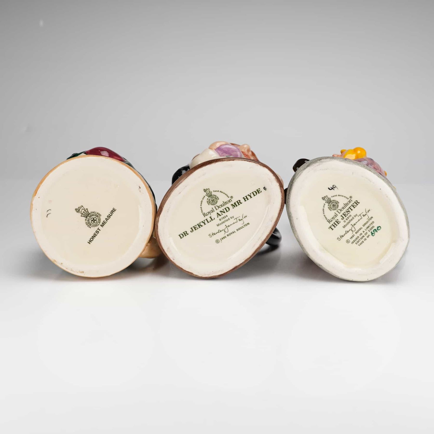 A collection of three Royal Doulton character jugs crafted in hand-decorated glazed ceramic. The group includes Dr. Jekyll and Mr. Hyde D7024, a double-sided piece modeled by Stanley James Taylor and dated 1995, portraying the dual-natured character. Also included is Honest Measure Small D6108, depicting a seated man in an 18th-century tricorne hat and green coat holding a tankard and long-stemmed pipe. The third item is The Jester D6910, also modeled by Stanley James Taylor and dated 1991, identified as a limited edition number 690 of 2,500. Each jug features vibrant colors and detailed modeling. The undersides bear full manufacturer marks, titles, and modeler attributions.