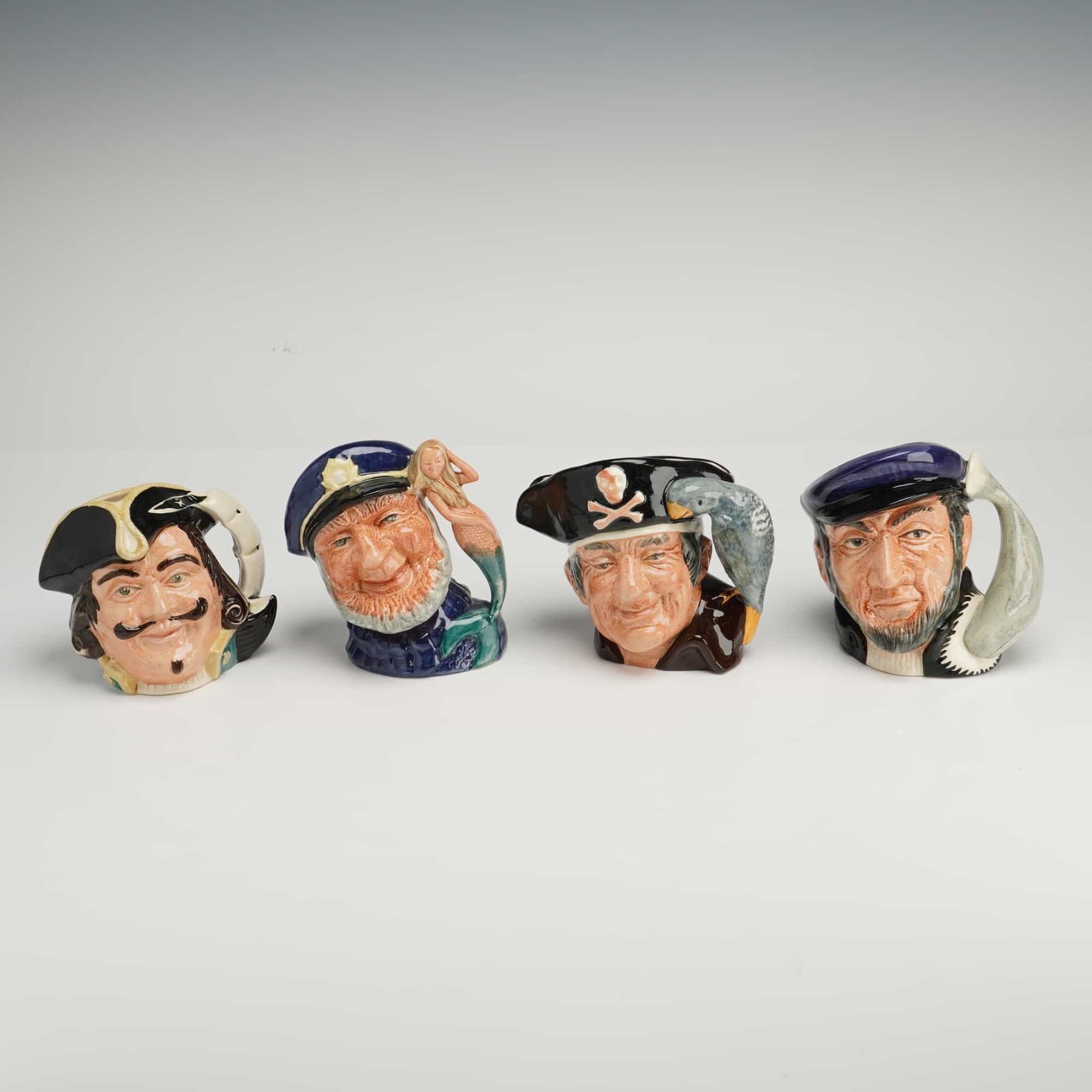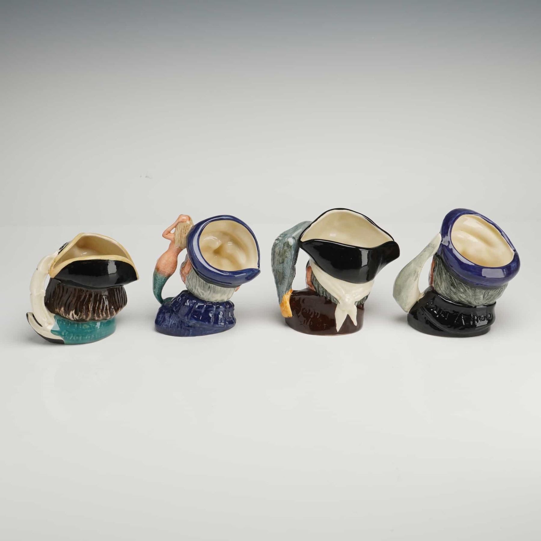 This collection consists of 4pc Royal Doulton character jugs including models D6554, D6469, D6506, and D6386. These glazed ceramic figures feature maritime and pirate themes, specifically depicting Captain Henry Morgan, Old Salt, Long John Silver, and Captain Ahab. Each jug is designed with character-specific molded handles, such as a mermaid for Old Salt and a parrot for Long John Silver. The bases are marked with the Royal Doulton backstamp.