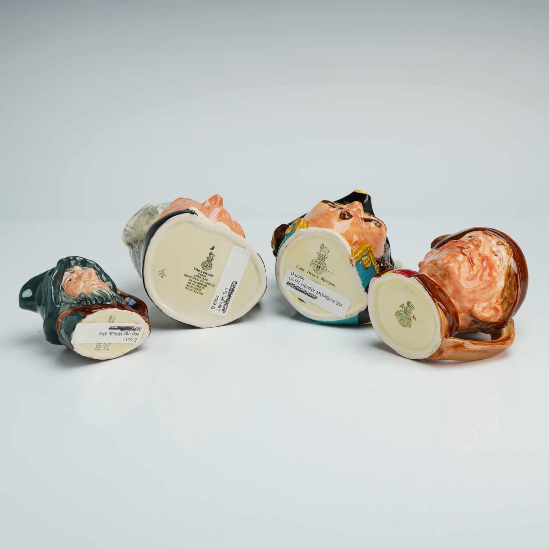 A collection of four Royal Doulton ceramic character jugs featuring hand-painted glazed finishes. The group includes the models Arry D6235, Rip Van Winkle D6517, Capt Henry Morgan D6469, and Lawyer D6504. The Lawyer is depicted with a powdered wig and a quill-form handle, while Captain Henry Morgan is shown in a bicorne hat with a bone-form handle. Rip Van Winkle features a bearded face and green hat, and Arry is modeled wearing a brown cap. Each jug is marked with the Royal Doulton lion and crown backstamp on the base along with their respective model numbers and names. These pieces represent the small and miniature scales of the Royal Doulton character jug line, showing vibrant colors and traditional craftsmanship.