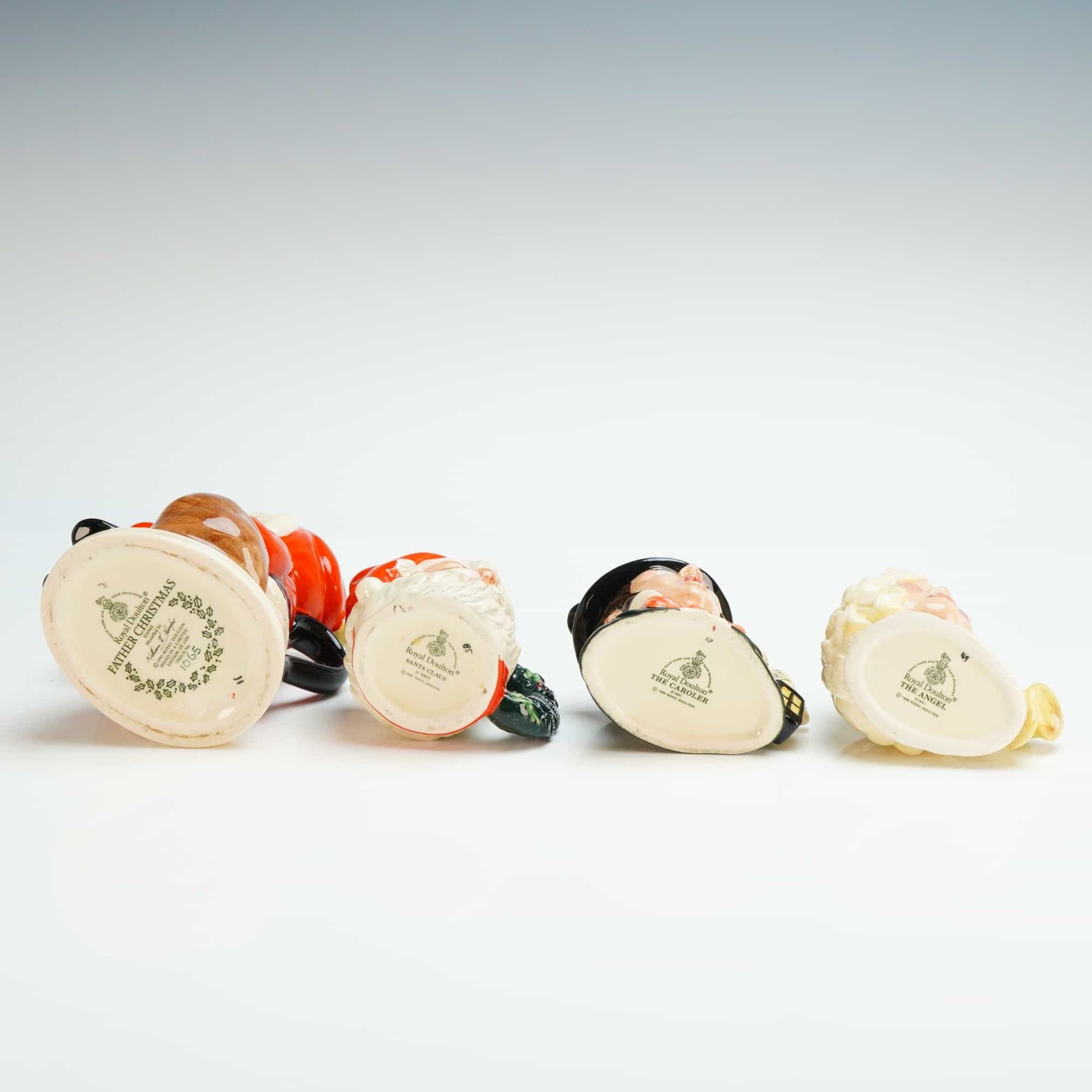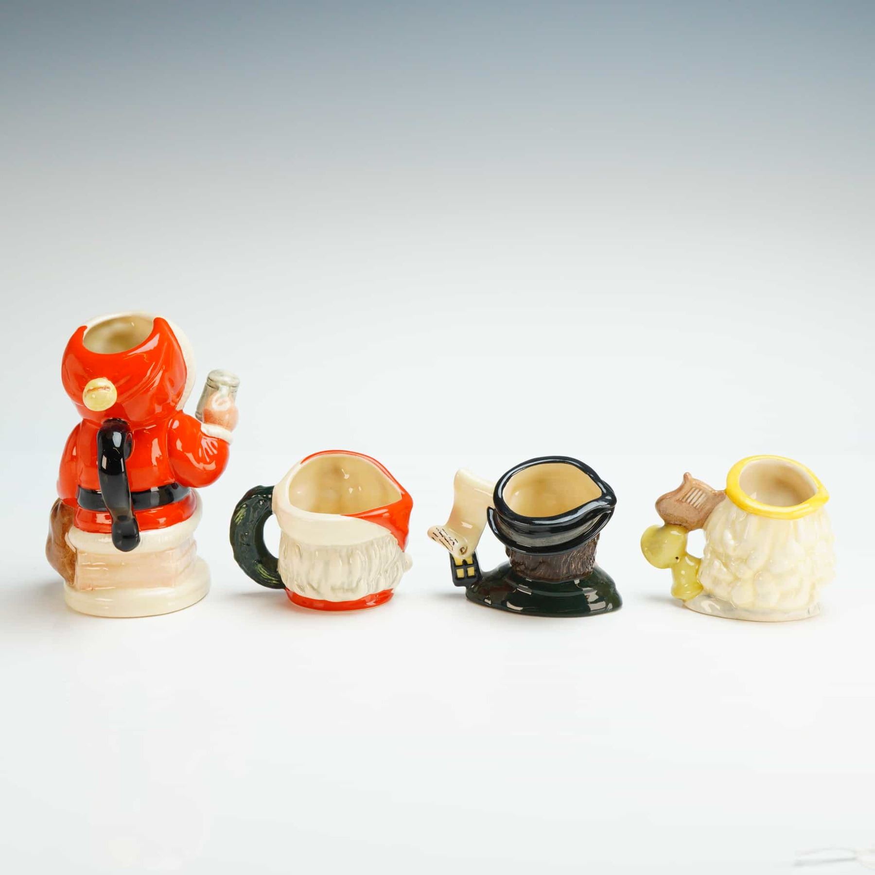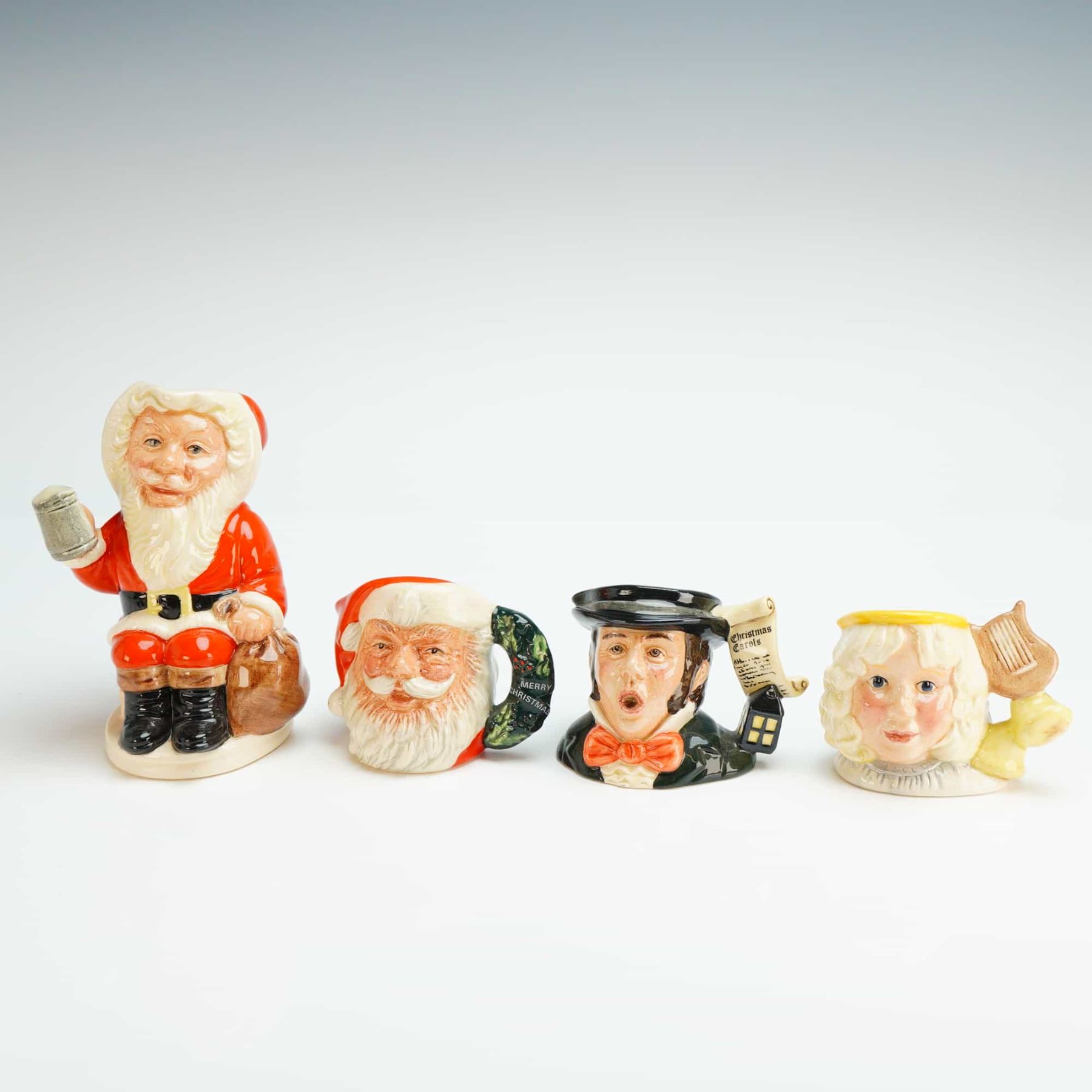 The group includes one full-figure Father Christmas D6940 Toby jug (copyright 1991) depicted in a traditional red suit with a sack and tankard. The three miniature character jugs comprise Santa Claus D6900 Mini (copyright 1981) featuring a holly wreath handle inscribed Merry Christmas; The Caroler D7007 Mini (copyright 1995) wearing a top hat and holding a Christmas Carols scroll; and The Angel D7051 Mini (copyright 1996) with a yellow halo and harp-shaped handle. Each item is finished with a high-gloss glaze and bears the official Royal Doulton backstamp, title, and model number on the underside.