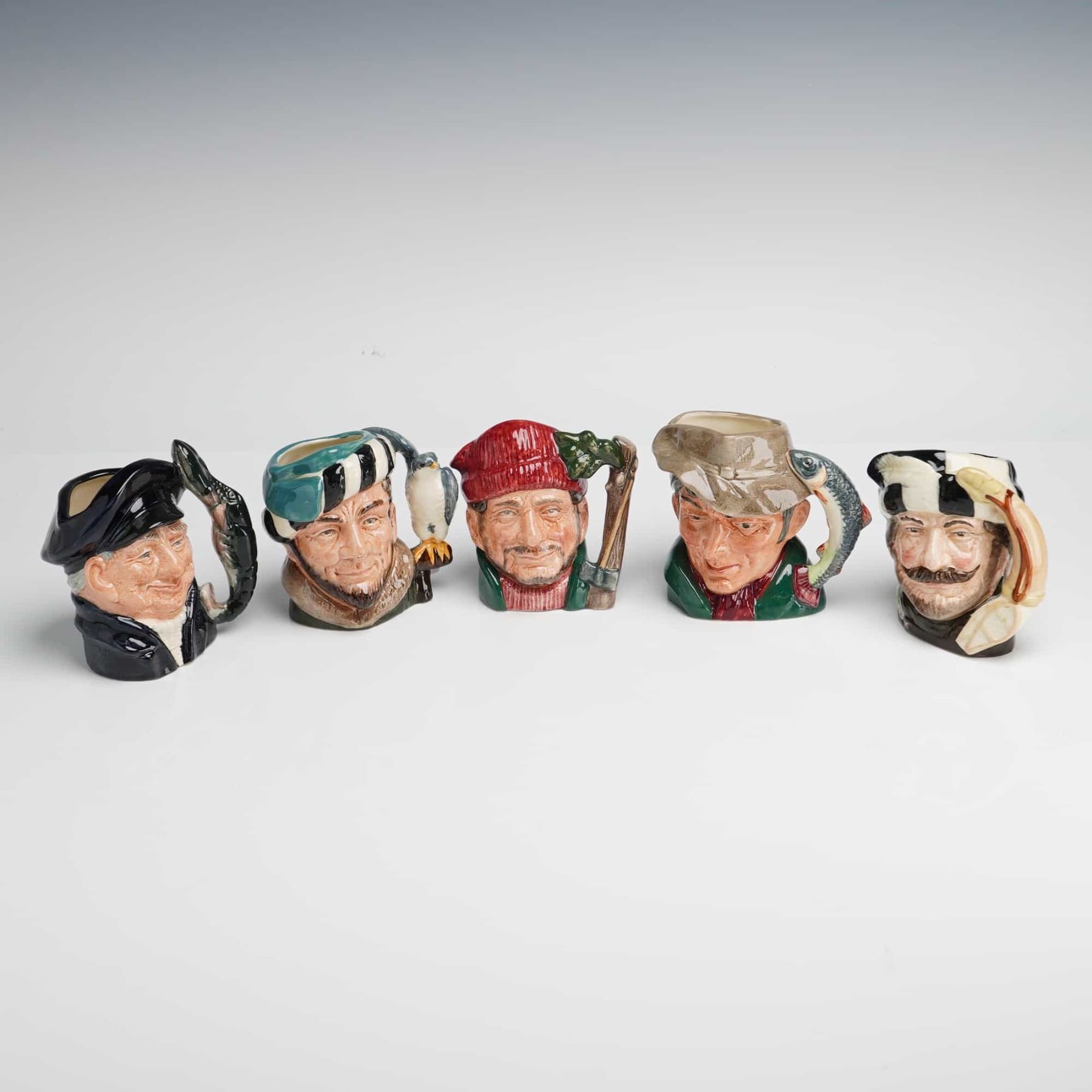 A set of five Royal Doulton miniature character jugs, including model numbers D6613, D6464, D6540, D6612, and D6620. These ceramic pieces are hand-painted and finished with a high-gloss glaze. The collection features the subjects The Falconer, The Lumberjack, The Poacher, Trapper, and Lobster Man. Each jug includes a specialized handle corresponding to the theme, such as a falcon, axe, fish, or animal pelt. All items bear the Royal Doulton lion and crown backstamp on the base, indicating manufacture in England.