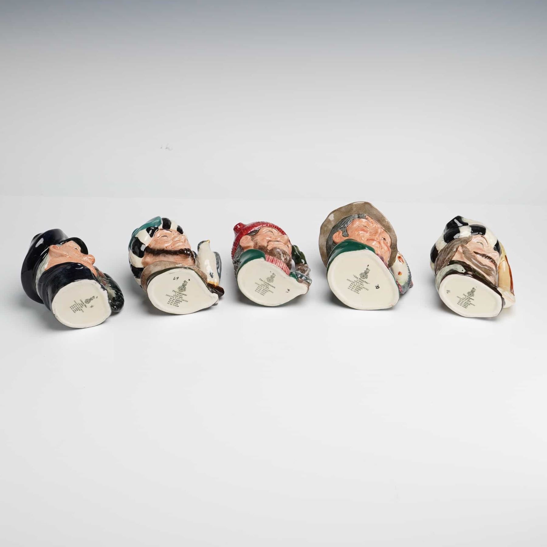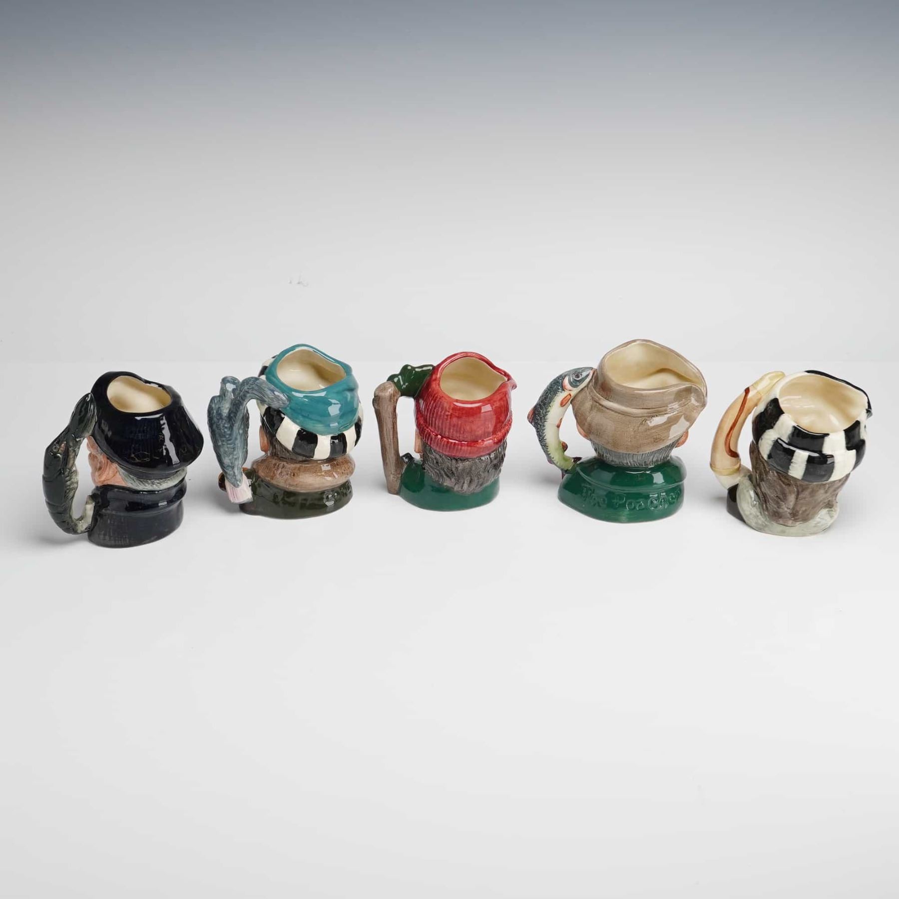 Lot 253 5pc Royal Doulton Character Jugs, Lobster Man, The Falconer, The Lumberjack, The Poacher, and The Tr