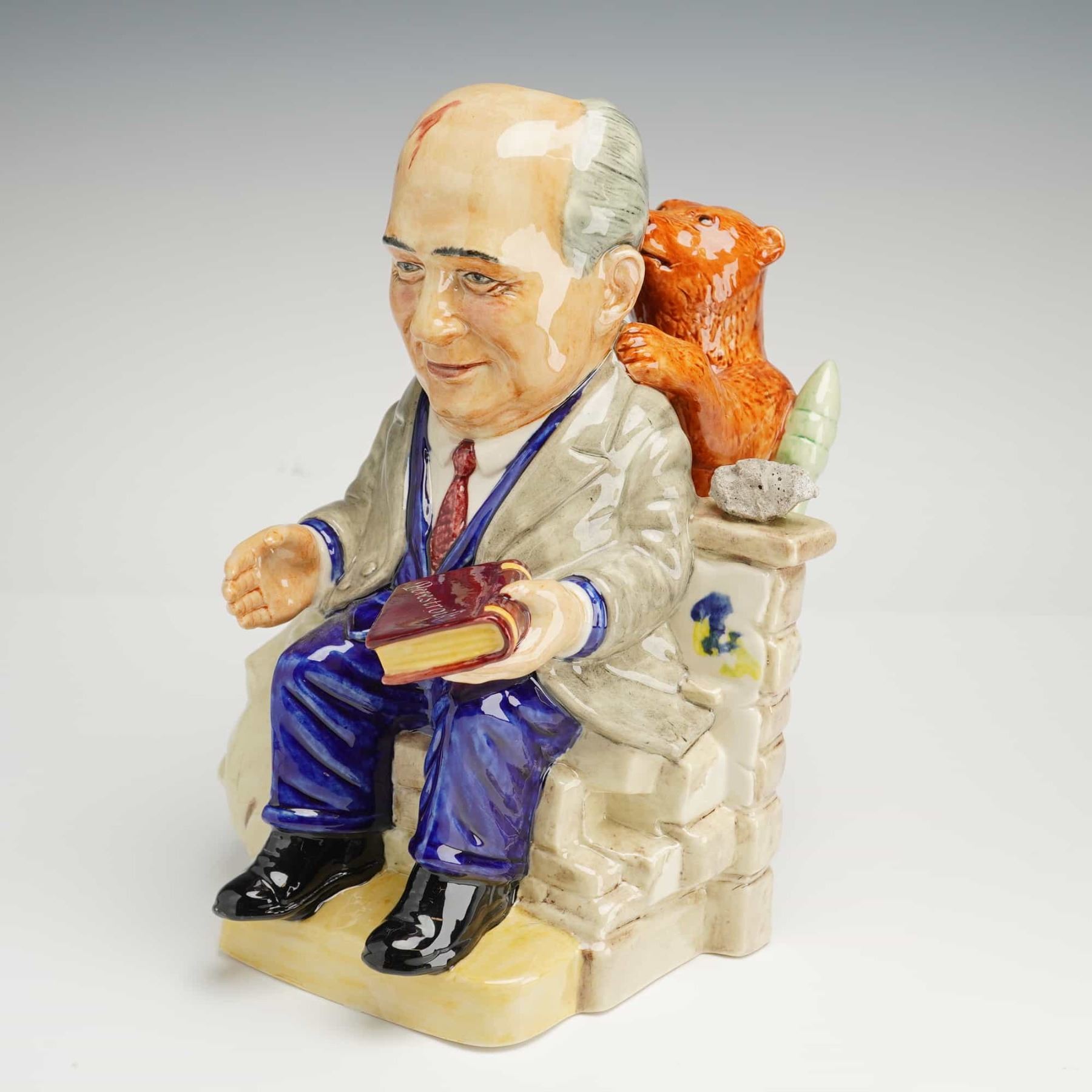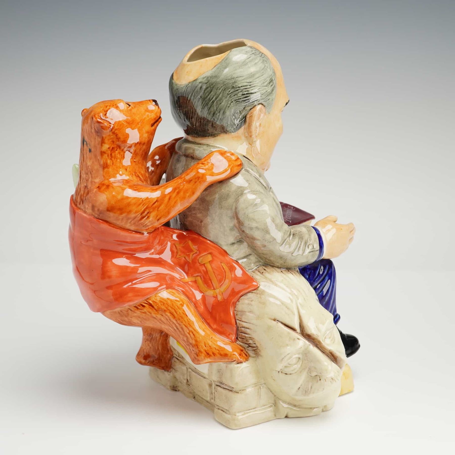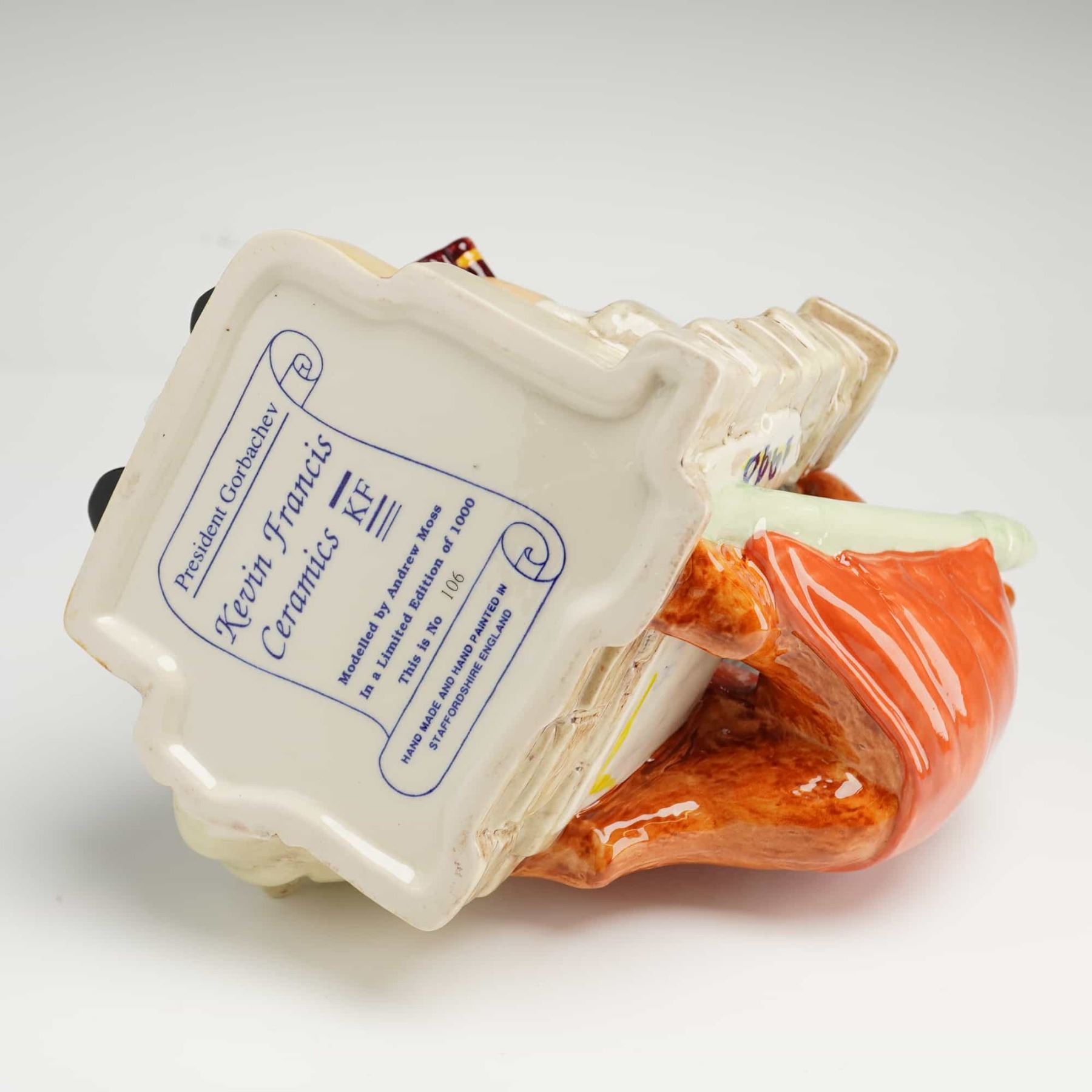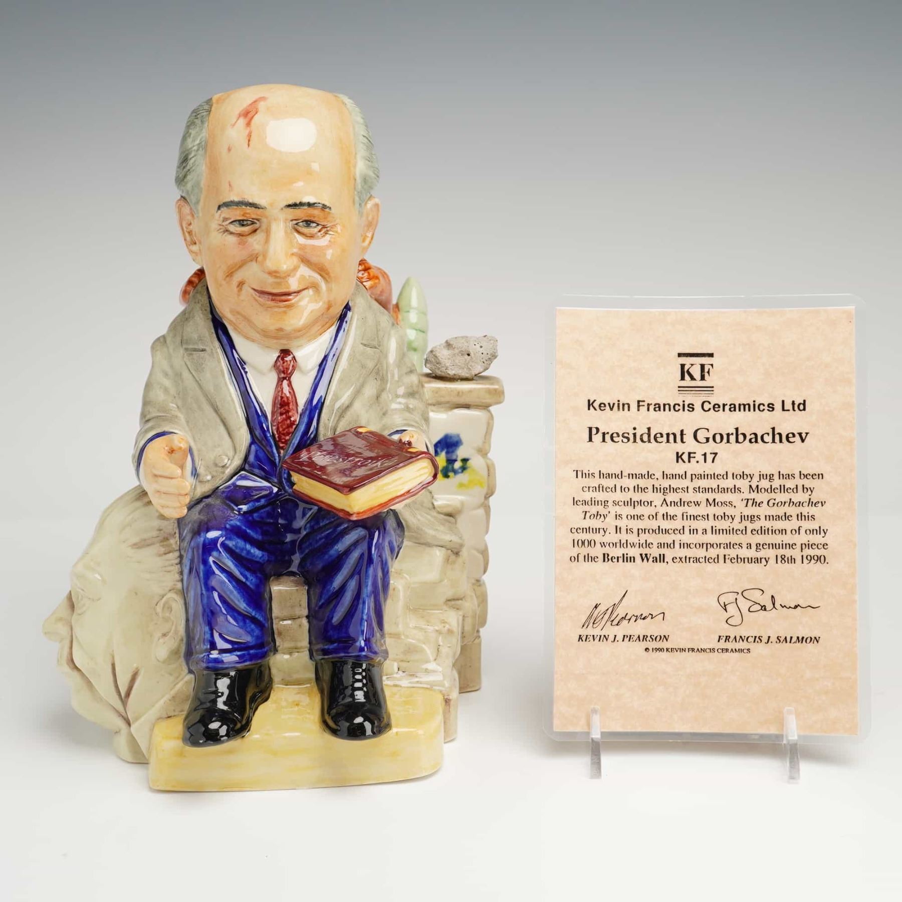 This Kevin Francis Ceramics character Toby jug, titled President Gorbachev, was modeled by Andrew Moss and produced in Staffordshire, England, in 1990. The hand-painted glazed ceramic figure depicts the former Soviet leader seated upon a section of the Berlin Wall. He is shown holding a book titled Perestroika, while a brown bear draped in a Soviet flag featuring the hammer and sickle is positioned behind his shoulder. A notable feature of this edition is a genuine stone fragment from the Berlin Wall mounted on the wall ledge, which the included documentation states was extracted on February 18, 1990. The underside of the piece bears the manufacturer backstamp and identifies this as number 106 from a limited edition of 1000. This Kevin Francis Toby Jug with COA serves as a commemorative historical object.