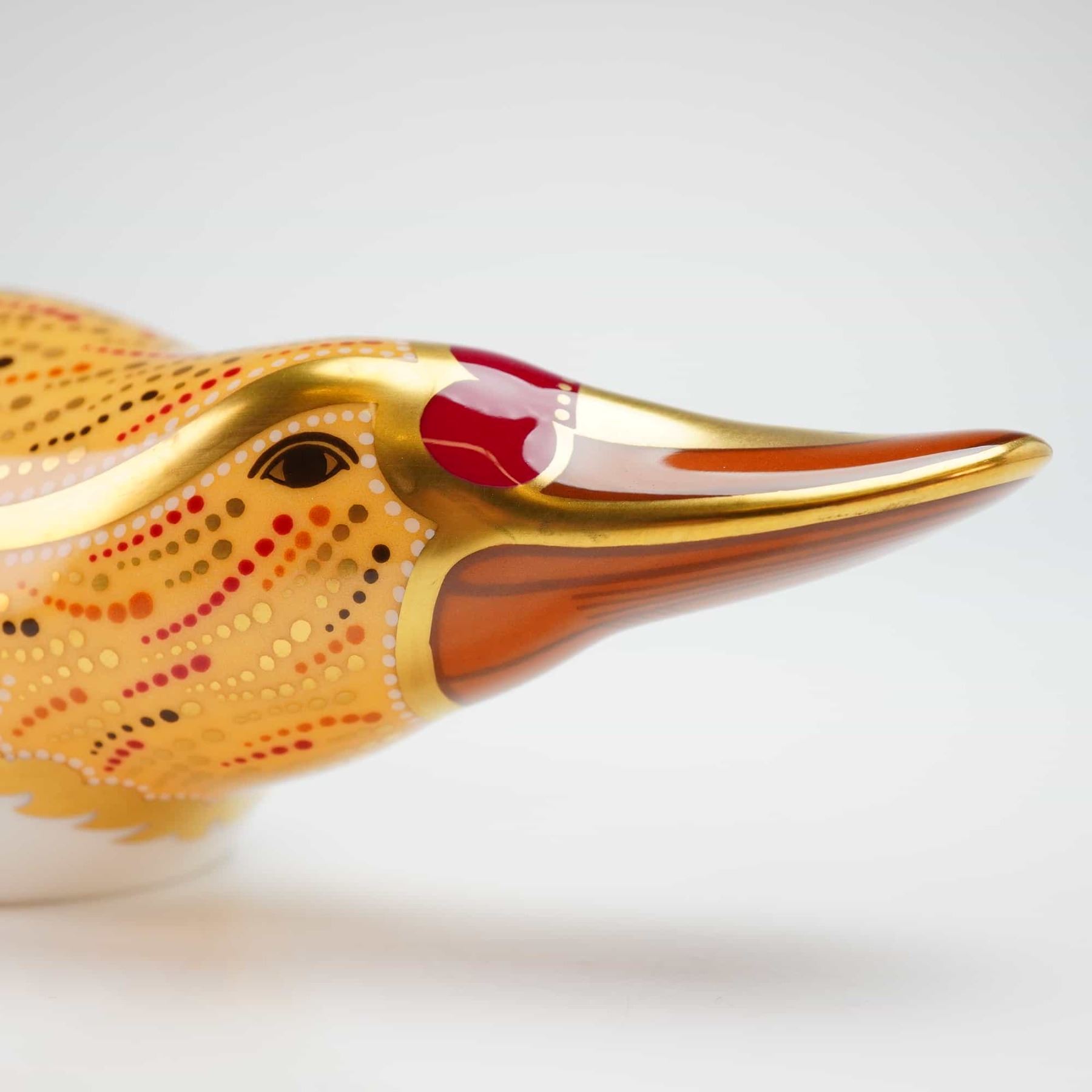 A Royal Crown Derby from The Australian Collection. The figurine is decorated with a stylized pattern of multicolored dots in red, orange, yellow, and black, accented with gold gilding. The underside features the official Royal Crown Derby backstamp, the collection title, a 1999 copyright date, and the signature of artist John Ablitt. A recessed gold-tone metal stopper is present in the base. The item is accompanied by its original branded blue and gold presentation box.